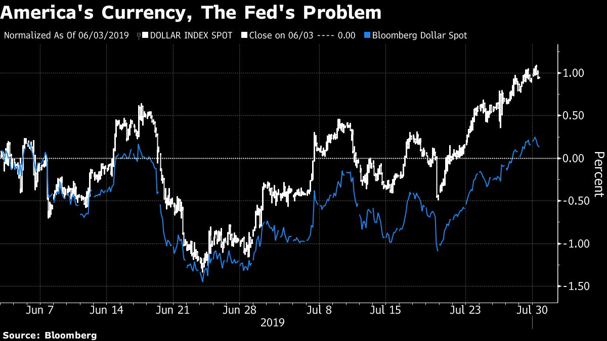Pound adds to losses, massive day for earnings and trade talks begin. Sterling performance The British pound dropped below $1.2200 overnight and was trading at $1.2185 by 5:45 a.m. Eastern Time as investors pushed the currency toward its worst run of losses in almost three years due to rising no-deal Brexit concerns. Prime Minister Boris Johnson's office said that he will spend the next few weeks trying to get the European Union to renegotiate the current exit deal, while also preparing to leave the bloc in case he fails. The one silver lining to the collapse in the pound is that the FTSE 100 Index continues to climb as the long established inverse relationship between the two still holds. Apple, BPApple Inc. reports earnings after the bell today, with investors expecting a slump in iPhone sales, while hoping other product sectors will boost performance. Earlier, Huawei Technologies Co. showed it was withstanding U.S. efforts to curb its business by reported a 23% rise in revenue in the first half of the year. BP Plc beat expectations with adjusted net income of $2.81 billion in the second quarter, results which spurred shares to rise as much as 3.4% in London trading. Trade talksU.S. delegates including Treasury Secretary Steven Mnuchin and Trade Representative Robert Lighthizer are in Shanghai for meetings with their Chinese counterparts, with both sides expected to dine together today before spending tomorrow in talks. Hopes remain low for a breakthrough as neither side seems eager to make a deal. Lighthizer, meanwhile, has found what might be an easier trade partner to target for their large surplus with the U.S. Markets mixedOvernight the MSCI Asia Pacific Index climbed 0.3% while Japan's Topix index closed 0.5% higher after the Bank of Japan held its monetary policy unchanged. In Europe, the Stoxx 600 Index was 0.8% lower at 5:45 a.m. as disappointing corporate results weighed on the regional gauge. S&P 500 futures pointed to a drop at the open, the 10-year Treasury yield was at 2.053% and gold was slightly higher. Coming up…Household income and spending data is expected to show a slowdown in June when the numbers are published at 8:30 a.m. The PCE deflator is expected to hold unchanged at 1.5%, with a rise in the core reading to 1.7% when it is released at the same time. Pending home sales for June and consumer confidence for July are both published at 10:00 a.m. The Fed's two-day policy meeting begins in Washington and there is a Democratic presidential candidate debate in Detroit later. What we've been readingThis is what's caught our eye over the last 24 hours. And finally, here's what Luke's interested in this morningIf you look at the stock market, a Fed rate cut tomorrow sure seems priced in. Bond market? At least 25 basis points of easing is still in the cards. But for a central bank that's lowering rates because of softness abroad which threatens to reach domestic shores -- and harbours hopes of generating some "opportunistic reflation" to buoy inflation expectations -- there's a big variable that's not cooperating. It's the dollar. Since Chair Jay Powell entrenched expectations of an ease with his early June commitment to "act as appropriate" to sustain the expansion, the Dollar Spot Index (which is primarily geared towards developed-market currencies) is up nearly 1 percent. The broader, more balanced Bloomberg U.S. dollar basket is marginally higher. It's tough to see how a stronger dollar is positive for global activity at this juncture, as the negative effects through financial channels likely outweigh any benefits to net exports outside the U.S. Certainly, the first-order effect of a stronger greenback is to soften inflation, all else equal. A stronger dollar simply doesn't help what ails U.S. activity, either. The "sources of weakness in the national accounts are actually very similar to 1998-1999!" notes Skanda Amarnath, director of research and analysis at Employ America, commenting on last week's GDP data. "Fed tells you it's worried about the effects of global growth and business uncertainty. Latest data showed that business fixed investment and export growth seriously weakened." While seemingly everyone fears another major central bank disappointment on the heels of Draghi's presser last week, perhaps the knowledge that the market isn't completely cooperating with the Fed's plans will steel Powell's resolve to ensure an outcome that's perceived as dovish throughout the cross-asset spectrum.  Like Bloomberg's Five Things? Subscribe for unlimited access to trusted, data-based journalism in 120 countries around the world and gain expert analysis from exclusive daily newsletters, The Bloomberg Open and The Bloomberg Close. Before it's here, it's on the Bloomberg Terminal. Find out more about how the Terminal delivers information and analysis that financial professionals can't find anywhere else. Learn more. |