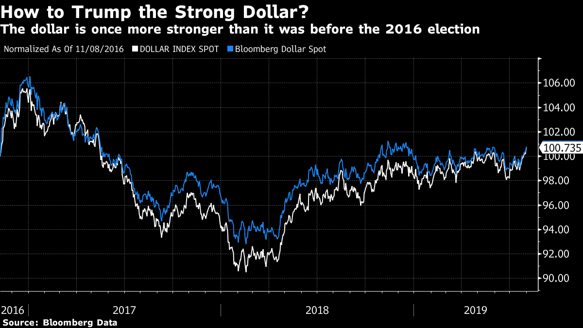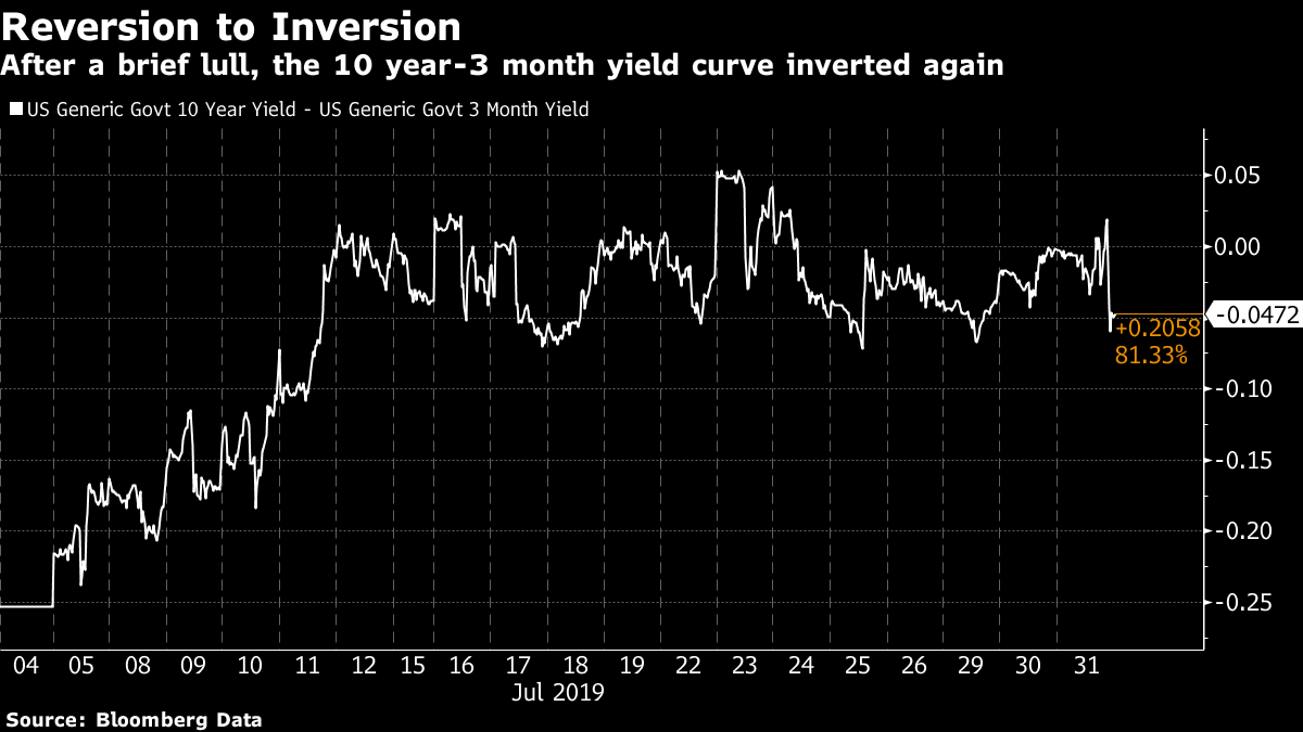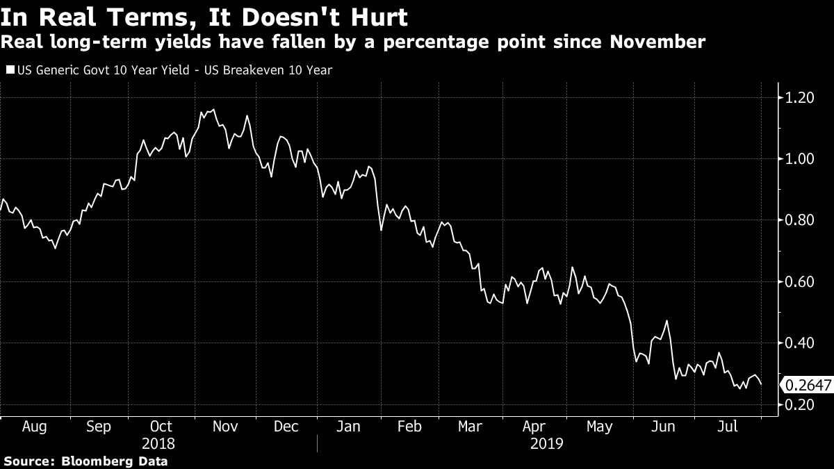Against this, the FOMC staged a mild surprise by announcing that it would halt quantitative tightening – selling off bonds it previously bought in quantitative easing purchases – in August, rather than in September as originally scheduled. But the package as a whole was plainly meant to show that the Fed was cutting with reluctance and prudence, and not with any sense that a major recession was in the offing, or that many more cuts would be needed. As the economy is in strong shape, this seems eminently reasonable. Given the way investors were positioned, the Fed effectively had no choice but to produce a cut. To do otherwise would have risked a major tantrum. The cut was about as grudging as policy makers could make it. Some claimed that Powell's later assertion that further cuts were still possible was a backtrack or even a U-turn from his original assertion that he was involved in a "mid-cycle correction." I think that this is unfair. We will use the history of the Fed in the post-Paul Volcker era as a guide. A look at the federal funds target rate since Alan Greenspan took over in 1987 reveals that every time the Fed has changed direction, and started hiking after a period of cuts or vice versa, its next move has always been in the same direction. There have been mid-cycle adjustments before, but they have never involved a "one-and-done" cut. To be clear, there is one example of a "one-and-done" hike, from early 1997, which I have ringed on the chart. That was known at the time as the "Irrational Exuberance" hike, when Greenspan followed up on his warning of incipient stock market bubbles and raised rates, provoking a 10% decline in the stock market. On that occasion, the next move was down, after the Long-Term Capital Markets disaster of the following year. But the whole incident is now regarded as an egregious policy mistake, when the Fed started to try to stop the bubble from inflating but then lost its nerve – so the precedent again suggests that Powell's mid-cycle adjustment likely involves at least two 25 basis point cuts. So there is a consistent message, which is that the Fed is not obligated to cut further and may not have embarked on any major campaign of cuts to avert a recession, but will probably cut at least once more before it is done. There is ample room to argue about whether it is on the right path. For now, look briefly at the reaction of markets, which had been set up for a campaign of rate cuts previously only seen at the onset of a recession, while not positioning for the recession – a strange combination to put it mildly. The operative markets here are in foreign-exchange and bonds. Stocks are at near-record highs and no self-respecting central banker should give a hoot about pushing their value down. But the level of the dollar has become important with the trade conflict, while bond markets suggest dangerous extremes of valuation that must be handled with extreme care. Treasuries saw their short-term yields rise and long-term yields fall in the sharpest flattening of the yield curve since before President Donald Trump took office. As a flat or inverted yield curve generally suggests that the Fed is too tight in the present, that is a good clue that the market is trying to pressure the Fed to continue its cutting. In the case of the gap between 3-month and 10-year yields, we returned to a full inversion, in what is generally regarded as a clear signal that a recession is coming. Meanwhile, the dollar gained on all fronts. This is the single greatest problem for the Fed at present, and probably the most valid reason for the annoyance of a president who is trying to put pressure on U.S. trading partners. And, indeed, the Fed implicitly admits that this is one of the main reasons for cutting rates: As for the tightness of financial conditions, if we define this as real long-term rates, subtracting long-term inflation break-even rates from long-term yields, we find that the Fed has not done anything to undo the radical loosening of the last year. This is the performance of real 10-year yields over the last 12 months: That suggests the Fed got the balance right on Wednesday - so far. For the immediate future, the greatest causes for concern would be a continued rally for the dollar, or an accident in the bond market as yields rose significantly higher. Both would create great problems across the world. And it would be handy for Powell and the Fed, if the U.S. economic data, starting with unemployment numbers later this week, stayed strong – while many in markets will be rooting for poor numbers that would force the Fed to cut.