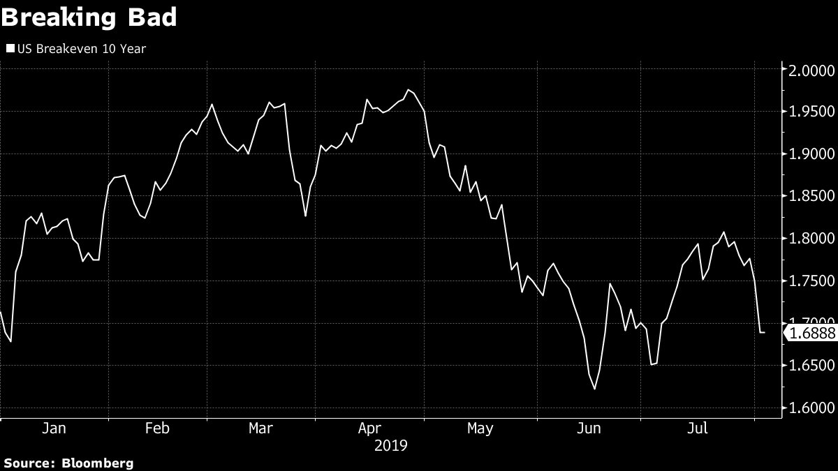 Still, there's puzzles abound for curve traders. Does a trade war put the zero lower bound within reach? The fed funds futures curve doesn't point to policy rates sinking below 1% yet, so a meaningful bull steepener would require traders placing some odds on the central bank having to slash rates close to the bone. And when, if ever, will breakevens treat the trade war as inflationary? Market-based measures of inflation compensation tumbled, along with oil, as Trump's tweet landed.