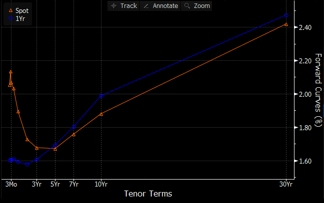 Steepening is still the default outlook, judging by the forward curve. It's sending Pollyanna signals, pointing to a front end that's poised to fall while the longer end rises over the next year.