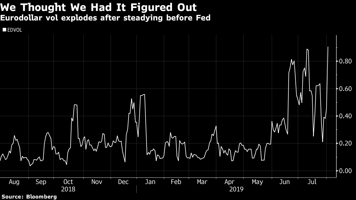 Five-day front-month Eurodollar price volatility climbed to its highest level since 2010. Front-end vols had been on the verge of un-inverted relative to their longer-dated peers, and quickly spiked again. A fully-fledged trade war was a tail risk; this latest evolution means investors have been forced to attach higher odds to tail-risk scenarios.