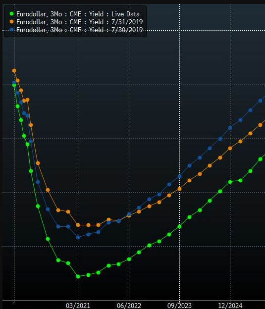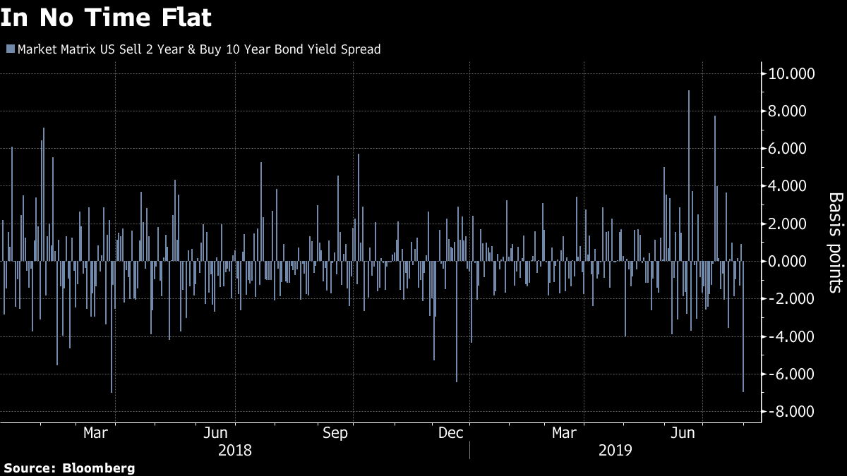 Yields tumbled, as did stocks. There was a slight steepening in 2s10s, but the biggest downward move in the three-month, 10-year spread in over a year. Translation: thanks to an escalating trade war, the easing cycle will be deeper – but not longer – than investors previously thought. Three cuts for full-year 2019 is now the modal scenario.