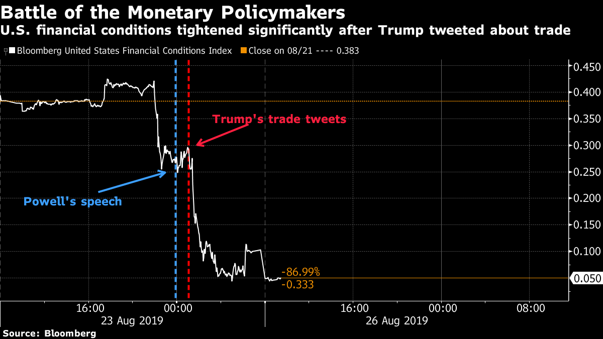 | U.S. futures sink and havens rally as trade war deepens, Trump regrets not slapping higher tariffs on China, and Hong Kong's protests take a more serious turn. Here's what's moving markets. Market Turmoil The yen climbed and stocks were headed for steep losses in Asia after the U.S.-China trade war ratcheted up. S&P 500 Index futures tanked more than 1% while contracts indicated losses of more than 2% in Tokyo and Hong Kong. The yuan retreated. U.S. stocks slumped on Friday and Treasuries rallied amid the trade chaos. On the data docket this week, the U.S. releases GDP and durable goods reports that may show how tariffs on Chinese imports are affecting the economy. Hong Kong trade is also due Monday and likely to show a plunge in exports in July amid the trade war and weaker Chinese and global demand. Tuesday brings China industrial profits. There's a Bank of Korea rate decision on Friday, as well as Hong Kong retail sales. Trump's Trade Regrets Donald Trump acknowledged having second thoughts on escalating the trade war with China at the Group of Seven summit in France — only for his top spokeswoman to later say he meant he regretted not raising tariffs even more. White House Press Secretary Stephanie Grisham now says the media misinterpreted the U.S. president's initial remarks. Trump doesn't regret starting a trade war but he does have second thoughts on whether he should have hit the Chinese even harder. On Friday, Trump bumped existing levies to 30% from 25% and planned duties to 15% from 10%. China said it will follow through with tariffs on $75 billion of U.S. goods and vowed to fight the trade war to the end as it prepares for the worst. Meanwhile, two top White House officials said Trump has the authority to force American companies to leave China — as he claims, and which trade experts question -- yet whether he invokes those powers is a another question. Hong Kong Tensions Escalate Tensions flared again in Hong Kong as an effort to form a peaceful human chain across the city culminated in police clashes that led to the firing of a weapon and the deployment of water cannons for the first time. In the 12th weekend of disturbances, police and protesters were involved in several violent clashes in the New Territories district. On Saturday, Hong Kong Chief Executive Carrie Lam held a meeting with former officials and other prominent people to find a way out of the impasse that has rocked the former British colony. Meanwhile, China signaled it may send troops into Hong Kong. Some Trade Cheer: U.S. , Japan May Have a Deal The U.S. and Japan agreed in principle on a trade deal under which Japan will slash tariffs on U.S. beef, pork and other agricultural products, while continuing to face levies on its own auto exports. Announcing the deal Sunday, Trump also said Japan would purchase large quantities of U.S. wheat and corn. Japanese officials may consider that a good deal if they can elicit a promise in return that its automakers will be shielded from Trump's threat of more painful tariffs. The U.S. president and Japanese Prime Minister Shinzo Abe announced the agreement Sunday in Biarritz, France, at the G7 summit following a bilateral meeting. Meanwhile, at Jackson Hole Central bankers who attended this year's policy symposium in Jackson Hole, Wyoming, have a lot to mull over as they head home from their annual retreat. Hosted by the Kansas City Federal Reserve Bank, this year's conference examined the timely issue of challenges facing monetary policy as officials confront slowing global growth stemming from uncertainty over trade policy. One takeaway: Trump's trade shocks risk recession central banks can't prevent. With the gathering under way, Trump not only escalated the pressure on China, he also pondered on Twitter whether Fed Chairman Jerome Powell was perhaps a bigger "enemy" than Chinese President Xi Jinping. What We've Been Reading This is what's caught our eye over the weekend. And finally, here's what Tracy's interested in this morning We've talked before in this space about how Trump's use of tariffs has similar effects to monetary policy. When he ups his trade threats, U.S. financial conditions tighten (and it's then left to the Federal Reserve to decide whether it should loosen them again). That dynamic was on full display yet again on Friday, when the world's central bankers met at their annual Jackson Hole gathering. For a reminder of just how much monetary power Trump now wields, check out this quote from Bloomberg's summary of the past few days. "When Powell was giving his speech, I could see everybody on their iPhones, refreshing Twitter, waiting for the tweet from Trump," said Robert Eggertsson, a former New York Fed economist. "The most powerful central bankers in the world, all in the same room, would — rather than listen to Powell, they're checking on Twitter waiting for when Trump is going to tweet." You can see the impact of a relatively dovish Jackson Hole speech from Fed chair Jerome Powell followed by a series of Trump tweets in the intraday move of U.S. financial conditions on Friday. Financial conditions hovered (and loosened very slightly) when Powell spoke in Wyoming. Then they tightened significantly when Trump starting tweeting about trade. In the battle of monetary policymakers (Powell vs. Trump) it seems like the unofficial central banker is winning out. You can follow Bloomberg's Tracy Alloway at @tracyalloway. The best in-depth reporting from Asia Pacific and beyond, delivered to your inbox every Friday. Sign up here for The Reading List, a new weekly email coming soon. Before it's here, it's on the Bloomberg Terminal. Find out more about how the Terminal delivers information and analysis that financial professionals can't find anywhere else. Learn more. |