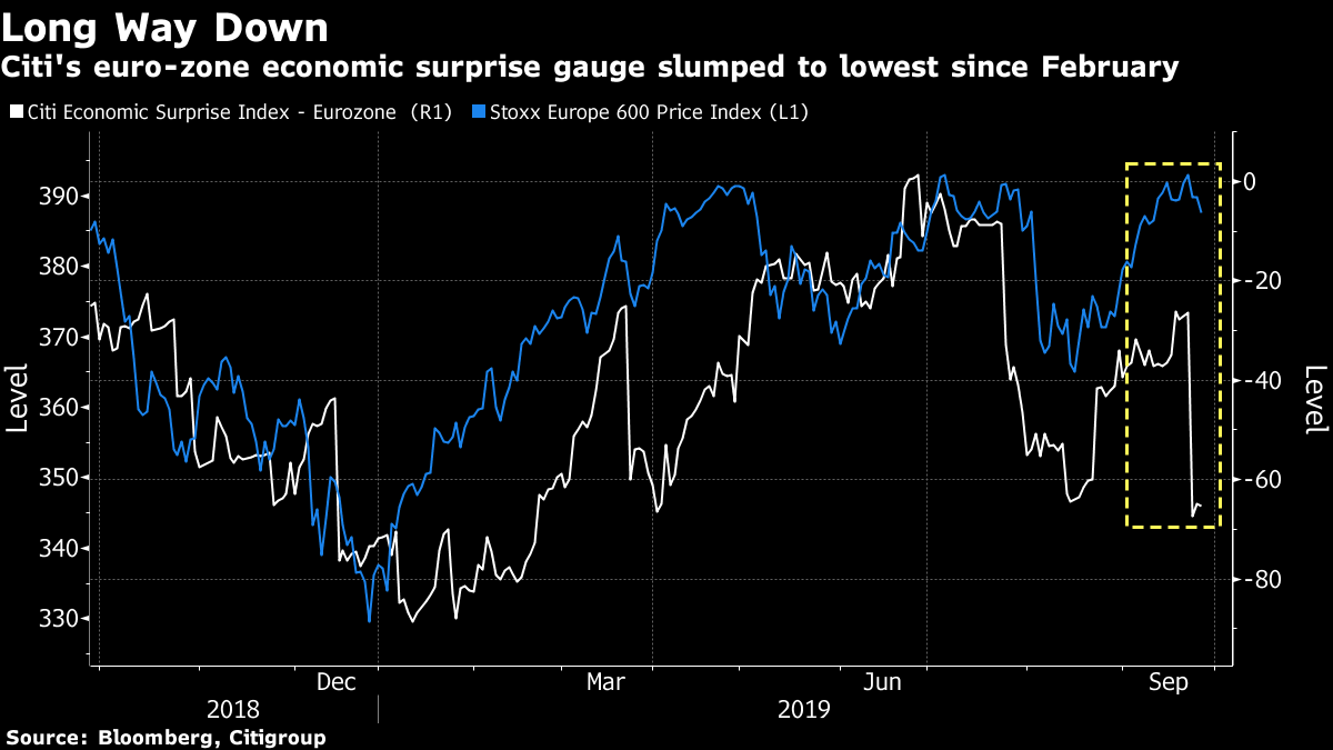 | Welcome to your morning markets update, delivered every weekday before the European open. We're looking for your feedback to help improve this newsletter. Please follow this link to our survey, which will only take a few minutes. Good morning. The revelations keep coming around Donald Trump's Ukraine call, the U.K. and EU negotiation teams meet again and the doves are ruling the roost at the European Central Bank. Here's what's moving markets. 'Perfect' Call The call between U.S. President Donald Trump and Ukraine President Volodymyr Zelenskiy is dominating conversation in Washington and there's no reason to think that'll change any time soon. The whistleblower's complaint which has brought the call to light claims White House officials tried to "lock down" the details of an interaction Trump has now called "perfect" on a couple of occasions in addition to attacking the whistleblower in a private meeting caught on tape. As Democrats push forward with a formal impeachment inquiry, markets will have to continue to decide how to process it. 'Lance the Boil' U.K. Brexit Secretary Steve Barclay and European Union chief negotiator Michel Barnier will meet in Brussels with the hope that some progress can be made towards agreeing to an exit deal as British lawmakers continue to squabble. U.K. Prime Minister Boris Johnson, still defiant following the historic court defeat his government suffered this week, is sticking to the view that getting Brexit done will "lance the boil" which has been characterized by an atmosphere in the House of Commons that the speaker had to condemn. The meeting will also take place amid a prediction that a no-deal Brexit would most likely result in a 2020 recession. Doves in Charge European Central Bank Chief Economist Philip Lane says he thinks there remains room for the bank to cut rates again and said the stimulus program which has split policymakers was "not such a big package." Very dovish words, particularly after the surprise resignation of one of the more hawkish members of the board and likely to encourage bond investors enjoying the rally. There could even be signs that Germany is starting to come around to the idea that it may have to loosen the budget purse strings in the face of urging from the ECB to support monetary easing with fiscal stimulus. Damage to Both Sides The boss of plane maker Airbus SE has said the escalating battle between the U.S. and European Union over aircraft subsidies threatens to do damage to both sides, a common refrain from many onlookers throughout the trade war. Where damage appears to have been swerved however is in the continued opening up of China's financial system, with Wall Street titans showing no signs of a slowdown in meetings with top regulators to capitalize as the country opens its doors. Where the trade war is hitting is for Chinese companies, where August profits fell and demonstrated the impact the tensions are having. Coming Up... Japanese stocks took a beating from a swathe of ex-dividend names on Friday, but overall Asia trading was broadly mixed and European and U.S. stock futures are providing little clue to direction. Watch for any impact on the European tech sector from results released by Micron Technology Inc., the U.S. chipmaker, which released a disappointing forecast and warned on the impact of trade tensions. Euro area consumer confidence, Italian business and consumer sentiment and U.S. personal spending data will all be released. What We've Been Reading This is what's caught our eye over the past 24 hours. And finally, here's what Cormac Mullen is interested in this morning While U.S. stock bulls are enjoying an encouraging backdrop of positive economic surprises, their European counterparts are stuck with exactly the opposite. Citigroup Inc.'s economic surprise index for the euro zone, a gauge of whether economic data beats or falls short of analyst expectations, plunged to its lowest level since February on Monday after a slew of disappointing readings. Europe's benchmark Stoxx 600 Index has had a reasonable correlation with the gauge over the last 12 months, suggesting stocks may come under pressure if economic data doesn't start surprising to the upside. Further signs of weakening sentiment came Tuesday, with business expectations this month in Germany falling to the lowest in a decade. The mood among factory executives was the main reason, with the Ifo institute, which compiles the sentiment report, saying the only direction was "downward." The news is another blow to Europe's largest economy after a report Monday showed factory activity is shrinking at the fastest pace since the depths of the financial crisis. With the benchmark Stoxx 600 Index still sitting on a year-to-date gain of over 15%, it wouldn't be surprising for the deepening gloom to soon translate to profit taking. Cormac Mullen is a cross-asset reporter and editor for Bloomberg News in Tokyo. Like Bloomberg's Five Things? Subscribe for unlimited access to trusted, data-based journalism in 120 countries around the world and gain expert analysis from exclusive daily newsletters, The Bloomberg Open and The Bloomberg Close. Before it's here, it's on the Bloomberg Terminal. Find out more about how the Terminal delivers information and analysis that financial professionals can't find anywhere else. Learn more. |