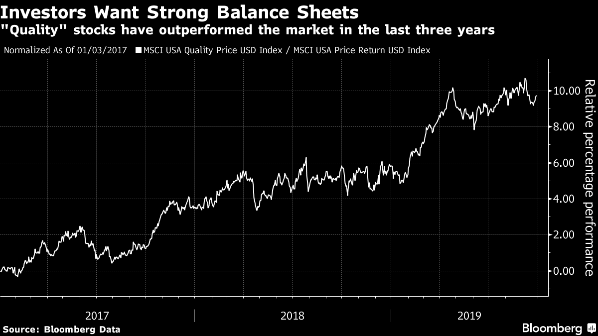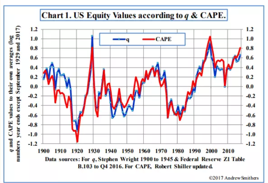 Markets should mind their p/es and qs In the very long term, stocks are driven by fundamentals – economic growth, earnings, and assets. That is why valuations comparing share prices to various slowly changing trackers of fundamentals are taken seriously by asset allocators. But what happens when we revise the fundamentals? And how can fundamentals even be measured in an era where assets tend to be ever less tangible, and to be tied up instead in more nebulous qualities such as intellectual property and brands? That issue now confronts the measure known as Tobin's q – a concept coined by the Yale University Nobel laureate economist James Tobin which refers to the ratio of a company's market value to the replacement value of its assets. Over history, the London-based economist and asset manager Andrew Smithers, author of the classic tomes Valuing Wall Street and Wall Street Re-valued, has shown that q is the most effective long-term valuation metric, followed by the cyclically adjusted price/earnings multiple (CAPE) now widely associated with another Yale Nobel laureate, Robert Shiller. Neither measure is of any use for timing, but they both do a great job of predicting subsequent returns over 10 years or longer. In this chart "hindsight" (the blue line) indicates what returns actually were generated over the next 30 years from each date, while the other lines show the predictions generated using q and CAPE: Both are startlingly accurate, but q has worked better. This may well be because CAPE relies on numbers produced under accruals accounting, which might be systematically distorted. But recently, the National Income and Product Account (NIPA) numbers that make up the denominator in q, produced by the Bureau of Economic Analysis as part of the national GDP numbers, received a drastic revision. This is Smithers' summary of the main changes: The result is to reduce U.S. non-financial companies' net worth by 58%. The lower denominator means that q now shows the stock market to be more overvalued compared to history than CAPE does. This is Smithers' chart incorporating the revisions: And this is the same chart, produced by Smithers in 2017 before the revisions came into effect. At this point, CAPE showed a more serious overvaluation than q did: If you feel bearish, this implies that U.S. stocks are even more overvalued than we thought. By Smithers' calculations, non-financial companies were overvalued by 88% according to q at the end of the second quarter before the revisions. Post-revision, that number rose to 167% overvaluation. If you feel bullish, however, the fact that the denominator can be so widely revised raises questions over its usefulness. The historical record of q as a great indicator brooks little argument; and the BEA statisticians are trying to keep up with the changing nature of assets. It would be unwise to ignore the warning signal from a high q. But it is not a finely tuned measure. And everyone should mind their debt A nasty implication of the NIPA revisions is that U.S. companies are far more leveraged than they previously appeared. This chart, from Smithers, shows gross and net debt as a proportion of net worth under the previous numbers, and under the revisions. Suddenly leverage appears to have returned almost to its post-war high set during the dotcom bubble. That is alarming. And it has, indeed, caused alarm. One finding of the Bank of America Merrill Lynch fund manager survey, which I covered yesterday, is that investors have changed their preference on how companies should use cash flow. Throughout the post-crisis years, they have wanted more capital expenditures or cash distributions to shareholders. In the last 12 months, this has been replaced by an ardent desire for companies to clean up their balance sheets: An analogue to the rising concern about leverage can be seen in the strong outperformance of quality stocks over the last two years. The "quality" criteria generally include a clean balance sheet. This is how MSCI's U.S. quality index has performed compared to the main market over the last three years: But while credit concerns show up in the relative performance of stocks, they do not show up in high-yield credit itself. The Bloomberg index for Ba- and B-rated debt has roughly kept pace with small-cap equities over the last three years: In practice, leverage is a concern for a significant but outnumbered minority of investors at present. According to Absolute Strategy Research's regular poll, about 16% of big investors make up a Credit Risk group that "does not expect inflation to slow but instead sees credit underperforming. This credit risk leads them to expect equities to de-rate on falling earnings and see a bear market as quite likely." These investors believe there is safety in emerging markets (in an inflationary environment), and also trust gold.
