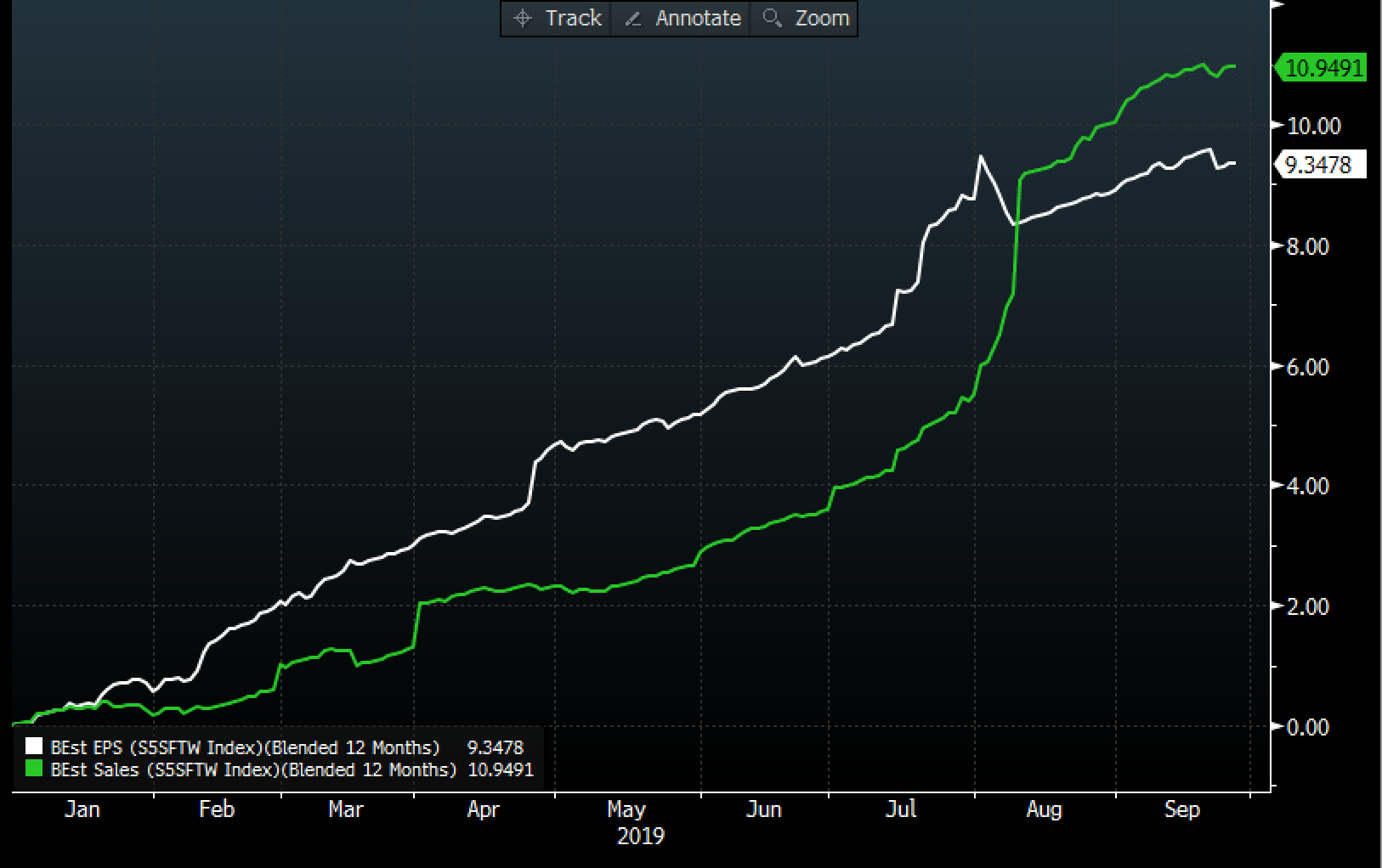 As such, it was particularly encouraging to see software stocks (as judged by the IGV ETF) bounce off their 200-day moving average on Wednesday – a session in which yields rose – to reverse substantial losses and ultimately outperform the benchmark gauge. If software (which happens to be the biggest industry group in the S&P 500) falters, it's difficult for the rest of the market to provide a sufficient offset. Especially as this segment of the market has seen earnings estimates buck the market trend and push ever higher.