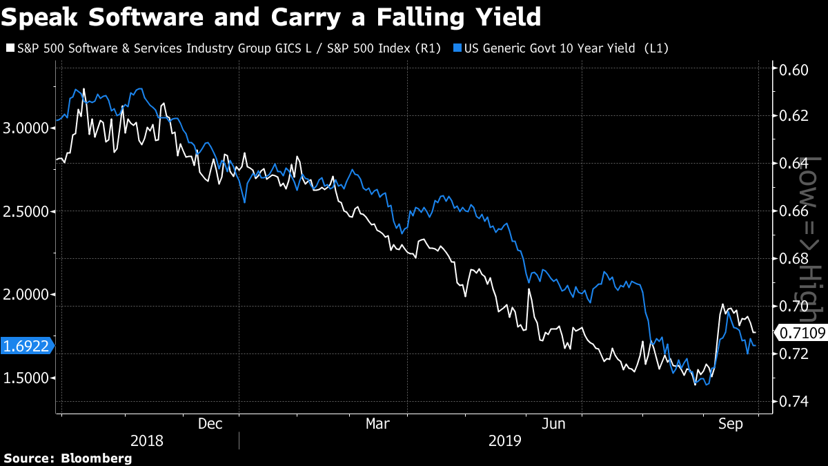 For software stocks – the most important contributors to the bull run – it's striking how much relative performance over the past year has been linked to bond-market dynamics. The thinking here is that falling yields reflect concern about future global activity, so stocks that have shown a structurally superior earnings profile (growth stocks, like software) are prized. Note the inverted axis for relative equity performance!