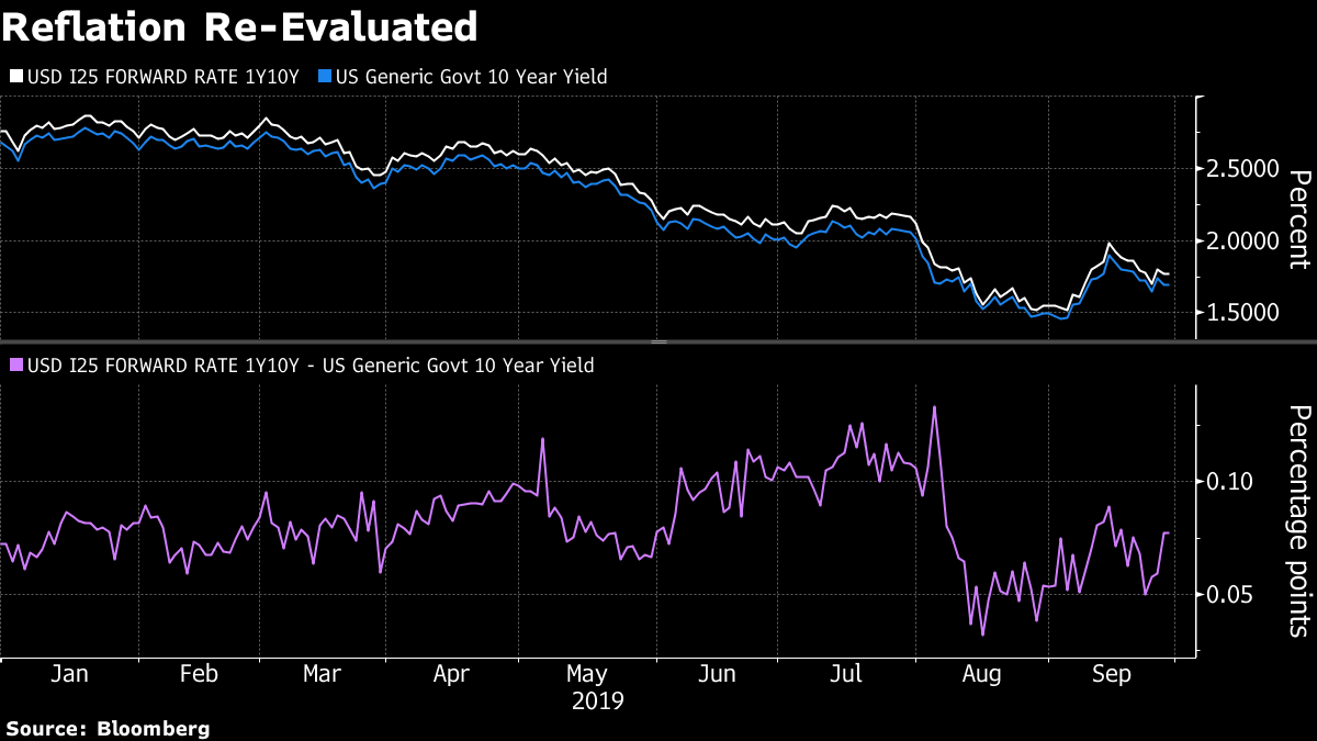 Why August as a demarcation line? Well, it's when the 10-year yield cracked below 2% on the heels of the Federal Reserve's commencement of an easing cycle. It's also when investors began to really throw in the towel on the prospect for reflation over the next year, judging by the slimming spread between 10-year yields and the 10-year, one-year forward rate.
