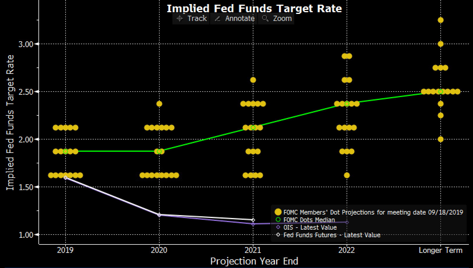 Why does this matter? Well, first let's do an as-vague-as-possible mapping out of the dot plot for the rest of the year to try to infer the likely Fed outcomes if financial conditions don't change too much, economic activity unfolds roughly according to plan, and trade tensions are neither heightened nor lowered.