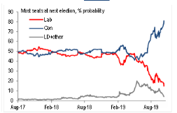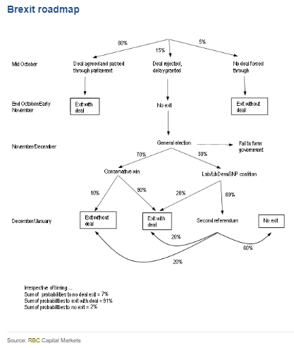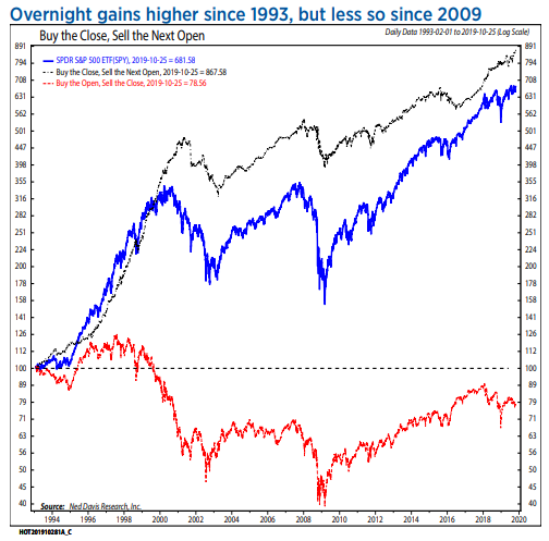 Boris the Bold Becomes Boris the Reckless Brexit isn't going to be happening on Halloween (that is, tomorrow). Neither will it happen next month or, it is now virtually certain, this year. Instead, followers of British politics will get to watch a general election on Dec. 12. As at least four different Brexit policies will be on offer from at least four viable political parties, and the British electoral system can easily produce perverse results, the bottom line is that the situation has just grown far more uncertain. That must be the bottom line for investors, which can be illustrated with this flow chart produced by RBC Capital Markets last week. For those lucky enough not to be living and breathing this subject, this was the day when the prime minister brought the exit deal he had reached with the rest of the European Union to parliament, and won an initial approval. (It still needed to pass a final vote to become law.) At the start of last week, RBC's chief foreign exchange strategist Adam Cole saw an 80% chance that the Johnson deal would be agreed, leading to exit with a deal in late October or early November. Meanwhile there was a 15% chance that the deal was rejected and the EU gave the U.K. an extension, and only a 5% chance that the deal fell in parliament and the EU responded by kicking the U.K. out without a deal. These three options add up to 100%. Yet something different has occurred. The deal was neither agreed nor rejected. It passed with the help of Labour MPs who thought their constituents wanted Brexit to happen, but Johnson's attempt to force through the final reading of the bill in three days was narrowly voted down. The EU provided an extension, offering parliament time to dot the "i"s and cross the "t"s of the bill. Instead, Johnson decided to pull the bill and renew his call for a general election. That leaves two questions. First, and more importantly for investors, how does this change the probabilities for an eventual Brexit? And secondly, and perhaps more importantly for me and many of my fellow baffled Britons, why did the prime minister suddenly turn back when triumph was almost his? On the first question, the middle of Cole's flow chart now applies. We move to a general election, at which he puts the chances of a Conservative victory at 70%, and of a victory for some coalition of anti-Brexit forces at 30%. The wider the Conservative majority, the less Johnson would need to appease the ardent Brexiteers on his right, and the less likely "no deal" becomes. So in this scenario, there is a 90% chance of a negotiated Brexit (probably quite a "hard" one), and a 10% chance of no deal. If Labour, the Liberal Democrats and the Scottish Nationalists take power in some combination, then there would be a 20% chance of a negotiated "soft" Brexit, according to Cole, and an 80% chance of a referendum, offering a choice between (a soft) Brexit, or remaining. In these circumstances, remain would probably win. Given the polls, I would agree with these odds. A Conservative victory is the most likely outcome, but nowhere near a certainty. The Conservatives are comfortably ahead — but not as far as they were at this stage in 2017, when they disastrously failed to win a majority under Theresa May. Labour's position now makes a referendum virtually certain if they are part of any governing coalition. By my count, that makes the current odds: No Deal 7%, Hard Negotiated Brexit (under Conservatives) 63%, Soft Negotiated Brexit (under the other parties) 7.5%, and Remain 22.5%. So, a negotiated Brexit remains the most likely option, but its chances have dropped from 91% last week to 70.5% now. Meanwhile, the chance of canceling Brexit altogether has risen from 2% to 22.5%. The risk of no deal is unchanged. Markets are used to trading on a binary question: "No deal or not?" This probably explains the market's muted response. But beyond that, uncertainty is sharply higher, and the option of staying now seems viable again. The fact that uncertainty has ratcheted up, and that remain is back on the agenda, also sharply increases the risk of civil unrest. That leads to the second question. Johnson had a chance to "get Brexit done" but has instead opted for a course of action that sharply increases the chance of no exit. Meanwhile, opposition parties have let him call an election when he is ahead in the polls. Why did they do this? I recommend this piece by Alan Wager of The UK in a Changing Europe. He asks if Johnson could have passed his Brexit bill with a few more days of debate and answers "yes." There were enough Labour MPs from Leave-voting constituencies who had shown they were serious about wanting to vote for a Brexit. The Liberal Democrats and the Scottish Nationalists, who both want to stop Brexit, probably grasped this. That is why they agreed to an election, leaving Labour with no choice but to go along with them. Johnson presumably thinks that December, a challenging time to hold an election in the wintry British Isles, is his best chance to consolidate power. The polls suggest he might well be right. These are the implied probabilities derived from bookmakers' odds, as compiled by Cole of RBC: Such numbers must have made an election hard to resist. But the polls failed to predict the results of the last two general elections, or of the referendum. At best, his actions seem reckless. And they have also virtually ensured that the relative calm that has settled on British asset markets in the last few days will soon be broken. Here is a prolonged puzzle. Over the last quarter-century, trading during market hours in the U.S. stock market has lost money. This is true even though the stock market as a whole has, as we know, risen impressively over that period. The reason for this is that almost all the price action happens at the open. This chart from Ned Davis Research Inc. shows the phenomenon clearly enough. Davis refers to it as the "Goodnight Moon trade." The black line is 