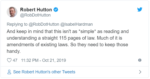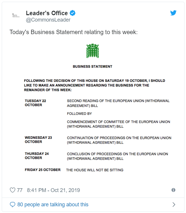 Brexit is 9 days away.Today in Brexit: Boris Johnson vowed the U.K. would leave the European Union on Oct. 31. A vote in Parliament today may determine whether he can keep his promise. What's happening? Prime Minister Boris Johnson is giving Parliament only a few days to debate the most important change to Britain's constitution in almost 50 years. His government, thwarted again on Monday in its plan to put Johnson's Brexit deal to a straight vote in the House of Commons, will instead today begin a rapid attempt to pass key implementing legislation in time to leave the EU on Oct. 31. By the end of this evening the Commons is scheduled to have voted several times on aspects of the prime minister's plan, giving a clear indication of how the final stages of this lengthy divorce might play out. There are opportunities for Johnson, as well as major potential pitfalls. Bloomberg's Tim Ross and Robert Hutton have the full timetable and details here. The choreography will see a legislative process, which often takes weeks to play out, compressed into three days of debate. Here's how the government sees things unfolding.  It probably won't be that simple. Lawmakers only got to see the 110 pages of the legislation, known as the Withdrawal Agreement Bill, on Monday evening. It comes with 125 pages of explanatory notes. As Hutton noted last night, there is more to scrutinize than simply reading the documents.  There are two moments to watch today: The first vote, known as the Second Reading, should take place at about 7 p.m. in London. That will give a broad indication of how much support Johnson's plan has. The next vote, called the Program Motion, could be the battle royal. Lots of MPs want to back the bill and leave the EU, but don't like the idea of rushing the legislation through in double-quick time. Voting down the Program Motion would scupper the government's proposed timetable — and probably ensure the process won't be done in time to leave on Oct. 31. The Institute for Government has a helpful explainer on how it all unfolds. Expect drama. Johnson could pull or drop support for his own bill if the timetable slips. He could resume his efforts to call a general election. And the EU would be forced to consider approving a delay to Brexit. Johnson grudgingly requested that on Saturday night but prefers to "get Brexit done and move on."
