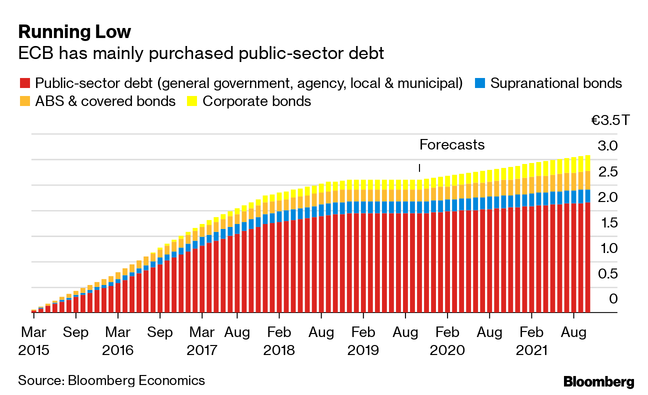 | Welcome to the Brussels Edition, Bloomberg's daily briefing on what matters most in the heart of the European Union. Brexit will be front and center again today when the EU's top leadership and assembly convene in Strasbourg. Officials and lawmakers will discuss last week's deal and get updates from chief negotiator Michel Barnier on the latest from London, where Boris Johnson will try to push the full Withdrawal Agreement Bill through the House of Commons in just three days. The European Parliament panel tasked with Brexit matters already said any vote on the deal would come only after the U.K. has ratified it — a pragmatic stance given Westminster has already rejected three Brexits. This time, Johnson has a slender chance of winning approval. — Viktoria Dendrinou What's Happening Final Fireworks | Donald Tusk and Jean-Claude Juncker will hold their last joint debate with the European Parliament today on the outcome of the latest leaders' meeting. Given their fiery performance at the end of last week's summit, don't expect either of them to hold back their critique of EU governments, especially over the failure to green light accession talks with Albania and North Macedonia. Opening Up | EU lawmakers will also debate today legislation obliging multinationals to disclose publicly their profits and taxes paid by country — a push that has stalled in the face of opposition by governments. They'll vote later this week on a resolution calling on ministers to start negotiations on a new law. While nonbinding, the vote could give fresh impetus to the initiative. Draghi's Legacy | Mario Draghi may be most famous for his "whatever it takes" — a three-word pledge to save the euro. But the outgoing ECB chief leaves behind a more complex legacy for the euro-area economy, with growth, jobs and inflation improving at very different rates. Here are some of the metrics that show his successes and failures. Kosovo Test | Once beaten and imprisoned, Albin Kurti may be designated prime minister of Kosovo as early as this week. Then he'll have to get to work trying mend ties with Serbia — a key requirement to starting accession talks with the EU. Here's more on the former political prisoner. In Case You Missed It Catalan Challenge | Spain's acting Prime Minister Pedro Sanchez visited Barcelona yesterday to visit police officers injured in separatist riots, as opinion polls show the unrest in Catalonia is boosting his right-wing rivals. It's his first visit to the region following jail terms for Catalan separatist leaders, as he seeks to show he has a grip on the situation ahead of a general election next month. Men's World | Despite being celebrated, Christine Lagarde's rise to become the ECB's first-ever female president is atypical for her gender, according to new research. The findings are bleak: women daring to encroach upon the male-dominated world of economics and central banking seem to face greater hostility from their audience and less favorable referees when submitting papers. Italian Drama | Leaders of Italy's ruling coalition met yesterday to discuss next year's spending plan after a weekend of posturing and veiled threats about a budget Prime Minister Giuseppe Conte says is all but finalized. At issue are items that affect the constituencies of the two coalition parties and, despite Italy's limited room to maneuver, politicians are already calling for significant changes. Rate Caution | ECB officials must bear in mind their previous premature interest-rate hikes and the market turmoil around the U.S. Federal Reserve's tapering of bond purchases when they eventually start to tighten monetary policy, Bank of Finland Governor Olli Rehn warned in a book published in Helsinki yesterday. Read more here about his recommendations for the future. Chart of the Day The ECB is running low on sovereign bonds to buy, undermining the credibility of its pledge to keep going until inflation picks up. If the next phase of its asset-purchase program continues for two years, the ECB could face a shortage of about 60 billion euros ($67 billion). At the present pace, the central bank could run out of bonds in little over a year, according to calculations by Bloomberg Economics. Today's Agenda All times CET. - 9 a.m. EU Parliament debate with Council President Tusk and Commission President Juncker