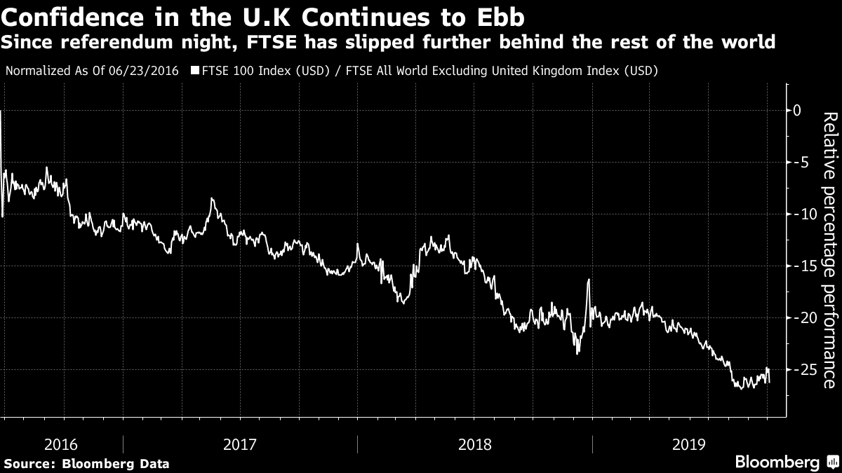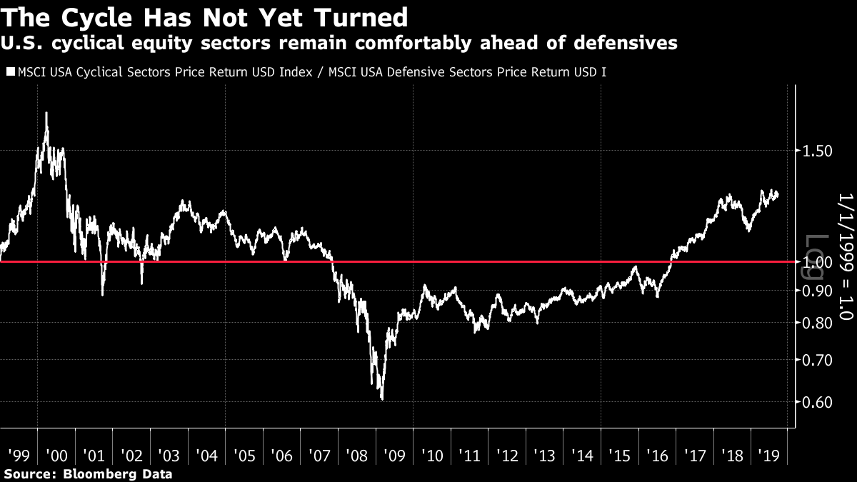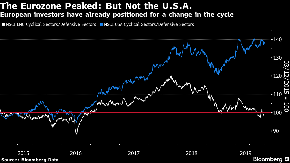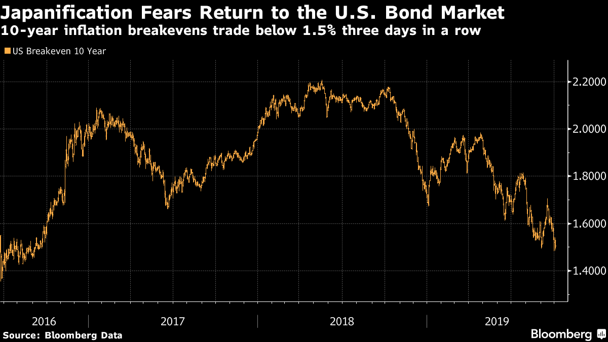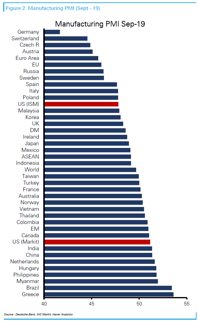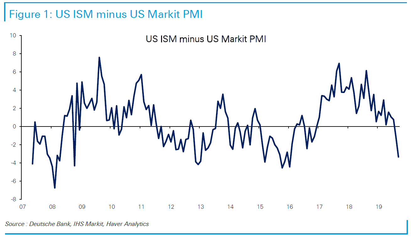 Jurassic Stock Markets This is a time when only a dinosaur analogy will do. Equity markets around the world are suddenly moving to price in the alarm about slowing global growth that has been evident in bond markets for many months. Why? Jeremy Grantham, the founder of Boston-based GMO, likened the stock market to a dinosaur with a tiny brain: "As yet the equity market seems totally unaffected, with volatile and risky stocks still making the running. Although the brontosaurus has been bitten on the tail, the message has not yet reached its tiny brain, but is proceeding up the long backbone, one vertebra at a time." This comment beautifully encapsulates what is now happening. What is alarming is that Grantham didn't say that this week or even this year. He made this remark way back in July 2007 at a point when we now know the financial world was about to tip into crisis. Of many people I spoke to at the time for a piece you can find here, he proved to have by far the greatest foresight. What has bitten the brontosaurus's tail this time? The most obvious culprit was the ISM supply manager survey data that came out earlier this week. The numbers for German manufacturing were undeniably terrible. The numbers for the U.S. and China, which are both covered by two rival surveys, were ambiguously bad. Nothing in the numbers was cause for comfort: The two surveys of China show its manufacturing sector close to the level of 50, which is meant to show the difference between recession and expansion. There are always graver doubts over data from China than for other countries, but at least they do not show marked deterioration. In the U.S., the Institute of Supply Management's number is diving into recessionary territory, while the rival number produced by Markit is above 50. The problem here, as shown by this chart from Deutsche Bank's Alan Ruskin, is that the ISM survey is more variable, and tends to undershoot Markit when times are genuinely bad: The most alarming element of the data, as pointed out by Ruskin's colleague Torsten Slok, is that new export orders are in a true collapse. Since the series started in 1988, they have been worse only during the toughest months of the Great Recession. However, the U.S. economy isn't as sensitive to exports as other big industrial nations, such as Germany (which is particularly vulnerable to the latest round of trade hostilities), so this worrying number isn't a clear recession warning: All ISM surveys are set with 50 as the dividing line for a recession, so they enable comparisons. This chart, from Deutsche Bank's Ruskin, suggests the world as a whole could be in much worse shape, but that Germany and the countries around it appear to be in imminent danger of a recession: These data helped shift sentiment in the rates market. Fed funds futures now price in another 25-basis-point rate cut at the end of this month, while a fourth reduction this year, in December, is now viewed as 50-50. That is justified both by the manufacturing data, and by moves in the bond market. The 10-year inflation break-even for the U.S. has traded below 1.5% in each of the last three days. It had not previously been this low since the brief scare that followed the Brexit referendum in the summer of 2016. On its face, this is a clear warning that investors are braced once again for the U.S. to turn Japanese. But now Grantham's brontosaurus raises its ugly head. If we look at MSCI's index of the more cyclical U.S. sectors compared with its gauge of more defensive sectors since 1999, we see that cyclicals are performing as well as they have ever done in that period, bar the dot-com bubble. They appear to be touching a plateau, but they haven't started to fall. The EU isn't like this. MSCI has run similar indexes for the euro zone since March 2015. In that period, cyclical stocks have outperformed more in the U.S. than in Europe, which is no surprise as American cyclical stocks include recent stock market darlings like Amazon.com Inc., Apple Inc. and Google's parent Alphabet Inc. But the difference between the two charts is still remarkable. Cyclicals peaked at the turn of 2018 in Europe, just as the German ISM was reaching a high, and have since erased all their outperformance since 2015. But U.S. cyclicals went on a fresh tear after their Christmas Eve scare: So it looks as though the American brontosaurus has some pain ahead – although this doesn't necessarily mean that the market will unravel as it did in 2007. Stock market dinosaurs will now be more anxious than before about Friday's employment data. Brexit Breaks It Amid a bad day for world stocks, Britain stood out. Wednesday's sell-off was the worst in percentage terms since the day after the referendum in 2016: Why? Multinationals such as BP Plc and Royal Dutch Shell Plc led the selling. But it was still a bad day for U.K. stocks relative to FTSE's index for the world excluding the U.K. The U.K.'s manufacturing sector appears to be in better shape than industry across the Channel, despite concerns over Brexit. So it's interesting that confidence continues to evaporate: The day's big British news was the latest proposal from Boris Johnson to break the logjam. The prime minister's suggested compromise on the Irish border was poorly received in Brussels, albeit not rejected out of hand. However, it seems to have ended any great hope that he could somehow reach a negotiated deal to leave the EU by the end of this month. According to the Predictit prediction market, the chances of exiting on schedule were as high as 58% back in August, when Johnson appeared to be in control of the situation. Those odds dropped on Wednesday to 23%. The issue of Ireland, still largely absent from the debate in the U.K., remains intractable. (For an explanation of why, I recommend A Short History of Brexit by Kevin O'Rourke.) That implies that the agony of indecision will be extended yet further. And the carnivorous dinosaurs driving the U.K. market