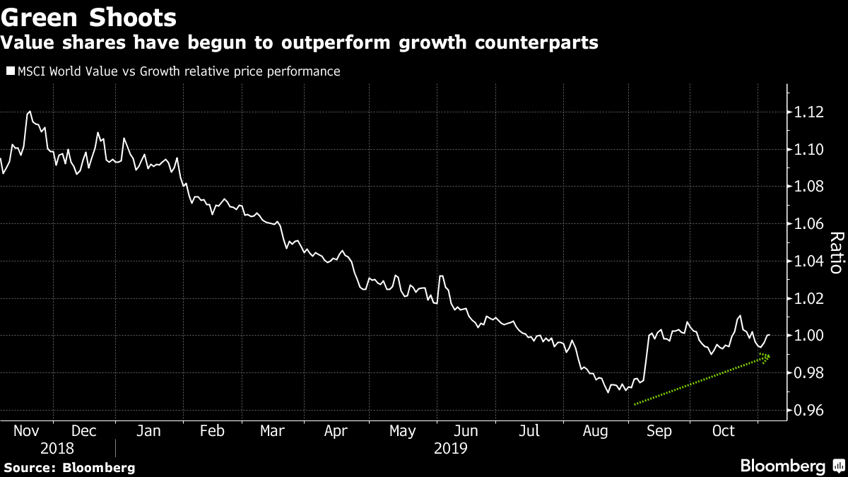 | Welcome to your morning markets update, delivered every weekday before the European open. Good morning. The stock rally fueled by trade optimism is cooling a bit, the U.K. Conservative party is dusting itself off after a tough day for its election campaign and German factory orders will be eyed as a key economic indicator. Here's what's moving markets. Waiting Stocks in Asia mostly slipped as investors looked for fresh reasons to be bullish about trade negotiations. Investors are now waiting to see if U.S. President Donald Trump will do as China asks and eliminate some of the tariffs he's imposed, in order to hurry along a deal. One sign that investors have been betting in recent days on a positive trade outcome is that lower-volatility shares from sectors less exposed to economic cycles have started to underperform after beating the market for much of the year. Strategists at HSBC Holdings Plc say it's time to sell risk assets as sentiment looks stretched. Johnson to Regroup U.K. Prime Minister Boris Johnson will attempt to get his election campaign back on track later after a day of blows that including seeing one of his most senior ministers, Jacob Rees-Mogg, forced to apologize for his comments about the 2017 London tower block fire. Johnson has a meeting with the queen later, in which he'll tell the monarch he didn't want an early election, but had no choice because it was the only way to break the deadlock on Brexit. Former Chancellor Philip Hammond quit Parliament yesterday with a swipe at the prime minister for not allowing a wide range of views in his party. Meanwhile, British businesses aren't taking Johnson's "Get Brexit Done" slogan too seriously. Factory Fears German factory orders are becoming one of the euro area's biggest monthly data points, with the last two readings helping to fuel fears of a recession in the currency bloc's largest economy. Manufacturing in the zone on a whole is the weakest it's been for seven years, adding to pressure on the region's governments to provide more fiscal stimulus, and anything other than a return to small growth for the factory number at 8 a.m. CET, as forecast by the average economist, could hit the euro today. Swipe Left Not even the business of dating apps is immune to macroeconomic factors such as Brexit and currency movements, according to Match Group Inc. The company's shares sank 15% in after-hours New York trading as the Tinder and Hinge owner's fourth-quarter sales forecast missed estimates and its profits were crimped by legal disputes. Post-market sentiment in U.S. tech stocks was hurt further by misses for midcap tech firms HubSpot, Inc. from the cloud sector and chipmaker Microchip Technology Inc. But on a more bullish note, watch HP Inc. shares later after the Wall Street Journal reported that Xerox Holdings Corp. is considering a cash-stock offer for the $27 billion PC giant. Coming Up… Earnings from French bank Societe Generale SA fell short of forecasts this morning, while embattled German payment firm Wirecard AG and U.K. high street bellwether Marks & Spencer Group Plc are among those still to come. Meanwhile, the central bank speaker schedule gets a tad busier with U.S. and euro-zone policymakers due up at different events, while Poland, Iceland and Romania are all forecast to make no change to their rates in monthly decisions announced later. Finally, Bill Gates and Kim Kardashian West are among participants at the New York Times DealBook conference of business leaders and innovative thinkers. What We've Been Reading This is what's caught our eye over the past 24 hours. And finally, here's what Cormac Mullen is interested in this morning After a short-lived rally in value stocks in early September, the MSCI World Value Index has tentatively begun to outperform its growth counterpart again, thanks to increased optimism over U.S.-China trade talks and hopes for a recovery in global economic data. The gauge has risen 5.2% over the past month, compared to a 4.7% rise in the MSCI World Growth Index. For strategists at SocGen, the current market environment is one where investors are better off having cheaper stocks than not in their portfolios. Funds without value shares show a heightened sensitivity to bonds, which are at risk of a sell-off if economic data improves, strategists including Sandrine Ungari wrote in a note Tuesday. Meanwhile, cheap stocks are at levels where they have delivered strong returns in the past, and even if pessimism returns, they won't necessarily underperform the broader market, they added. The value trade has been a relative widowmaker for the best part of a decade, but there will be a point when they see outsized gains. At the moment that seems to be a call on whether the current period of global economic weakness has come to an end. Cormac Mullen is a Cross-Asset reporter and editor for Bloomberg News in Tokyo. Like Bloomberg's Five Things? Subscribe for unlimited access to trusted, data-based journalism in 120 countries around the world and gain expert analysis from exclusive daily newsletters, The Bloomberg Open and The Bloomberg Close. Before it's here, it's on the Bloomberg Terminal. Find out more about how the Terminal delivers information and analysis that financial professionals can't find anywhere else. Learn more. |