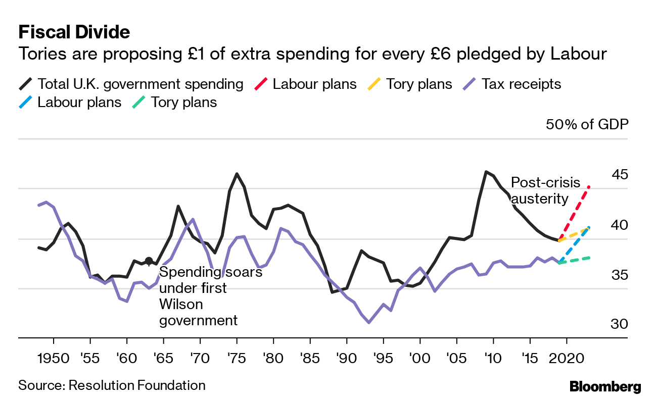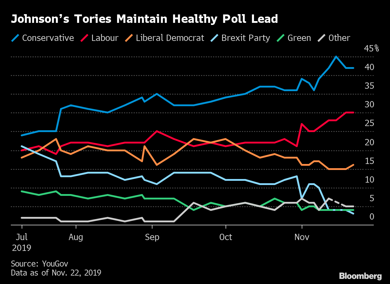Days to General Election: 17What's Happening? The Conservatives are playing it safe with election promises, but a new Brexit cliff-edge could soon come into view. It seems like a safety-first manifesto: Get Brexit "done," cut some taxes and promise to hire 50,000 extra nurses. In purely fiscal terms. Prime Minister Boris Johnson's pledges for the next Parliament amount to one pound of extra spending for every six promised by Labour, Bloomberg's Andrew Atkinson notes. And there's a good reason the Conservative Party is cautious, despite being ahead in the polls. (A new ICM/Reuters poll this afternoon gives the Tories a seven-point lead over the Labour Party — days after a separate weekend poll put them 19 points ahead.) In 2017, a disastrous manifesto contributed to Theresa May almost losing the election.  Nevertheless, there's one big buried risk: The manifesto explicitly rules out any extension to the Brexit transition period, which expires at the end of 2020. If he wins a majority, Johnson should be able to bring back his Brexit deal to Parliament before Christmas, but many experts think his desire to reach a swift trade deal is unrealistic. The promise has helped him neuter Nigel Farage and has brought hard Brexiters on board — but time is tight. Johnson's own commitments won't make it easy to negotiate a trade deal. For one thing, he's promised to leave the European Union's Common Fisheries Policy and take back control of British waters. Access to those areas is one of France's key demands. The prime minister is no stranger to a U-turn or two, but breaking a manifesto pledge remains a big deal in British politics. We may not have seen the last of the Brexit cliff-edge. — Edward Evans Today's Must-Reads Brexit in BriefOut of Commission | The U.K. failed to respond to a European Commission deadline for it to name a candidate for the incoming slate of commissioners. The commission "will now analyze" possible next steps, spokeswoman Mina Andreeva told reporters in Brussels. The incoming commission team is due on Dec. 1. Taking Stock | U.K. stocks may be poised to rebound in 2020 as fears of a no-deal Brexit recede, according to an increasing number of strategists and fund managers. Morgan Stanley strategists say U.K. shares are "potentially the best global equity opportunity for 2020." Credit Suisse says that British stocks are 14% undervalued according to its model. Leaders Grilled | The U.K.'s key political leaders will each be interviewed by the BBC's Andrew Neil before the election campaign is done. Scottish Nationalist Party leader Nicola Sturgeon is first in the hot-seat, on BBC One in the U.K. at 7:30 p.m. tonight. Tomorrow: Jeremy Corbyn. 'Really Brazen' | The inventor of the World Wide Web, Sir Tim Berners-Lee, criticized the Conservative Party for rebranding a party account as a fact-checking authority during last week's Johnson-Corbyn debate. "It was unbelievable they would do that," he told the BBC. "Don't do that. Don't trust people who do that." Remainers Speak Out | Two leading anti-Brexit figures spoke up in favor of voting tactically on Dec. 12. Former Labour Prime Minister Tony Blair said he would understand if people voted for the Liberal Democrats, while Liberal Democrat candidate Chuka Umunna urged voters to back his party to "help reduce the number of pro-Brexit Conservative MPs." Grime4Corbyn | Stormzy is backing Labour, again. In a letter to the Guardian, the award-winning grime MC said a vote for Labour was necessary to "end austerity, rebuild our communities" and change lives. Want to keep up with Brexit?You can follow us @Brexit on Twitter, and listen to Bloomberg Westminster every weekday. It's live at midday on Bloomberg Radio and is available as a podcast too. Share the Brexit Bulletin: Colleagues, friends and family can sign up here. For full EU coverage, try the Brussels Edition. For even more: Subscribe to Bloomberg All Access for our unmatched global news coverage and two in-depth daily newsletters, The Bloomberg Open and The Bloomberg Close. |