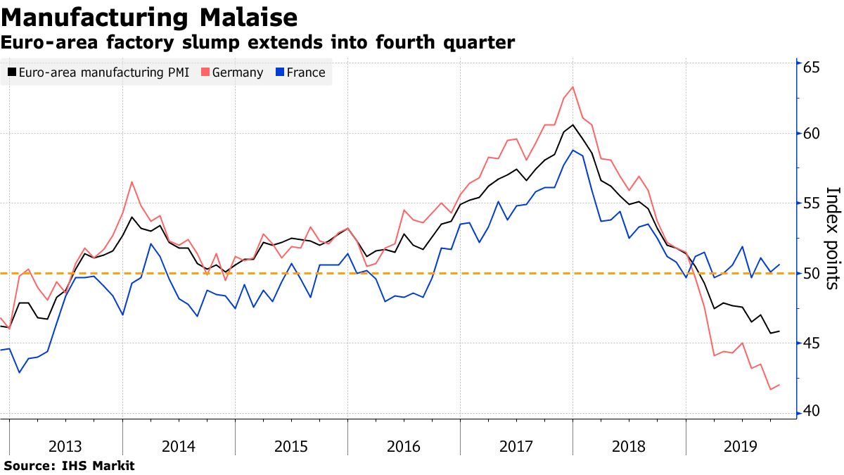 Gene Therapy | On the Italian island of Sicily, a $1.8 million treatment now offers hope to hundreds of people suffering from a severe blood disorder. Italy has more patients afflicted with the inherited disease, beta thalassemia, than anywhere in Europe and the U.S. But these patients, dependent on frequent blood transfusions, will need to wait to get Bluebird Bio's newly approved gene therapy. Drugmakers diving into the potentially lucrative field must persuade governments and insurers to pay for the costly therapies, not just in Italy but around the world. Chart of the Day Euro-zone manufacturing remained near the weakest in seven years last month, a poor start to the final quarter that raises pressure on the region's governments to add fiscal stimulus to insulate the region from a worsening global slowdown. Germany with its export-reliant industry continued to be the principal source of frailty. Today's Agenda All times CET. - 9:30 a.m. The EU's top court rules in cases against the European Central Bank and Latvia's Trasta Komercbanka, the lender shut down after money-laundering allegations