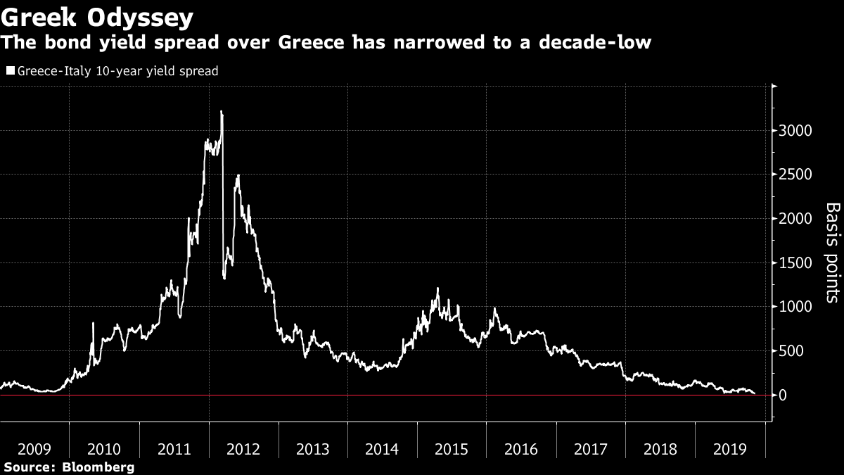 | Welcome to the Brussels Edition, Bloomberg's daily briefing on what matters most in the heart of the European Union. German Finance Minister Olaf Scholz's push to break the gridlock on EU banking-market integration will get a reality check when he meets euro-area counterparts today in Brussels. Southern European countries will get a chance to express their views on the long list of demands attached to Germany's compromise proposal on a joint deposit insurance. But even if finalizing the project remains an uphill battle, including within Germany, there's one thing Scholz has already achieved: After years of talks in obscure working groups, he's put banking union on the front pages again. —Alexander Weber and Nikos Chrysoloras What's Happening Economic Outlook | Finance ministers will also take stock of the latest economic forecasts, due to be published by the European Commission today and likely to further downgrade growth projections. Amid timid signs of resilience, and increasingly dire warnings to prepare for the worst, Germany is sticking to its guns that no emergency action to stem the slowdown is needed. Greek Taxes | Gone are the days when Greece was a permanent item on the agenda of finance ministers' meetings. The former euro-area problem child is instead focusing on re-branding itself as an investors' paradise, with the introduction today of an alluring flat tax for wealthy people willing to shift their residence to the Mediterranean country. Cypriot Passports | Another sunny EU country that sought tax haven status for the wealthy has found itself in the international spotlight for attracting rather shady personalities. Now, Cyprus is beginning the process of revoking the citizenship of some of the "investors" it lured in, including the alleged mastermind of one of the world's biggest financial scandals. Turkish Sanctions | Cyprus appears to be succeeding in getting the EU to impose sanctions against Turkey over drilling in the Eastern Mediterranean. The decision may be taken by foreign ministers meeting in Brussels on Monday, unless, among other things, President Recep Tayyip Erdogan convinces Hungarian Prime Minister Viktor Orban to stall the process when they meet in Budapest today. Car Crunch | The EU's trade chief sounded oh-so-cautiously optimistic about the bloc avoiding U.S. tariffs on autos — President Donald Trump is expected to make a decision on the matter as soon as next week. "There seem to be very few people defending the idea of tariffs in the car sector," Cecilia Malmstrom told a European Parliament committee in Brussels yesterday. In Case You Missed It U.K. Election | Things keep going wrong for Boris Johnson as he seeks to win a Conservative majority in the U.K.'s Dec. 12 general election. While the Tories have a double-digit lead over the main opposition Labour Party in several recent polls, the negatives are piling up. Here's why. New Commission | Following a fair share of slaps by the European Parliament, the new EU executive arm is being filled, after President-elect Ursula von der Leyen picked Adina-Ioana Valean as Romania's Commissioner-designate. The U.K. is the only country not to nominate a Commissioner, and EU leaders have yet to show any signs they'll let Boris Johnson get away with that. Eastern Malaise | A slowdown in global car sales and the threat of U.S. tariffs are curbing economic expansion in eastern Europe, a key manufacturer for the continent's auto industry, according to the European Bank for Reconstruction and Development. Slovakia, the world's largest car producer relative to population, suffered the biggest downgrade in the bank's forecasts, based on its exposure to Germany's auto giants. Climate Emergency | More than 11,000 experts from around the world warned "clearly and unequivocally that planet Earth is facing a climate emergency." Saving ourselves from catastrophe would require a profound transformation of the way we live, consume, eat and move. Is anyone listening? The EU is suggesting it is, with a pledge to push green finance within months. Chart of the Day Greece's bonds are going from strength to strength, and nowhere is that more noticeable than in the yield spread against their peers in Italy. The gap in borrowing costs is tighter than at any point in the past decade, showing investors increasingly see Greece as a safe place to put their money, despite the nation's lack of an investment-grade rating. Today's Agenda All times CET. - 9:30 a.m. The EU's lower court rules in a challenge by Campine NV against EU fines levied in 2017 against a number of recycling companies for teaming together to push down prices for car batteries