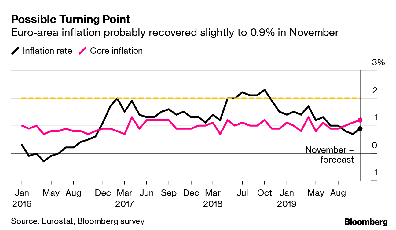 —Viktoria Dendrinou and Nikos Chrysoloras What's Happening Sharing Battle | Google and YouTube are at the center of a dispute at the EU's top court over uploaded videos that violate copyright rules. The case follows a referral by Germany's top court, which sought the EU judges' guidance in a lawsuit by a music producer against Google and the video-sharing platform. Northern Winds | The wind power expansion sweeping northern Sweden has been likened to the Texan wind boom of the past few decades, which turned the state into the biggest U.S. producer. Here's how Scandinavia's largest economy wants to become a renewables superpower. Green Plans | The EU needs to tighten its 2030 emission-reduction target next year and impose stricter pollution limits on companies in the world's biggest carbon market, the Netherlands said in its assessment of the incoming executive's plans to make Europe the first climate-neutral continent by 2050. The Dutch are trying to do their part, starting with pigs. Balkan Exodus | Depriving western Balkan countries of a clear chance to join the EU risks accelerating the already alarming pace of migration from the region, North Macedonia's president said. The cool reception from established EU members is also raising concern the bloc is losing clout in the region as China, Russia and Turkey push to increase their influence. In Case You Missed It Slow Lane | German business expectations improved in November, adding to signs the downturn in Europe's biggest economy may be bottoming out. The readings support the growing optimism about Germany's economy — after it dodged a recession this year — and strengthen Berlin's case against government spending. Spy Drama | President Donald Trump's ambassador to Germany said comments by government officials equating the threats of espionage by the U.S. and China were an "insult" to American troops stationed in the country. Along with trade, defense spending and Russian gas, Huawei's role in Germany's 5G networks has been a source of increasing tension between Berlin and Washington. Italian Hazards | Italy suffered its second bridge collapse in 15 months, raising major questions about the safety of the country's aging infrastructure. Italy's weak economy and massive debt have left little room for government spending. German Job | Thieves made off with jewelry and artifacts worth a reported $1.1 billion after a burglary at a German museum. The stolen goods include ensembles of diamonds that are of "priceless art-historic value." And it's not the first time. Chart of the Day The first pickup in euro-area inflation in five months is on its way, with price growth forecast to have accelerated to 0.9% in November from 0.7%. But the headline rate is still well below the European Central Bank's goal and highlights the big challenge facing President Christine Lagarde. Today's Agenda All times CET. - 9:30 a.m. EU top court hears arguments on the responsibilities of platforms such as YouTube when copyright-infringing content is shared there