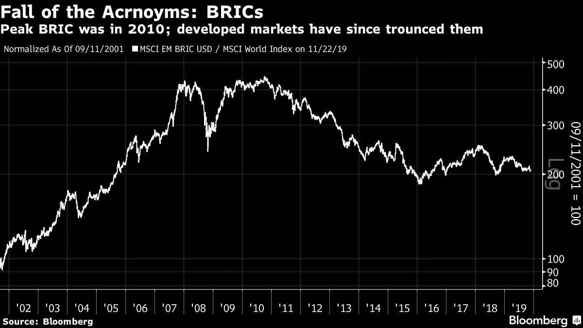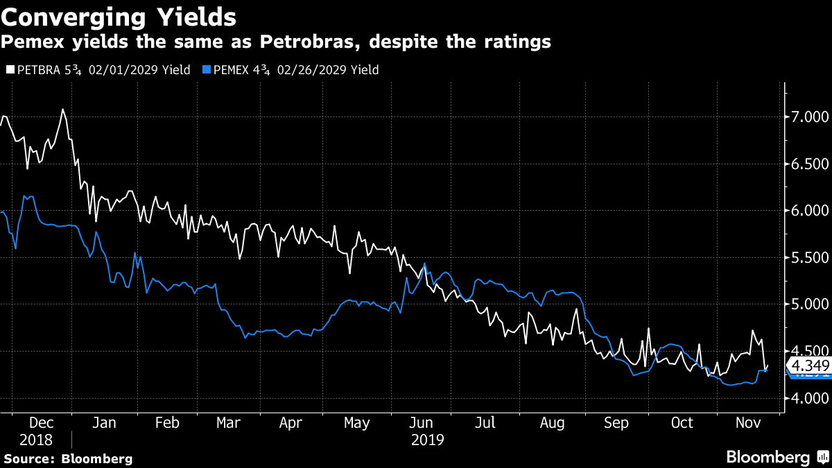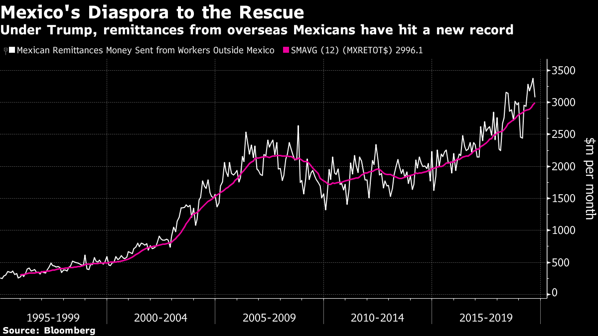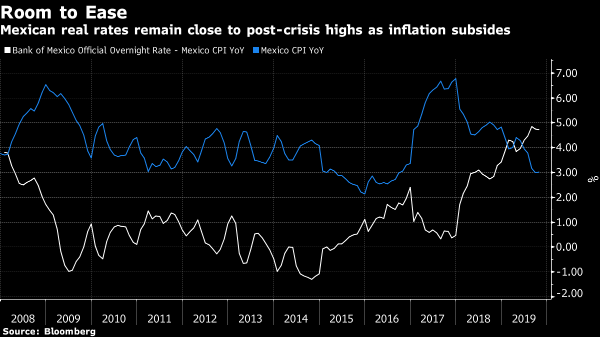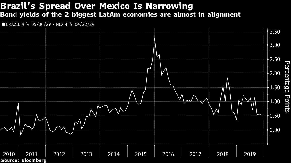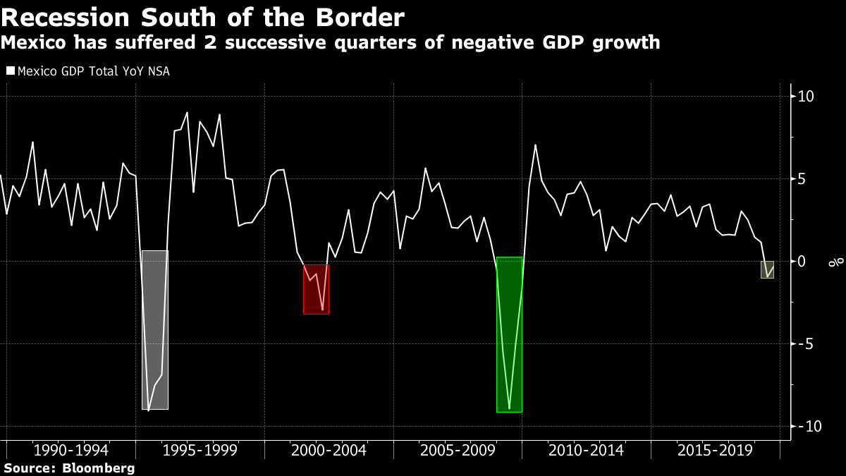 Recession Almost Reaches the U.S. Recession is very close to the U.S. In fact, it couldn't be closer. Mexico is now technically in recession. By Mexican standards, this isn't yet a serious contraction. And by anyone else's standards, two quarters of marginally negative growth seem relatively painless. The country suffered vastly worse economic convulsions after a botched devaluation sparked the Tequila Crisis in 1994, and again after the Lehman Brothers bankruptcy in 2008: Since the Tequila Crisis, however, Mexico's economic cycle has been very much in sync with the U.S. to the north. This has been an advantage for much of the time. Even though it is a big petroleum producer, it hasn't joined other emerging markets in following the commodity cycle up and down. Instead, like the U.S., it suffered a minor recession at the beginning of the last decade, and a major one at the end of it. Both were very much generated by the U.S. itself. Mexico's economy has integrated enough with the U.S. since 1994 — which began with the start of the Nafta trade treaty — to avoid some of the worst cyclicality and volatility of other emerging markets. But it hasn't diversified enough to be able to keep growing when the U.S. hits trouble. And this raises a question: Is Mexico's minor slump a harbinger of a recession in the U.S.? It might well not be. First of all, one of the strongest factors in Mexico's favor is the strong flow of remittances from migrant workers outside the country, the great majority of whom are in the U.S. Remittances had stagnated for years, but have taken off under Trump to hit new records. This isn't because of an influx of new migrants, and instead suggests that decent paying jobs are much easier to find now: And while the Tequila Crisis was sparked by the Federal Reserve's surprise decision to hike rates during 1994, which put pressure on the Mexican peso when it was still pegged, in the past year the Fed has been easing. That relieves pressure on the currency. Judged in real effective terms, taking account of changes in inflation, we can see that the peso has stayed stable during the ugly headlines and tweets of the Trump era. While weak, there is room for it to depreciate further: Meanwhile, other things in the Mexican economy have gone awry. Petroleos Mexicanos, the state-owned oil company known as Pemex, has for decades been the milch cow for the government, allowing the country to survive low levels of tax collection. But with the new left-wing President Andres Manuel Lopez Obrador, or AMLO, determined to maintain fiscal discipline, reporting by Bloomberg News shows that the oil company has had to resort to delaying payments to suppliers and contractors. Any such sign speaks directly to the creditworthiness of Mexico as a whole. Meanwhile, Sebastian Boyd pointed out in the following chart that Brazil's national energy company, Petroleo Brasileiro SA, or Petrobras, now trades at the same yield as Pemex — despite having been mired in scandal for years and having a significantly poorer credit rating: The issue of Pemex is wholly indigenous to Mexico. If it loses the confidence of investors, it is hard to blame that on the Americans (tempting as that may be for many Mexicans ). Meanwhile, the gap between Mexican and Brazilian sovereign bond yields has also narrowed, despite Brazil's severe problems of recent years. Given that Brazil's sovereign debt is rated several notches lower, this suggests that Mexican debt might be decent value — if only because it shows very low market confidence in the country. As the Tequila Crisis demonstrated a quarter-century ago, loss of market confidence can become a self-fulfilling prophecy, so this is still alarming. But there is one other critical area of hope for Mexico. The central bank has kept interest rates high, in a largely successful attempt to defend the peso and contain inflation. Now, with inflation sinking, real overnight rates are their highest in a decade. There is room for far more easing of monetary policy from here: That room is needed. This is still only a minor slowdown. But consumption is slowing, and the U.S. election, combined with the unfolding story of the AMLO presidency and Mexico's continued terrifying battle with the drug cartels (who are fueled by the insatiable American appetite for drugs), will all stoke further uncertainty. Those optimistic about Mexico also have to contend with the uncomfortable fact that it's likely to be hurt by any resolution of the trade conflict between the U.S. and China. It lost many manufacturing jobs to China when the latter joined the World Trade Organization, and there had been hopes that they would return. Any recession in Mexico, technical or otherwise, will always reveal some problems or mistakes by the U.S. But this latest slowdown appears to say more about problems of Mexico's own making, and about declining market confidence. Rise of the Acronyms I have never been a fan of acronym-based investing. As a rule, if someone thinks to apply an acronym to a group of investments, we can be sure that: - It is wildly oversimplified;