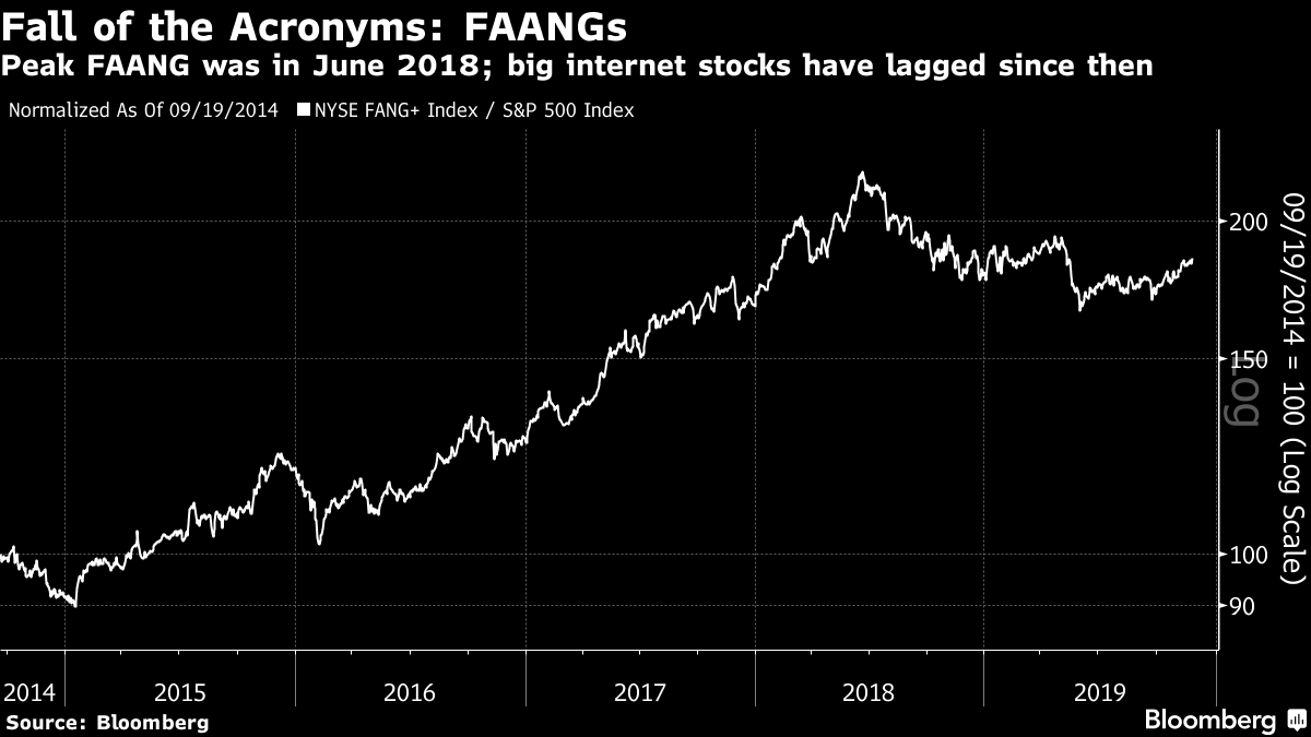 Exhibit a) is the BRICs (Brazil, Russia, India and China). The acronym was coined by Jim O'Neill, then of Goldman Sachs Group Inc., in a report published in the aftermath of the 9/11 terrorist attacks to suggest that the biggest emerging markets should start to exert more weight in international forums such as the G-7. He did not have investment in mind. Then it became an acronym. This is the exciting history of MSCI's BRIC index, compared to the developed world: More recently we have had the FAANGs, originally named for Facebook Inc., Amazon.com Inc., Netflix Inc. and Google Inc. Subsequently, a few other companies have been crow-barred in, led by Apple Inc., while a blind-eye has been turned to Google's change of name to Alphabet Inc., as that would mess up the acronym. Here is the performance of the NYSE FANG+ index from its inception, compared to the S&P 500: In general, if you wait for someone to come up with an acronym, you have probably left it too late. Which brings me to the political world. Apparently, there is now talk in Britain of a Government of National Unity, or GNU. For the uninitiated, a gnu is another name for a wildebeest. In Britain this animal is best know as the hero of The Gnu Song by the duo Michael Flanders (father of Bloomberg colleague Stephanie) and Donald Swann. But now a GNU also stands for the notion that Boris Johnson's Conservatives could be denied a majority in next month's general election, to be replaced by a coalition with someone other than Labour leader Jeremy Corbyn at its head. Tony Blair, the former Labour prime minister, has made clear that he thinks this would be a good idea in the face of "dysfunctional" politics, and that it would be possible to find "a suitable candidate to get the thing done." The implication is that Corbyn is unsuitable. At certain points this year, a GNU did look like a real possibility. But like BRICs and FANGs before it, the latest polls suggest that we have already passed the point of Peak GNU. Like Bloomberg's Points of Return? Subscribe for unlimited access to trusted, data-based journalism in 120 countries around the world and gain expert analysis from exclusive daily newsletters, The Bloomberg Open and The Bloomberg Close. |