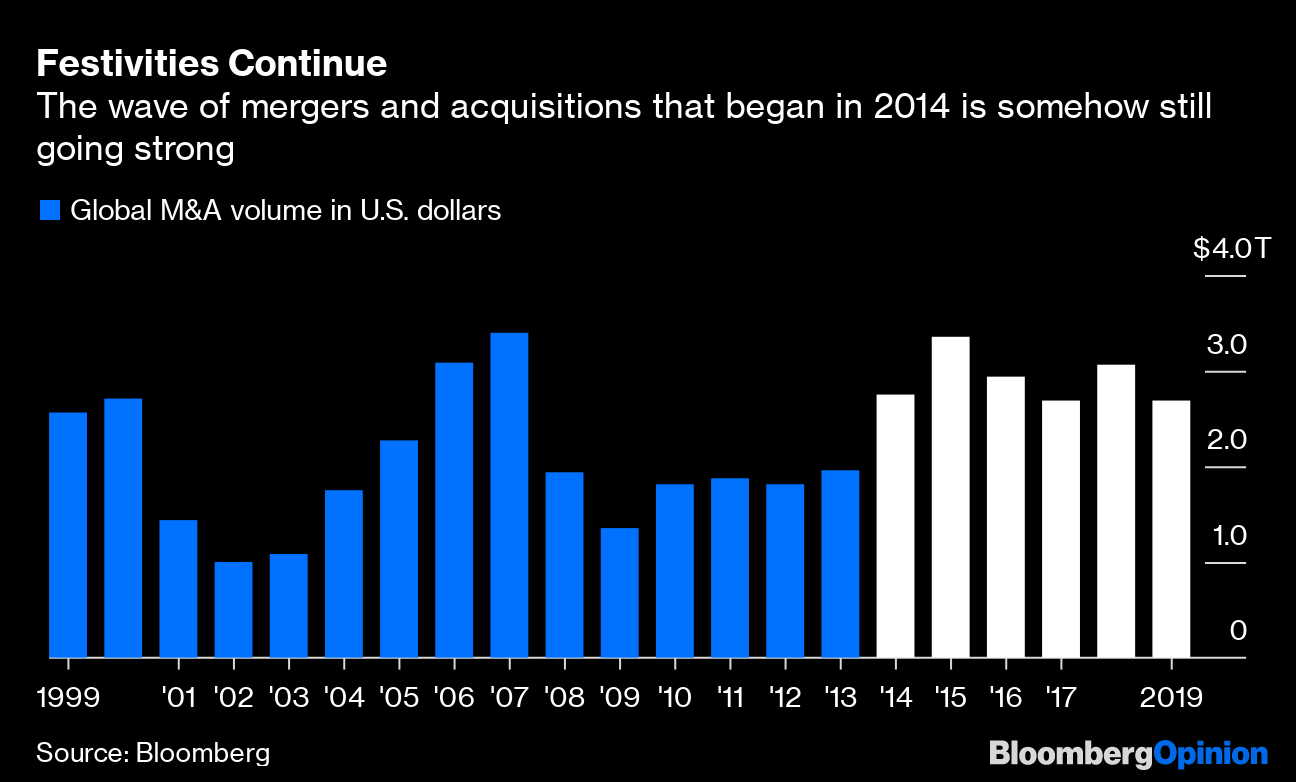 | This is Bloomberg Opinion Today, a supergroup of Bloomberg Opinion's opinions. Sign up here. Today's Agenda If It's a Monday in 2019, It's a Merger Day In the End Times, we may scrabble across a scorched hellscape, just ahead of the cannibal hordes. But even in those dark days, you can be sure M&A bankers will find ways to make money. These are just the pre-End Times, which are still decent economically in the U.S., making it a great time for some M&A. (Bad economic times are also great times for M&A, for survival reasons. And when these deals go bad, it's a great time for some reverse M&A, done by the same bankers.) Today saw $56 billion in corporate deals announced by drugmakers, brokerages and more, notes Tara Lachapelle, with history's biggest LBO waiting in the wings. We're in an absolutely bonkers five-year run of corporate coupling that shows no sign of stopping: And this is all happening despite, or maybe because of, the never-quite-dead-yet trade war and lingering agita about an economic slowdown. Whatever happens next, M&A bankers win, Tara writes, even if some investors in these deals end up feeling like they've been visited by those cannibal hordes. Bloomberg Opinion writers weighed in on the day's biggest deals: We Might Not Make It If these are great days for M&A bankers, they're far less fantastic for unicorn herders. In just a few months, the one-time special-est, unicorn-iest unicorn of them all, WeWork, scrapped its IPO, ditched its CEO and took a bailout from its biggest investor, SoftBank Group Corp. But not to worry, SoftBank says, fixing The We Co. will be "simple." Shira Ovide begs to differ, noting WeWork doesn't see cash flow turning positive until 2023, which is an awfully long time to survive while the company burns through an awful lot of cash. Another former unicorn, Uber Technologies Inc., has watched its stock price tumble since its IPO. The trend continued today, after regulators in London, a major Uber market, took away the ride-sharing company's license. Again. This came even though Uber had cleaned up its act since London's first revocation, and Leonid Bershidsky warns it's a sign Uber still struggles to balance breakneck growth with passenger safety and other issues. Saving the Planet Isn't as Easy as It Sounds If we're to avoid (even more) catastrophic global warming, we'll have to do more than slap up some solar panels and buy some cybertrucks. Cutting back on the world's beef consumption will also probably be necessary, given the sheer carbon-intensity of raising cows. The good news, writes David Fickling, is that beef demand seems to be tapering off, even in the developing world. We'll also probably need to do more to price carbon, which can be politically unpopular and make the companies and people asked to pay the price unhappy. European steel makers, for example, have lately blamed the skyrocketing cost of carbon permits for their troubles. They're being disingenuous, though, writes Chris Bryant; they've actually made a ton of money on these credits. Further Green Reading: Making palm oil more expensive won't save the rainforests. — David Fickling Madison, Wisconsin Complicates One Trump Theory A common but reductive theory of President Donald Trump's 2016 win is that white voters in Rust Belt swing states helped him overcome the strength of minority voters elsewhere. But overwhelmingly white Dane County, Wisconsin, which includes Madison, also overwhelmingly voted for Hillary Clinton in 2016, writes Frank Wilkinson. The differences between places like Madison and rural stretches of the country — where Trump truly is strong with white voters — offers a sharper lesson about this country's real political stress points. Further Politics Reading: Everybody assumes the GOP will acquit Trump, but that's still not a certainty. — Jonathan Bernstein Telltale Charts Don't buy Goldman Sachs's warning of a "baby bear market" for bonds, writes Brian Chappatta; the bank is just hyping up a modest call for a slight correction after a big year. OPEC+ may come to regret not cutting oil production further when it meets next week, writes Julian Lee; though it may accidentally do it anyway. Further Reading Hong Kong protesters' anti-mainland sentiments are turning off potential allies. — Shuli Ren A new study suggests rescuing migrants at sea makes it more appealing for smugglers to put more migrants at risk. — Ferdinando Giugliano There's no evidence negative interest rates do any good. — John Authers General Electric Co.'s new CFO may lack a "wow" factor, but then that's not what GE needs. — Brooke Sutherland The Internet appears to make it easier for companies to grab monopoly power, and our regulatory regime isn't equipped to deal with that. — Noah Smith Gene-editing technology will improve lives, but could forever change what it means to be human. — Mark Buchanan A vegan's lawsuit against Burger King over its "Impossible Whopper" claims has a good point. — Stephen Carter As Amtrak's dining car goes extinct, let's remember its long and wild history. — Stephen Mihm ICYMI A note from Bloomberg Opinion about our coverage during Mike Bloomberg's presidential campaign. Elizabeth Warren accused Bloomberg of trying to "buy a nomination." Ford Motor Co. challenged Tesla Inc. to a truck tug-of-war. The Beverly Hills setting of the "Godfather" horse-head scene is in bankruptcy protection. Kickers Minimum-wage job-loss fears haven't come true. Light pollution could be contributing to the insect apocalypse. How a legit "Star Wars: Rise of Skywalker" script ended up on eBay. My life as a child chef. Note: Please send scripts and complaints to Mark Gongloff at mgongloff1@bloomberg.net. Sign up here and follow us on Twitter and Facebook. |