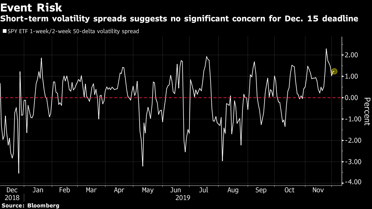 And finally, here's what Cormac Mullen is interested in this morning He hadn't gone away, you know. Tariff Man President Donald Trump sent U.S. and European shares into their biggest slump in about two months after re-instating levies on steel and aluminium from Argentina and Brazil, and then proposing new ones on France. Volatility predictably jumped with the VIX index recording its biggest daily advance since August. Still, while the moves put a renewed spotlight on the Dec. 15 deadline for the next round of tariffs on China, stocks in Asia saw just muted losses. That suggests traders still expect a positive outcome from the market-crucial phase-one trade deal negotiations. A quick look at the difference in volatility pricing before and after the trade deadline confirms this. The spread between one week and two week U.S. 10-year rates volatility is essentially flat, while the equivalent for the S&P 500-tracking SPY exchange-traded-fund is only modestly positive and below recent peaks. Call it complacency or call it confidence, but the market is not yet worried about a collapse in the China trade deal. Cormac Mullen is a cross-asset reporter and editor for Bloomberg News in Tokyo. Like Bloomberg's Five Things? Subscribe for unlimited access to trusted, data-based journalism in 120 countries around the world and gain expert analysis from exclusive daily newsletters, The Bloomberg Open and The Bloomberg Close. Before it's here, it's on the Bloomberg Terminal. Find out more about how the Terminal delivers information and analysis that financial professionals can't find anywhere else. Learn more. |