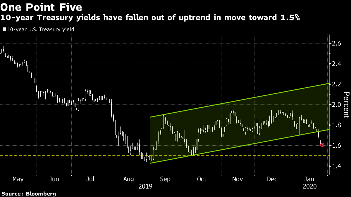 | Welcome to your morning markets update, delivered every weekday before the European open. Good morning. Coronavirus concerns are showing few signs of abating, Brexit's current timeline may be somewhat optimistic and Trump impeachment arguments rumble on. Here's what's moving markets. Virus Update The chief of the World Health Organization is heading to China to assess the country's response to the coronavirus as the death toll continues to rise, new cases keep being found and with concerns that it is being spread before sufferers start showing symptoms. The global efforts being made to stop the virus from spreading further are also stepping up, with the U.S. advising any citizens planning to travel to China to reconsider, while car companies are evacuating personnel, coffee houses and restaurants are suspending business and Asian stocks are still taking a hit, particularly in China and now in South Korea. Market Fallout Jittery market participants are working hard to price in the fallout from coronavirus but it was made abundantly clear which asset classes are in favor and which are bearing the brunt of the worries. Stocks were slapped hard, with airlines, miners, luxury goods and technology stocks the most severely bruised, while oil prices continued to drop overnight amid nerves surrounding China's economy and the potential for demand to be sapped. European stock futures, though, are pointing higher for Tuesday. On the flip side, the attraction of safe havens spiked, sending the world's pile of negative-yielding debt soaring and pushing the gold price to the highest since 2013. More Time Michel Barnier, the European Union's chief Brexit negotiator, says the U.K. will probably need "much more" time to strike a trade deal and settle its future relationship with Europe than the 11 months currently in the diary. Unsurprisingly, Barnier's main concern is that there remains a lack of clarity on exactly how aligned a post-Brexit U.K. wants to be with the EU amid conflicting statements from various U.K. politicians on the subject. Given the likelihood that the U.K.'s relationship with the U.S. could face some strain over Britain's decision to give China's Huawei Technologies Co. partial access to its 5G network, Prime Minister Boris Johnson is going to have a very full plate on the trade front. Bolton Bombshell President Donald Trump's impeachment lawyers largely ignored the revelations from an upcoming book by former national security adviser John Bolton, continuing to argue that a lack of first-hand evidence undermines the case against the president. Two Republican senators, however, disagree and said Bolton's book, which claims Trump tied aid for Ukraine to an investigation of a political rival, has bolstered the argument to subpoena more witnesses. Trump himself denied the allegations, saying Bolton is just trying to sell books. Coming Up… It should be a quiet day on the economic data side but the technology sector will be in focus on both sides of the Atlantic, first with German software giant SAP SE and then, after the U.S. close, with results from Apple Inc. The latter's outlook for iPhone sales and any comments it has on the impact of coronavirus and U.S.-China trade will be closely scrutinized. SAP has raised its profit forecast for 2020. Also keep a close eye on French airplane maker Airbus SE, which is said to be close to reaching a settlement with U.K. authorities over bribery allegations that have loomed over the group for years. What We've Been Reading This is what's caught our eye over the past 24 hours. And finally, here's what Cormac Mullen is interested in this morning Investors are wrestling with attempts to quantify the economic impact of the coronavirus as global efforts to curb the spread of the disease intensify. Outside of the initial risk-asset selloff and haven bid, its potential longer-term effect is beginning to be priced into markets. Growing concerns about the outbreak has sparked traders to bring forward expectations for the next Federal Reserve rate cut. Fed funds futures markets show a full quarter-point cut is now priced in by the end of October, while just a few weeks ago a reduction wasn't seen until early 2021. Of course everybody still expects the central bank to keep its target rate range unchanged this week, at 1.5%-1.75%. Coincidentally, the bottom end of that range mirrors another growing consensus in markets — that that's where benchmark U.S. Treasury yields may find some support. The 10-year yield fell as much as 9 basis points to 1.60% Monday amid the selloff in risk assets. Cormac Mullen is a cross-asset reporter and editor for Bloomberg News in Tokyo. Like Bloomberg's Five Things? Subscribe for unlimited access to trusted, data-based journalism in 120 countries around the world and gain expert analysis from exclusive daily newsletters, The Bloomberg Open and The Bloomberg Close. |