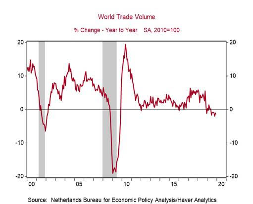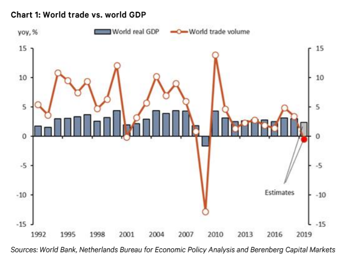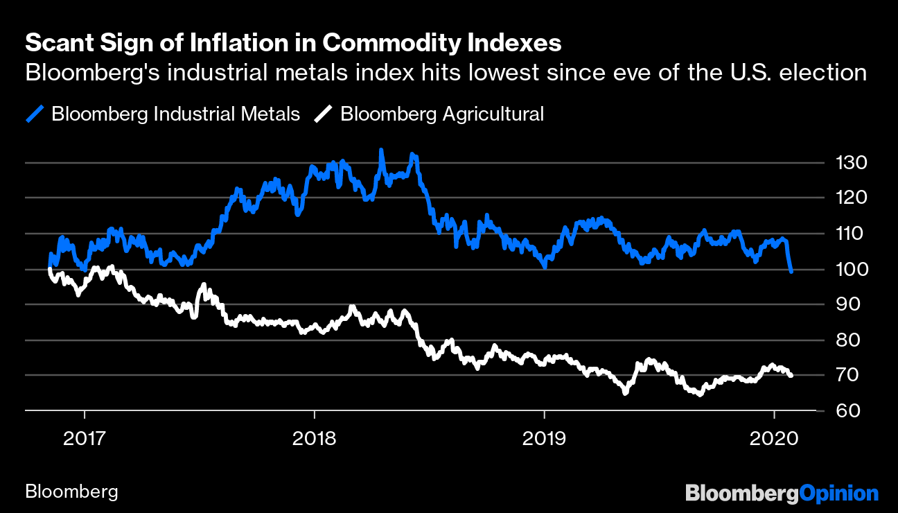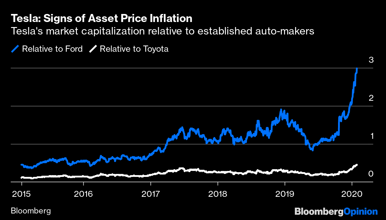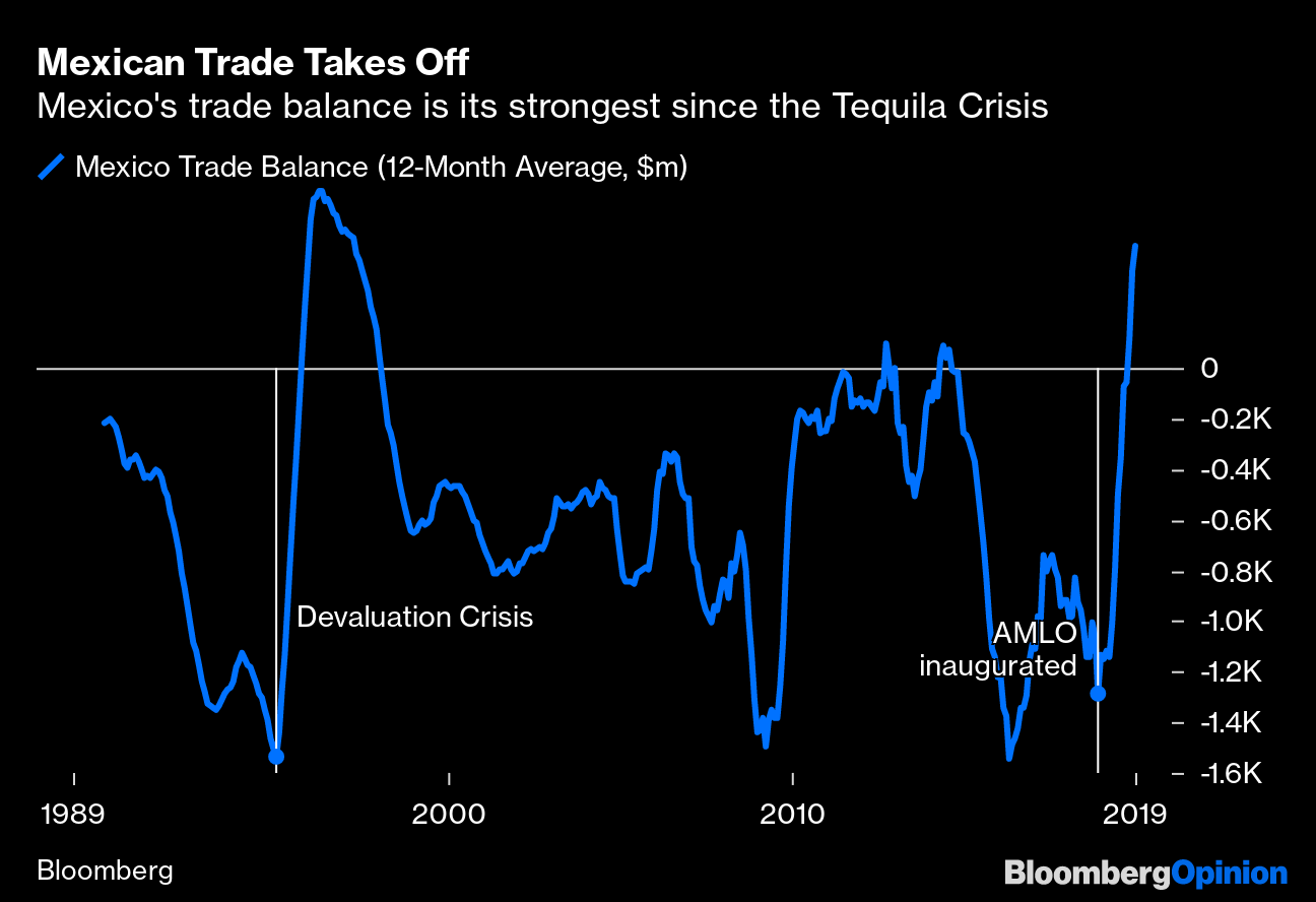 These are very important technical details that have little effect beyond the world of money markets, and — it has to be said — it was all pretty dull. On balance, the Fed seems more worried about low inflation than it was before, which implies rate cuts are a tad more likely. And that's about it. In my experience covering FOMC meetings, I can only think of one that was duller. That was the meeting overseen by Ben Bernanke in May 2006. Arguing against the May '06 meeting is the fact that the FOMC did on that occasion raise its benchmark rate by 25 basis points, which on the face of it is much more interesting. But it had raised rates by exactly that amount at every meeting for more than a year, in a policy begun by Alan Greenspan to ensure that the market never suffered a shock. Meanwhile, it only made one change to its statement, which was to add the word "yet." And somehow, I managed to write an 800-word column about the possible meanings of the word "yet," which is why that meeting is particularly burned into my brain for tedium. You can read that column here, if you are in need of help getting to sleep. However, we should never ignore the Fed completely. Back in May 2006, it seemed truly to be on autopilot. But we now know that U.S. house prices were about to peak in the next month, while credit markets were boiling up. By making life so predictable for markets, the Fed had created the conditions for complacency and excessive speculation. And this time, the ever so slight indications of dovishness from Powell were enough to move markets. According to the Bloomberg World Interest Rate Probabilities function, the chance of a cut in June almost doubled on Wednesday, to 52% from 28%. And on balance the market now thinks two cuts are likely over the next 12 months, compared to only one yesterday. If we look at the bond market, we can see that real yields are negative again, with the 10-year yield dropping below the breakeven rate of expected inflation. These are exceptionally easy monetary conditions: We also have a dreaded yield curve inversion once more. The whole of the curve flattened, with the five-year yield dropping slightly below the two-year, while the key three-month/10-year relationship inverted during Asian trading. This is as good a recession predictor as exists, and it isn't going away. That in turn increases the pressure on the Fed to keep cutting rates, and expanding its balance sheet — which will continue to convince many investors that There Is No Alternative (TINA) to stocks. This dose of dullness from the Fed need not yet have the calamitous consequences of the May 2006 meeting; but it could yet happen. Inflation: Some Contradictory Signs On the subject of inflation and the risk of more of it, Wednesday brought some contradictory news. First, looking to the commodity markets, Bloomberg's index of industrial metals dropped to its lowest since November 7, 2016 — which happens to be the day before the last presidential election. For the first time, industrial metals have lost value during the Trump presidency. Meanwhile, agricultural prices continue a steady decline. From the commodity markets, then, there is no sign of inflationary pressure, and no sign of any great demand in the world economy. Raw materials are growing cheaper. Then we come to asset prices. Tesla Inc. announced its results after the market closed, and was rewarded with a pop of more than 6% in after-hours trading. Its share price had already doubled in the three months since its last quarterly results, inflicting immense pain on the doubters who had sold Tesla short. The stock is now on course to treble from a low last summer. To put this in perspective, the following chart expresses Tesla's market value as a proportion of Ford Motor Co.'s, and of Toyota Motor Corp.'s. It doesn't include the after-hours reaction to the Tesla results: If the after-hours rally holds up on Thursday, Tesla will be worth three Fords for the first time, and also half a Toyota. These numbers bake in a great deal of optimism. In summary, it looks as though the Fed should indeed be worried that inflation, as conventionally measured, will drop well short of 2%. But when it comes to asset price inflation, the risk is the reverse. The Fed should probably be more worried about the latter than the former. For almost two years now, there has been a tendency to look at trade as a tale of almost binary outcomes. Will the U.S. and China go to war over trade? If they do it is bad for everyone, and if they don't it is good for everyone. That is a caricature of the common position, but some recent evidence gives much clearer context of potential winners and losers. First, and most importantly, world trade volumes are falling consistently, in a way they haven't done since the Great Recession. There is something to the notion that everyone loses from the trade conflict of the last 12 months: This is concerning as trade tends to correlate with global GDP, as this chart from Mickey Levy, chief U.S. economist of Berenberg Capital Markets, makes clear: The CPB Netherlands Bureau for Economic Policy Analysis has an excellent interactive trade monitor website, which you can find here. It is well worth going there to explore trading trends briefly (or to get very granular you can go to the MAPS function on the terminal and watch freighters and tankers as they move around the world). The Bureau's data show that Eastern Europe and Russia has been unscathed with a 4.2% growth in trade volumes from a year earlier. Latin America (-4.3%) and Africa and the Middle East (-4.6%) have been the worst hit. Even this conceals some big differences. Mexico's trade balance has just taken off dramatically. The following chart shows the 12-month moving average for its trade balance with the rest of the world, going back to 1990. Contrary to popular belief in the U.S., the Nafta trade agreement was not enough to give it regular trade surpluses. But the improve