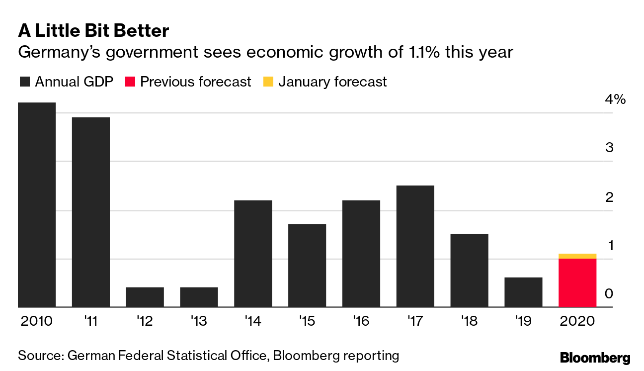 | Welcome to the Brussels Edition, Bloomberg's daily briefing on what matters most in the heart of the European Union. The U.S. could suffer its second setback in a week today, adding to signs of its waning influence, when the European Union unveils long-awaited guidelines around how to mitigate risks posed by 5G. A day after the U.K. risked a rift with Donald Trump by giving Huawei the green light to help develop some of Britain's 5G infrastructure, the EU is set to tell its member states to consider excluding high-risk suppliers from parts of their networks, but won't encourage a de facto ban of the Chinese company. American officials have been pushing allies to block Huawei entirely — but the measures leave enough room for interpretation to allow both the U.S. and China to save face. — Viktoria Dendrinou and Natalia Drozdiak What's Happening German Talks | Germany's ruling parties meet for coalition talks tonight to air some of the tension that's surfaced since Social Democratic leaders threatened to abandon the government if they didn't get concessions from Angela Merkel on investment spending and the minimum wage. But with their party polling near record lows, any demands for deep changes to economic policy have all but fizzled out. Taxing Tech | A Franco-American truce on a digital levy may be at stake in discussions between 137 countries meeting at the OECD today and tomorrow. If the talks fail to advance towards a global solution on taxing large tech companies, France will start collecting its national tax again in December — and likely face retaliatory tariffs from the U.S., which has called the planned levy discriminatory. Legally Bound | Europe wants to make its climate-neutrality goal irreversible under a new law that will be unveiled next month. The legislation will require all corners of the economy to take action and allow institutions to step in when the promises are broken, offering investors the certainty they need before backing unprecedented levels of financing. Wind Push | Developers for some of the world's biggest wind farms may get a boost under a strategy aimed at ensuring the industry makes a larger contribution to low-carbon power supplies. EU Energy chief Kadri Simson said in an interview that Brussels is working on measures to help offshore wind farms, which provide an increasingly cheap way to generate clean electricity. Meanwhile, the EU is mulling these options for a carbon tax. In Case You Missed It Justice Spat | The EU's top official for judicial affairs pressed Poland to help find a solution to their clash over the rule of law, which risks isolating the country from the rest of the bloc. The situation in Warsaw, where the government and judges are at odds with each other, could even threaten the EU's legal system by creating islands of ambiguity in which rulings aren't valid. Capital Issues | The ECB said six out of 109 banks it evaluated last year had a level of financial strength below what it wants to see for 2020 and asked for remedial actions. The assessment comes after a decade of steadily rising capital requirements intended to strengthen EU lenders, but which have added to headwinds from negative interest rates and a fragmented banking market. Feeling Ready | Bulgaria's efforts to adopt the euro have entered the "final stretch," its central bank chief said, as the country has kept its finances stable in a bid to join the single-currency waiting room and banking union by the end of April. The government is working to overcome concerns among euro members about exposure to a possible Greek-style sovereign-debt crisis or a money-laundering scandal akin to the recent crimes that originated in the Balkans. Greek Sale | Greece sold 15-year euro bonds for the first time since 2009 as the country seeks to return to normality following its debt crisis. The sale may signal that investors don't fear that Greece won't repay them once a European safety net expires, and could help Prime Minister Kyriakos Mitsotakis in his calls for greater fiscal space through lower surplus targets. Chart of the Day Germany's government sees economic growth of 1.1% this year, up from a previous projection of 1%, according to a person with direct knowledge of the matter who asked not to be named. The government's first major assessment of the economic situation this year comes amid signs that Germany is putting the worst of the recent slump behind it. The economy ministry is scheduled to publish its yearly economic report, including the 2020 forecast, today. Today's Agenda All times CET. - Press conference by EU Commission Vice-President Margrethe Vestager, Commissioner Thierry Breton and Croatian State Secretary Josip Bilaver on the 5G security toolbox