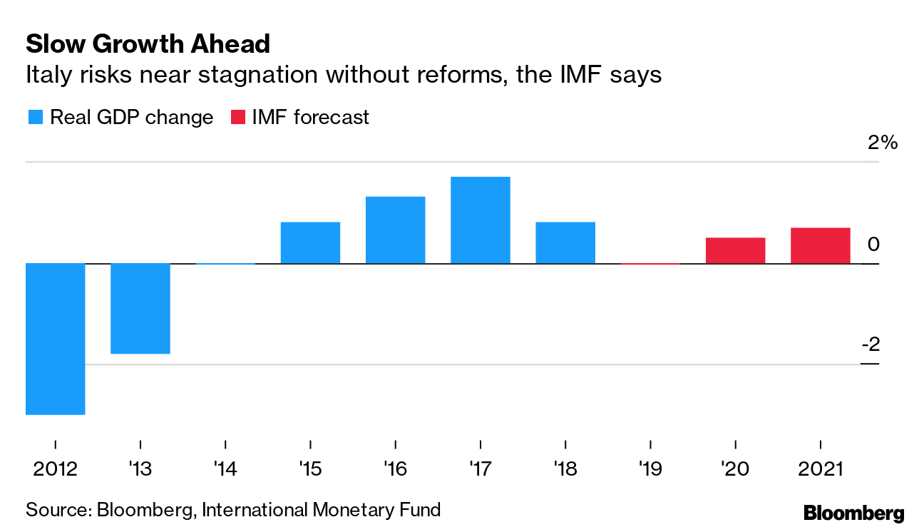 | Welcome to the Brussels Edition, Bloomberg's daily briefing on what matters most in the heart of the European Union. The euro-zone economy appears to have started the year with a tentative new lease of life, and data published today could provide more evidence of recovery. Economic confidence, based on the European Commission's monthly surveys of consumers and businesses, probably rose to a five-month high in January. Such an outcome would support the cautious optimism expressed by European Central Bank President Christine Lagarde last week, when she said incoming data suggest ongoing but moderate growth. Numbers on inflation and unemployment from Germany and on joblessness from Italy could offer further clues. —Viktoria Dendrinou and Craig Stirling What's Happening Pay-for-Delay | A day before Brexit day, the EU's highest court gives a binding ruling that could help resolve a British dispute between GlaxoSmithKline, generic drug makers and the U.K.'s antitrust watchdog. The decision could also weigh on pending EU court challenges over so-called pay-for-delay deals, that hold back sales of cheaper, generic versions of a certain drug. Social Visit | Mark Zuckerberg is slated to visit Brussels in mid-February as Facebook fends off antitrust and privacy scrutiny over how it handles data. His trip comes before the EU is due several days later to unveil its plans to deal with AI, and as the bloc seeks to be at the forefront of regulating large U.S. tech companies with strict competition enforcement and its flagship privacy rules. Late Honor | Mario Draghi will get Germany's Order of Merit this week though only after he left office, unlike former ECB presidents. If the delay in honoring him was intended to avoid controversy in a country where his ultra-loose stimulus embittered many citizens, it hasn't worked: an editorial in Bild called the accolade "the most expensive Order of Merit our country has ever awarded." Hard Part | The EU Parliament approved Boris Johnson's Brexit deal, clearing the way for the U.K. to leave the bloc on Jan. 31 with an agreement designed to avoid a chaotic rupture. But the fight over the divorce deal was the easy part. With 11 months of tricky negotiations on the future relationship coming up, potential clashes are everywhere you look. Here are five key ones. In Case You Missed It 5G Dodge | The EU stopped short of an outright ban of Chinese suppliers such as Huawei from lucrative 5G contracts, as warnings by the U.S. failed to convince its closest allies. The decision represents an effort to navigate between Beijing's warnings of repercussions and U.S. threats of sanctions, such as a reduction in intelligence sharing. Spanish Uncertainty | Catalonia's separatist President Joaquim Torra said he'd set a date for elections after the regional parliament passes a budget, adding another element of instability by bringing his two-year-old administration to an end. The decision to call elections means is another headache for Spanish Prime Minister Pedro Sanchez, who is reliant on the support of the separatists of Esquerra Republicana. Better Numbers | Germany raised its 2020 growth projection and pledged investment to keep the economy competitive as it turns more digital and climate-aware. Angela Merkel's cabinet also approved legislation that sets out the timetable to close more than 100 coal power plants across Germany, entrenching the most important part of a program to make Europe's biggest economy greener. Romanian Health | The gruesome death of a cancer patient in Bucharest highlights Romania's chronic underfunding of health care and the corruption that's eating away at what remains of the system. The decay resonates beyond the country's borders, driving thousands to emigrate to Europe's west each year and stoking populism and creating uncertain economic prospects back home. Chart of the Day Italy's crippling public debt is set to keep expanding amid chronically low economic growth, according to the International Monetary Fund. While the country has benefited from the ECB's expansionary monetary policy and a period of relative political stability to bring down yields, its interest costs are still higher than its economic growth, forcing it to issue new bonds, and reduce spending and investment. Today's Agenda All times CET. - 9 a.m. Keynote speech by SSM's Enria at 5th SSM & EBF Boardroom Dialogue in Frankfurt