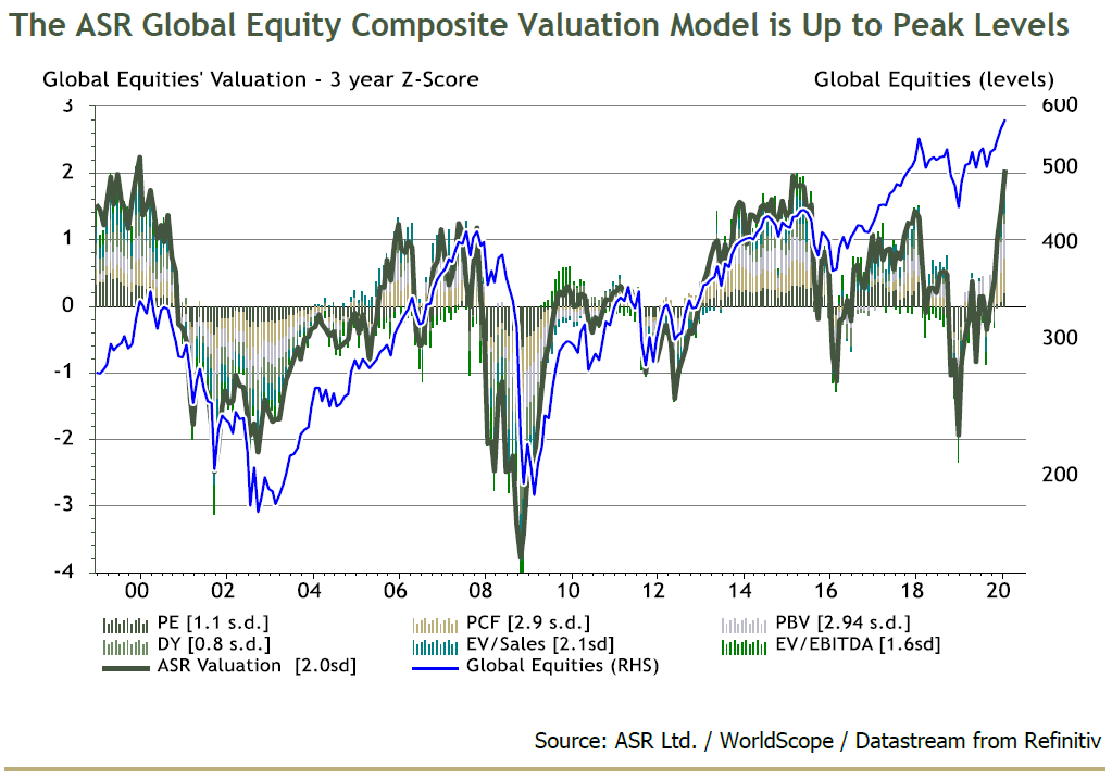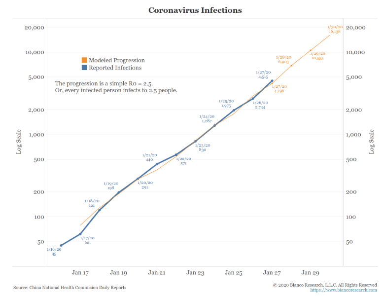 Vincent Catalano, now chief markets strategist at Stuyvesant Capital Management Corp. in New York, asked sarcastically: "What happened? I must have missed it. Did they find a cure? Or was the disease financialmediaitis: For every effect there must be a cause?" I think Catalano's point is well made. The financial media is often guilty of trying too hard to attribute every market move to some specific item of news. But he did agree with me that perhaps it is best to say that the coronavirus provided an excuse to sell stocks, rather than a reason. And with valuations looking excessive, particularly in the U.S., selling some stock is appealing. It is never a bad idea to sell something for more than it is worth. How excessive are valuations? This chart, which smooshes together several different measures of global stock valuation, expresses it as well as anything. It comes from Ian Harnett of Absolute Strategy Research Ltd. in London: All the measures that went into this chart are expressed in terms of their standard deviation from the norm. Earnings at present look as though they are on unsustainable tear, supported by strong profit margins, so price-earnings multiples don't seem excessive. But multiples of cash flow, sales and book value all look extreme. Put them together and, on this basis at any rate, stocks haven't been this overvalued since the top of the dot-com boom 20 years ago. An excuse to take some profits was welcome. Meanwhile, BCA Research of Toronto has its own composite measure of short-term sentiment. On this basis, U.S. stocks looked almost as overbought as they had been at any stage in the post-crisis decade. The put-call ratio, showing the balance between those positioning for future gains and losses through the options market, in particular shows pessimism at its lowest since 2011. So, again, an excuse to sell was welcome. So we shouldn't be too excited about the market reaction on Monday. As Richard Bernstein of Richard Bernstein Advisors puts it, "Bad news is often shrugged off earlier in a market cycle, but can more easily accentuate volatility in late cycles when valuations are stretched and leadership narrows." This is, incidentally, reason to expect higher volatility this time around than during the 2003 SARS outbreak, which came at a market bottom, when many were preoccupied by the U.S. invasion of Iraq. The fact that volatility is only to be expected doesn't give any great cause for comfort about the epidemic. The coronavirus is so scary precisely because the risk is so difficult to measure. It might conceivably transform the global economy. That is very unlikely, but it is impossible to measure exactly how unlikely. So while there is little to be gained from panicking (other than crystallizing some nice gains in the U.S. equity market, perhaps), it is still wise to keep a close eye on the progress of the epidemic. So what guidelines are there for the future of the coronavirus? Jim Bianco, president and founder of Bianco Research LLC in Chicago (and a Bloomberg Opinion contributor), shows that the spread of this epidemic, like any other, has been geometric. Thus, if we put new cases on a log scale, they look like an almost perfectly straight line: The bad news is that we can expect this geometric progression to continue for a while. That implies much human pain, but as the efforts to contain the spread have only just started, it is inevitable. The good news, from the point of view of investors, is that this gives those of us without medical expertise some handle on how to judge the spread of the virus. If this menacing line of reported infections begins to have a shallower slope, that should be good evidence that the outbreak is beginning to come under control. That in turn should mean (cold-blooded cynical investor alert) that there should be a buying opportunity. Similar epidemics showed that this point when the spread began to be contained came after about three weeks. That should offer a good rule of thumb for investors. If the line on this graph is still a perfectly straight upward slant by the last week of February, therefore, it should be time to get very worried indeed, and to start looking at the possibility that this epidemic does serious economic damage. If the disease really does keep spreading like that for another month, we can expect that the outcry in the population as a whole will be deafening by then. Finance won't be the greatest of our concerns. But just to repeat the usual caveats; I am not a doctor, and I don't even play one on TV (or any other Bloomberg outlet). And there is no reason at present to assume that the situation in a month's time will be so dark. For now, as an investment commentator, I would continue to say that there is little reason to do anything about coronavirus, barring a nudge down in expectations for Chinese growth in this quarter, and a nudge down in the likely level of the Chinese currency. There is no need to react to any other bad news until it actually happens. FOMC I checked my calendar and suddenly realized that we will be hearing from the Federal Open Market Committee on Wednesday. This will be one of the least-heralded monetary policy meetings of recent years, which is always good news for central bankers. Nobody much expects any moves in interest rates, while the expansion of the Fed's balance sheet since the overnight repo market grew angry four months ago has persuaded many that the stock market is safe again. This month's FOMC is unlikely to make much news. That doesn't mean, however, that it can safely be ignored. And it certainly doesn't mean that the Fed's governors have nothing to worry about. As Brian Chappatta points out in Bloomberg Opinion, the Fed still has a lot of explaining to do about its balance sheet operations, now almost universally known as "Not QE." It might help the Fed's credibility if it stopped denying that these moves are quantitative easing and accepted that they are having the same