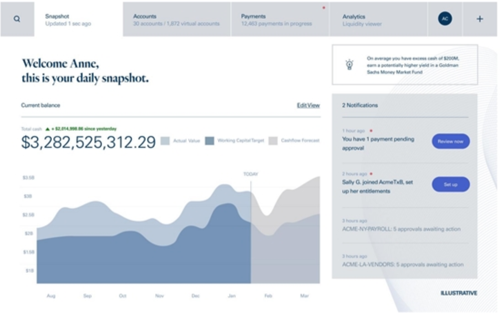 Transaction banking One thing you could do if you're a big bank is, like, companies give you their money, and you hold on to it for them, and you give them a website where they can log in and see how much money they have, and when they need to pay their workers or suppliers or whatever, they tell you to do it and you send the money. This is, roughly, called "transaction banking." It's pretty standard? There are ways to innovate in this business, or make it more complicated (you can pay their foreign suppliers in foreign currency, you can automatically advance them some money to pay suppliers even if they don't have it yet, you can make the website better), and of course there are ways to make it risky (you take their money and invest it in Bitcoin or Ponzi schemes, or steal it), but the basic idea would be familiar to medieval bankers. They give you money, you hold it for them, you give it back when they need it. Obviously it is a big business because there are lots of companies and they have lots of money and they have to pay lots of employees and suppliers and so forth. Many other banking businesses are lumpy and unpredictable and specialized: Most years, most companies won't need to take out a syndicated loan or issue bonds or raise equity or do a merger, and they almost never need to do complex derivatives. But every company needs a checking account every day. Goldman Sachs Group Inc. is holding its first investor day today. (Disclosure, I used to work at Goldman, selling complex derivatives to corporate clients who almost never wanted them, oops.) Here is the presentation. It is long and about a lot of things, but there is a slide (slide 16 of the first presentation) listing "four areas of focus." They are "transaction banking," "third party alternatives," "digital consumer bank" and "wealth management." These are all, as, like, the history of Goldman Sachs goes, pretty boring, but transaction banking is somehow both the most boring and the one they might be most excited about. Later (slide 15 of the fourth presentation, on investment banking) Goldman points out that this is a big business ("Attractive Addressable Market" with "$5tn US Corporate Deposits"), so "Small Market Share Can Generate Meaningful Economics." Also it provides "Stable, More-Durable Revenues," "Expense Savings" and "Funding Diversification," and is "Synergistic with Broader Strategy." They like it. But then the slide gets to the "Strong Client Value Proposition" and it's like "fast and easy onboarding" and "modern tools and simple processes." The pitch here is that Goldman will compete effectively to manage companies' cash for them because it will build a good website. In fact the next slide (slide 16) is a picture of that website. "Welcome Anne, this is your daily snapshot," it says. Anne has $3.28 billion in the bank, good for her: Source: Goldman Sachs Group Inc. Source: Goldman Sachs Group Inc. There's a lightbulb over on the right suggesting that that number might be a little high, and that she should consider moving some of it to a Goldman Sachs money market fund. "Synergistic with Broader Strategy"! It feels a little like, having rolled out a simple user-friendly consumer banking website to offer people savings accounts, they were like "well we have this website, might as well use it to offer companies checking accounts." One way to interpret this is that Goldman has embarked on a quest to be boring. This interpretation seems plainly correct. The old Goldman approach—making a lot of money on lumpy investment-banking fees, risky balance-sheet-intensive trading, and both-lumpy-and-risky principal investing—is disfavored in modern banking. It is disfavored by regulation (the Volcker Rule, capital requirements) and by market conditions, but it is also particularly disfavored by Goldman's own investors, who want reliable recurring revenues. Also it is just, in the scheme of things, sort of niche. You can only get so big by advising on mergers and trading derivatives for hedge funds. You can get plenty rich that way—your revenues per employee can be high—but if you want to be a giant bank you need to find ways to touch everyone's money, every day. Consumer banking. Transaction banking. Wealth management. "The PE firms are the new Goldman Sachs," an investor told the Financial Times, while "Goldman Sachs is trying to be JPMorgan." JPMorgan is really big! The path to bigness is not in specialized high-value-add niche financial services. The path to bigness is, like, everyone gives you their money and you hang on to it for them etc. In different ways, Goldman is moving into relatively mass-market businesses, which are also relatively boring businesses. The way you win is not by brilliantly structuring complicated trades or by having nerves of steel to manage complex risks, but by having a fast and easy onboarding process and a nice website. I talk sometimes around here about post-financial-crisis regulation as an attempt to change the culture of banking. Banning proprietary trading is not specifically about the financial risk of prop trading; it's about getting people who like taking proprietary risk out of positions of power at big banks. One obvious interpretation here is that this attempt worked, amazingly well, and now Goldman has pivoted from taking complex proprietary risks to designing user-friendly websites. (The fact that Goldman is in the early years of management by David Solomon, who came from investment banking, and who replaced Lloyd Blankfein, who came from sales and trading, is also a good place to look to explain the cultural shift.) Again: This interpretation seems correct. But I want to mention another interpretation. It goes something like this. Goldman is, in this theory, an incorrigible generator of financial interestingness. It hires smart people who share a certain adventurousness about risk and financial structuring. They like to do weird stuff. Compared to other big banks, they ha