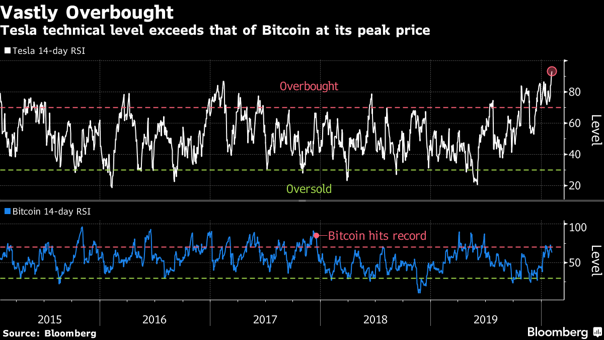 | Welcome to your morning markets update, delivered every weekday before the European open. Good morning. Tensions flared at the U.S. president's State of the Union address, Tesla Inc.'s rally is leaving Wall Street in awe, European earnings are rolling in and Asian stocks posted back-to-back gains. Here's what's moving markets. Trump's Address Donald Trump struck a characteristically triumphant tone in Tuesday's State of the Union address, staking his bid for re-election squarely on the U.S. economy on the eve of his likely acquittal in the Senate's impeachment trial. Tensions between the president and Nancy Pelosi were visible, with the House speaker seen ripping up a printed transcript of his speech. The address came on the same day a report said the U.S. is mulling a plan to withdraw from a global pact worth $1.7 trillion in government contracts, while over in Iowa, Pete Buttigieg maintained his lead in the Democratic caucuses following delays in reporting results. Tesla's Tear Tesla's rapid share surge is making headlines, with the market value of Elon Musk's electric-car company having more than doubled since the start of the year. Comparisons with old-school names like Ford Motor Co. continue. Ford, founded 100 years before the California-based group, slumped after projecting lower-than-expected profit last night, leaving its market value at about a quarter of Tesla's. There's still plenty for the bears to hold onto, however, with some noting that the stock is now more overbought than Bitcoin was at the height of its "bubble." Even Musk himself would short Tesla if he could, according to closely followed Citron Research. Earnings Arrive A big European earnings day has already begun with Germany's Siemens AG warning a market slump is set to continue amid a steep decline in the automotive, machine-building and energy businesses. French bank BNP Paribas SA posted a near 63% jump in fixed-income trading revenue after a rebound in rates and foreign-exchange activity, while Swiss engineering group ABB Ltd. joined a raft of companies to flag the potential for the coronavirus to impact their businesses. There's a swathe of reports still to come today, including from pharmaceutical giants Novo Nordisk A/S and GlaxoSmithKline Plc, and telecoms group Vodafone Group Plc. Back-to-Back Gains Asian stocks headed for their first back-to-back daily gains since fears about the coronavirus deepened last month, with some investors optimistic the impact to the global economy will prove short-lived, even as China's death toll continues to climb. The majority of reported cases and almost all the deaths are in the area where it started -- the Chinese city of Wuhan and surrounding Hubei province, but even so, kids visiting Tokyo Disney might want to forget about hugging their favorite oversize mascots. And for investors, while the outbreak has spurred much volatility, it's as if nobody told the foreign-exchange market. Coming Up… In New York later, Snapchat owner Snap Inc. and Tinder parent Match Group Inc. could both be in for significant share price drops after disappointing earnings reports last night. In this region, European Central Bank Vice President Luis de Guindos speaks in Frankfurt amid questions over the institution's inflation target, and Poland's central bank is expected to leave its interest rates unchanged. In macro data, we'll get composite purchasing managers index numbers from the euro area and the U.K. What We've Been Reading This is what's caught our eye over the past 24 hours. And finally, here's what Cormac Mullen is interested in this morning Optimism swept the U.S. stock market and technology shares in particular on Tuesday. The Nasdaq's new record high was a pretty clear indication that a significant cohort of equity investors think concerns about the coronavirus are overblown. Once again buy-the-dip has proved the correct call -- how can you argue with an index that has just rebounded to an all-time high. Still, we need to talk about the elephant in the room -- and it's a big one -- the U.S. bond market. With benchmark Treasury yields still trading below 1.6%, it's clear a significant number of bond investors disagree with their equity cousins. The limited move upwards in bond yields suggests it would be unwise to chase the surge in stocks higher, at least for now. Further evidence that the anomaly is more on the equity side than the bond side is of course the move in Tesla. With all the caveats that come with the name -- short interest levels, momentum traders, outspoken bulls and bears -- it's hard not to see its parabolic rise as completely divorced from fundamentals. As my colleague Nancy Moran points out, Tesla is now more overbought than Bitcoin was at its peak in December 2017. Cormac Mullen is a Cross-Asset reporter and editor for Bloomberg News in Tokyo. Like Bloomberg's Five Things? Subscribe for unlimited access to trusted, data-based journalism in 120 countries around the world and gain expert analysis from exclusive daily newsletters, The Bloomberg Open and The Bloomberg Close. |