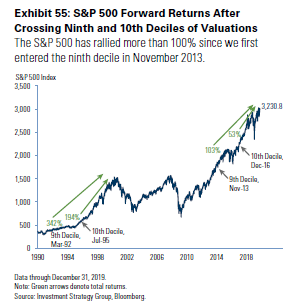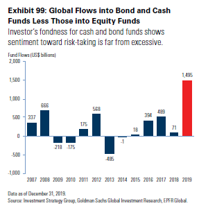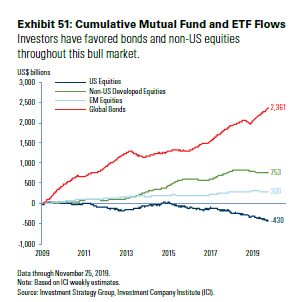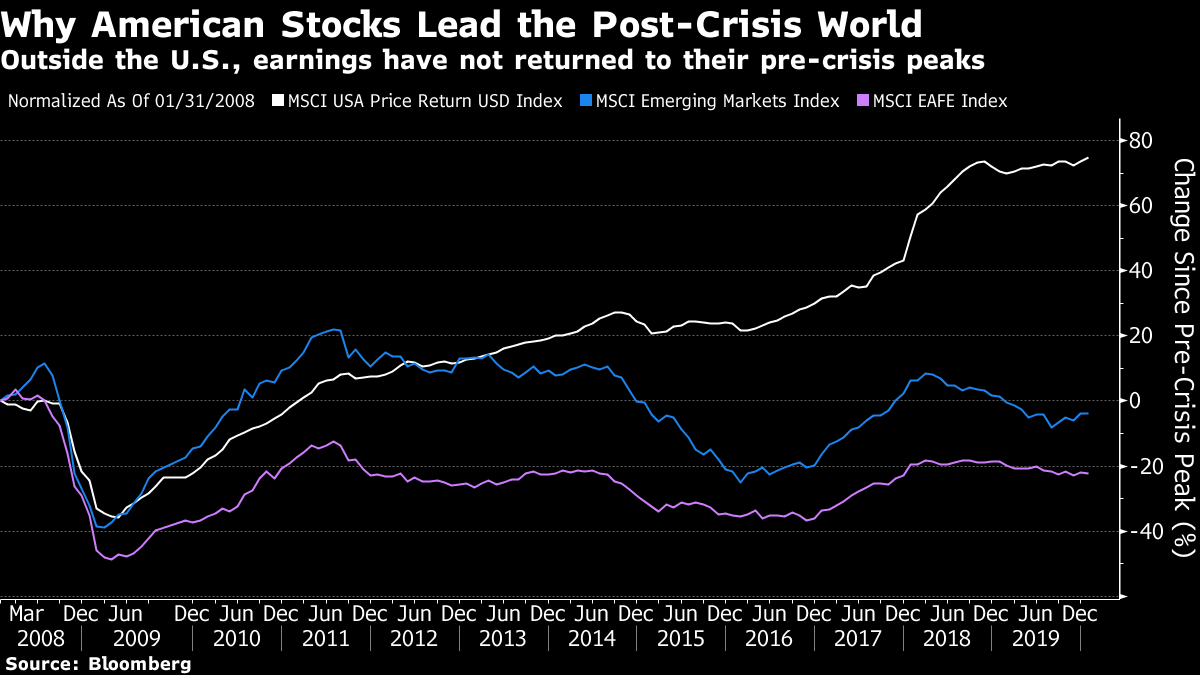 America Ascendant, Goldman Ascendant U.S. stock markets have far outpaced the rest of the world since the crisis. They have done so relentlessly and consistently. In the process, stocks have grown very expensive by conventional metrics. Most stock markets in the rest of the world have not. This leads many (including me) to fear that we are due for a big reversion to the norm. The U.S. cannot stay dominant that long. I have been making variations on this argument for many years now, and they have all been wrong. (Or, at least, too early — and any Wall Streeter will tell you that means the same thing.) So I was glad of the opportunity to talk to Goldman Sachs Group Inc.'s Sharmin Mossavar-Rahmani, who has for years been the CIO of the bank's investment strategy group, and has year after year since the crisis been making the same two-part call: stay invested in stocks, and expect America to remain preeminent. I have a strong inclination to dismiss this as an investment bank's natural urge to be bullish at every opportunity, but unfortunately for me this call turns out to have been correct so far. The latest outlook from Mossavar-Rahmani's team is called "Room to Grow" and features a baobab tree on the cover, because such trees can keep growing for centuries. So nobody can fault them for hedging their bets. The first stage in the argument is that, very simply, U.S. companies have managed to increase their earnings in a big way since the crisis. Companies in the emerging world, and in the rest of the developing world, have not. She is right about this. This is in part because the FAANG internet giants come from the U.S., and now make large chunks of their profits elsewhere, but that doesn't affect the argument for buying equities from the U.S. rather than elsewhere. This chart compares 12-month forward earnings for MSCI's indexes of the U.S., emerging markets, and EAFE (Europe, Australia and the Far East): Beyond that, there is exorbitant privilege. If investors want a shelter, where can they find it other than in the U.S.? Both the euro zone, thanks to its sovereign debt crisis, and arguably also China, with its badly mismanaged currency devaluations of 2015 and 2016, have shown that they cannot match American assets as a shelter. The U.S. is still the place to go in a crisis. This was rammed home in 2011, when investors sought shelter from the shocking decision by Standard & Poor's to downgrade U.S. Treasury debt from AAA by buying Treasuries. The Goldman team argues that the coronavirus outbreak only serves to underline continuing American preeminence. Even if Peak Fear about the virus in markets passed some two weeks ago, Mossavar-Rahmani suggests that the market has been too sanguine, and that the outbreak will serve to underline American advantages. Growth in the U.S. is more insulated from China now than it was in the growth scare that followed the 2015 Chinese devaluation, and financial conditions are easier now. Taking all this into account, Mossavar-Rahmani argues that U.S. equities are fair value compared to equities in the rest of the world. I have argued against this over the years, and American stocks have continued to perform better, so I give this case due deference. Here are some more Goldman-hued pearls of wisdom: Don't worry about fund flows The long U.S. equity bull market is definitely not about the weight of money from investors, at least as viewed through the prism of mutual funds and exchange-traded funds. Throughout the post-crisis era they have poured money into bonds and, to a lesser extent, emerging markets and non-U.S. developed equities, while pulling money out of the American stock market: Way back in the late 1990s, when the U.S. Baby Boomers were into their fifties and beginning to pour money into mutual funds to save for retirement, many of us used to look at the inflows into equity mutual funds with deep anxiety. The fear was that investors might lose interest, or panic at the first sign of trouble, and pull money out, causing a bear market or a crash. We need not have worried. Throughout the crisis, investors have churned far more money into bonds than stocks, and the equity bull market has roared on regardless: Yes, central banks should spark the manufacturers back to life Entering the year, it was a popular call that the global manufacturing slowdown had hit bottom, and that a rebound would soon start. Some awful numbers out of the euro zone, plus the deus ex machina of the coronavirus from Wuhan, have made that look silly. But the weight of central banks cutting last year meant that it looked a safe bet that manufacturing would soon recover, as this chart shows. Viruses may yet get the better of central bankers, but as it stands, it is probably best not to fight the Fed (and many other central banks); a manufacturing recovery, viruses permitting, is likely: Mean reversion, shmean reversion Mean reversion is a basic and important notion of investment. When any given metric moves a long way from its historical norm, you have a choice between predicting that it will revert to the mean over time, or saying "it's different this time." But in real time, betting on mean reversion could still have deprived us of a lot of money over the last few decades. This chart shows returns made after entering the ninth and tenth deciles of valuation in the late 1990s bull markets, and in the current one. Mean reversion can take a long time to happen, while you sit and watch in horror at all the money you might have made. U.S. stocks are expensive but not in a bubble I agree with this particular insight, although I am nervous about how far we should take it. It is a good idea to start taking profits toward the top of a bull market, just as it is also a good idea to get out quick before a bubble bursts. But the basic point of Goldman's graphic is sound. On almost any sensible measure, the U.S. stock market does look expensive compared to historic norms, but it doesn't look 
