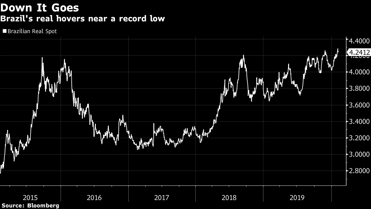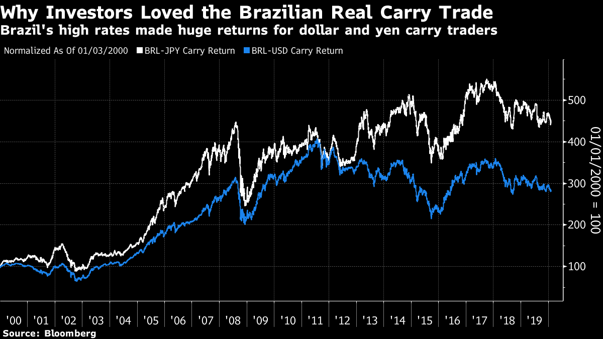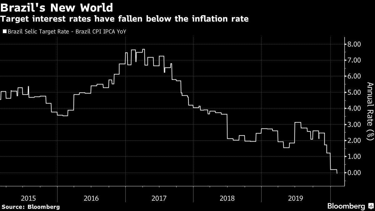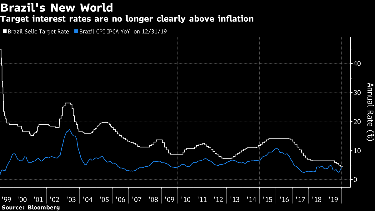 Make of this what you will. Maybe Bono was trying to offer us some investment advice. Or maybe it's gibberish. Probably the latter, but I commend it to your attention. Somewhere in there is a good description of the latest action on world markets. And as I know a lot of people can't abide anything by U2, I've spared you the risk of listening to this by accident. A Little Less Coffee in Brazil It isn't just in the U.S. that financial conditions are easy. Down in Sao Paulo, Brazil's central bank has just announced a cut in its target overnight rate known as the Selic, and this has brought it to a historic and symbolic milestone. The Selic has just dropped below the latest recorded level for consumer price inflation. So on the face of, Brazilian real interest rates are now negative: This is a startling victory over inflation. Long a happy destination for "carry traders," Brazil's economic policymakers no longer seem preoccupied by inflation, but by growth; and that challenges many investors' presumptions. To be clear about this, it isn't long since the Selic was 7 percentage points above the most recent level of inflation: It is hard to overstate how big a change this is. For the years ahead of the financial crisis, and for a number of years after it, the Brazilian carry trade was one of the most reliable ways for macro investors to make money. Borrowing in yen or even dollars and parking in the real made big profits, and also helped keep Brazil's currency unrealistically expensive. Note that it was a Brazilian finance minister who first complained about "currency wars." The profits for the carry traders were huge, and they are now gone: Defending the currency isn't as important as it used to be, and policymakers made their cut even through the real is hovering near a record low: It is easy to miss this historic moment amid so many other events around the world. Low rates have even conquered Latin America, where a number of the region's central banks have reached the point where they are "out of ammunition" — effectively unable to cut rates any further. The Brazilian central bank's monetary policy committee, known as Copom, has "closed the door" on further rate cuts this year, while forecasting that inflation will be 3.5% by year's end — which for Brazil is very low. With commodity prices low and likely to stay that way thanks to the coronavirus's effect on China, the traditional risk of an overheating economy in Brazil is nil. Instead, rates have been cut as far as the central bankers dare, in the hope of heading off stagnation. When even Brazil can cut target rates down to the inflation level, something very strange is afoot with the global economy. Victory over inflation isn't unalloyed good news. The International Monetary Fund expects final 2019 GDP growth for Latin America of 0.1%, which is dreadful. For more on this, you might view this discussion I had last week with Alejandro Werner, director for the western hemisphere at the IMF, at a New York meeting of the Americas Society/Council of the Americas. Like the U2 song, this might not be to everyone's taste, but it is very relevant for anyone interested in investing in Latin America. Like Bloomberg's Points of Return? Subscribe for unlimited access to trusted, data-based journalism in 120 countries around the world and gain expert analysis from exclusive daily newsletters, The Bloomberg Open and The Bloomberg Close. |