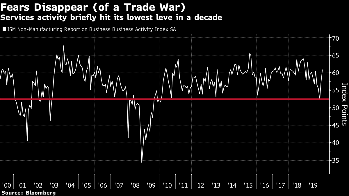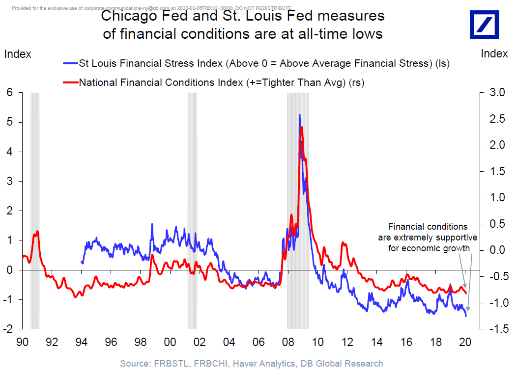 We can partly attribute the mood to the incoming economic data. Non-farm payrolls for January are still to come, but this week's data so far has largely reassured people that the U.S., and to a lesser extent Europe, had managed to recover from their last great fear emanating from China, a trade war. Manufacturing surveys are recovering from an alarmingly weak position. And the non-manufacturing survey today suggested business activity has completed a startling rebound, after briefly going into its worst funk in a decade as the trade talks intensified: Even if the current scare is yet to be resolved, then, there is at least joy to be had from the end of the last one. We can all breathe more easily. Meanwhile, the effect of that scare, and the current one, has been to reduce financial stress to a remarkable extent. Both the Chicago and St Louis Federal Reserve banks maintain their own measures of financial stress, including gauges of bank credit and bond yields among others. And both agree that financial conditions are as easy as they have ever been since they started tracking them. This chart from Deutsche Bank AG's economist Torsten Slok combines both measures: If conditions are that easy, of course people are in the mood to buy relatively risky assets, like stocks. Moreover, the belief is that the Federal Reserve — and many other central banks — is backed into a position where the only way it can move for the rest of this year is toward even easier conditions. In other words, it is definitely safe go back into the murky water. Why is it so safe? In part, the ongoing risks created by the virus outbreak bind the hands of any central bank that might have been tempted to try tightening financial conditions. Secondly, the Fed has boxed itself in. It is now making clear that its 2% inflation target is "symmetrical", and not a tight upper limit, making it all the harder to justify raising rates. With an election coming in November, and the Fed wanting to avoid the politically contentious step of raising rates during a campaign, investors are working on the assumption that the risks, unlike the Fed's inflation target, are asymmetric. Rates might go down, but there is no way they will rise. And so, the S&P 500 is back at a new record. P.S. One postscript: For those who don't click on the links, they often go to videos and songs I enjoy. Sometimes their relevance is tenuous, but I know that some readers enjoy them. The link on the word "breathe" is to a little-known U2 song of that name, which I hadn't listened to for a while. The lyrics turn out to be most relevant. This is the third verse: Sixteen of June, Chinese stocks are going up And I'm coming down with some new Asian virus Ju Ju man, Ju Ju man Doc says you're fine, or dying Please Nine-oh-nine, St. John Divine on the line, my pulse is fine But I'm running down the road like loose electricity While the band in my head plays a striptease