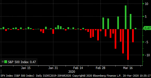 | Markets bounce, virus measures tighten, and Mnuchin asks Congress to hurry. A little risk on After yesterday's relatively calm day in U.S. markets — by recent standards anyway — global markets are moving higher today. Benchmark indexes in South Korea and Taiwan jumped more than 6% overnight, helping to lift the MSCI Asia Pacific Index 3.2%. Japan was closed for a holiday. In Europe, the Stoxx 600 Index was 4.5% higher at 5:40 a.m. Eastern Time with every sector of the gauge posting strong gains. S&P 500 futures pointed to a bounce at the open, the 10-year Treasury yield was at 1.05% and gold was higher. Dollar slide The greenback slumped, losing ground against every major currency after it had gained 8% in the previous eight sessions. Analysts are flagging concerns that the coronavirus outbreak in the U.S. may prove to be worse than feared, pushing the country into a recession and possibly a depression, hitting demand for the currency. On the supply side, the increased number of swap lines opened by the Federal Reserve with other central banks, aimed at reducing the international shortage, are also helping push the dollar lower. Tightening restrictions California introduced the most restrictive measures yet to fight the spread of the pandemic in the U.S., ordering all of the state's 40 million residents to go into home isolation. Businesses deemed non-essential will be shut and people only allowed out to stock up on essentials. The move comes as the World Health Organization said the virus is now infecting people at a faster pace with the global death toll topping 10,000, according to data from Johns Hopkins University. Outside the U.S., Italy is set to reinforce and extend its near-total lockdown of the economy, while the U.K. will announce new measures in an attempt to save millions of jobs. Hurry up Treasury Secretary Steven Mnuchin urged Senate Majority Leader Mitch McConnell and House Speaker Nancy Pelosi to move fast to pass a second package of support measures, warning them that major parts of the economy are already shut down. He said that the objection is to have legislation through Congress and signed by President Donald Trump on Monday. The package announced by the Senate includes tax rebates of $1,200 to individuals targeted at those earning under $99,000 and $208 billion of loans for companies suffering from the outbreak. Coming up… Once again the economic data available today is probably going to look a little stale to markets with January retail sales for Canada at 8:30 a.m. and U.S. existing home sales numbers for February published at 10:00 a.m. There may be more to see for under-pressure oil traders in the Baker-Hughes rigcount number at 1:30 p.m. In dollar liquidity, it is a big day for Fed repo, with $1.5 trillion on offer across three different operations today. The one number that everyone is hanging on at the moment is jobless claims, with yesterday's print showing a 70,000 increase, and Goldman Sachs Group Inc. warning that it could surge to a record 2.25 million for this week, with that data published next Thursday. What we've been reading This is what's caught our eye over the last 24 hours. And finally, here's what Joe's interested in this morning Back in late January (ahh the good old days), I wrote about the dizzying rise we were seeing in shares of Tesla, and why it wasn't evidence of a bubble, or even really that weird. Even with the crash of virtually everything since then, I stand by my reasoning. The way I was thinking about Tesla at the time was that basically there seemed to be a binariness to its future. Either it was on its way to becoming the Apple of electric cars, or it would go bankrupt. Obviously there was and is a plausible middle path where it ended up as one of a handful of successful electric vehicle manufacturers but by and large, investors and traders tend to fall into one extreme camp or the other: domination or collapse. As such, you could think of Tesla shares as kind of being a call option on the domination scenario, and as anyone who knows anything about options understands, just a minor change in the underlying conditions can radically change the price of the option. Because of the inherent volatility and wide swings, you typically don't have people making price targets on options the same way you have people making price targets on stocks. And true enough, most sell-side analysts really never have been able to come up with a realistic Tesla valuation. It's just too inherently volatile. And now fast forward to today, and hopefully you can anticipate where I was going with the Tesla analogy. Across virtually every asset class in the entire world, we're seeing historic levels of volatility. Five percent moves in either direction are de rigueur. Circuit breakers being triggered left and right. I lost track of the times I read the phrases "since 1987" or "since the Great Financial Crisis" over the past two weeks. There is no modern precedent in the market for the virus. There's a war on, but there's not an opposing army, and we don't know if we have the tools to fight it. There's a collapse in spending, but we don't actually want stimulus for the time being. It is all extremely unusual to say the least. Plus modern life itself is changing at a rapid pace. So many things are literally shutting down, including even states holding postponing primaries. So at some level, the virus is stress testing the entire socio-economic and political system all at once. As my friend Nathan Tankus recently put it, "this is so pedal to the metal for socialism or barbarism it's nuts." I'm not totally sure that those are really the only two outcomes for us, but his phrase still captures something important, which is the seeming binariness of the moment. Does our system melt down or does it not? Some days, between the data itself (the various curves) and the political response, it looks like we might get away with a short and severe shock to the syste