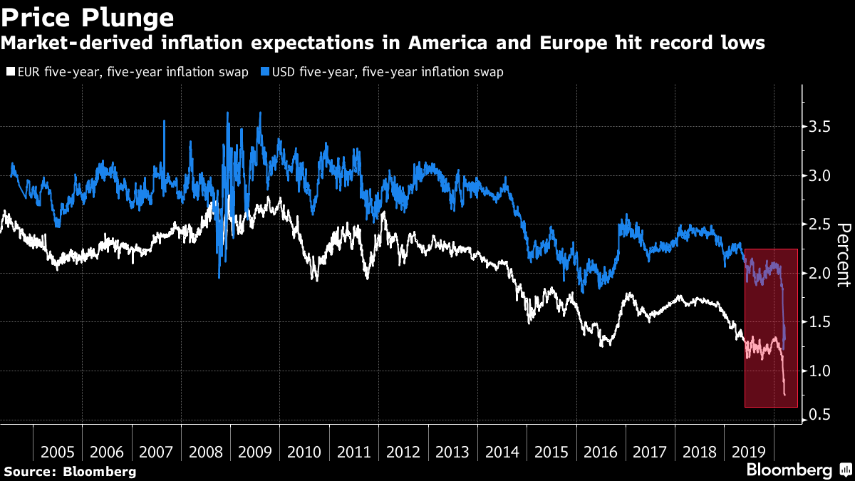 | Traders brace for more market mayhem as policy makers race to cushion the economic blow from the coronavirus, Australia shuts its pubs, restaurants and cafes, and China begins to talk up green shoots in its economy. Here are some of the things people in markets are talking about today. More Market Pain The dollar slipped in early trading in Asia on Monday as investors took stock of the latest developments on the coronavirus's spread and more stringent measures from countries to control it. The New Zealand dollar fell after its central bank joined other countries in saying it will start buying bonds to stimulate the economy. The yen and Swiss franc edged up against the greenback. U.S. equity futures extended losses to trade limit down Monday after the S&P 500 lost more than 4% on Friday, when Asian futures signaled more declines to come. As investors attempt to assess the severity of the upcoming downturn, Federal Reserve Bank of St. Louis President James Bullard predicted the U.S. unemployment rate may hit 30% in the second quarter because of shutdowns to combat the virus. And Morgan Stanley economists said the coronavirus will inflict a deeper recession on the U.S. than previously expected, including a record 30.1% drop in gross domestic product in the second quarter. China Talks Up Economy China's government is talking up the prospects for a rapid economic rebound from the coronavirus, even as the global economy sees further lockdowns to curb the spreading disease. Since Friday, the premier, who leads economic policy making, and a senior central-bank official, have pointed to the control of the outbreak and the resumption of activity as reasons for optimism with regards to China's outlook. At the same time, the nation is facing the risk of further job losses and slumping external demand as the U.S., the U.K. and the European Union all tighten restrictions on human activity as the virus exacts a rising death toll. Economists expect China to post the slowest growth since the end of the Mao era this year. Australia Closes Venues Australia will enforce more stringent controls to slow the spread of the coronavirus, closing pubs, casinos, restaurants and other venues from Monday after the number of infections surged past 1,000. Prime Minister Scott Morrison said authorities were compelled to ramp up their response after many Australians flouted social-distance guidelines, with thousands of people flocking to beaches at the weekend and socializing in bars. Classrooms should remain open until the end of this term, though parents could take their children out of school if they preferred, Morrison said. Casinos, nightclubs, gyms, churches and other places of worship are among other venues that will be closed under the Stage 1 measures that will be reviewed monthly. How RBA's Easing Backfired Just when investors thought central banks were beginning to calm a global bond rout, the epicenter of chaos shifted to Australia as its market went into meltdown on March 19. The trigger was the announcement of the country's own quantitative easing program, which should have soothed nerves, not frayed them. The episode underscores the continuing vulnerability of markets as policy makers push into uncharted territory to protect their economies from a viral pandemic they have never faced before. While the worst of the violent price moves were over in minutes, the impact is still reverberating. Low liquidity, algorithmic trading and a mismatch between investor expectations and the central bank's plan all played a role. Merkel in Quarantine Angela Merkel's ability to effectively direct Germany's coronavirus response was thrown into question after the chancellor quarantined herself at home following contact with a doctor who later tested positive for the disease. The doctor gave Merkel, 65, a precautionary immunization against bacterial pneumonia on Friday and the chancellor decided to self-isolate once she learned of his positive test, government spokesman Steffen Seibert said Sunday. Merkel, who suffered a health scare last year with unexplained shaking fits, will be regularly tested in coming days and perform her duties from home, Seibert added. Meanwhile, Germany banned gatherings of more than two people. Keep up to date with all the latest virus news here. What we've been reading This is what's caught our eye over the last 24 hours. And finally, here's what Tracy's interested in this morning In the aftermath of the 2008 financial crisis, some analysts warned that quantitative easing would result in massive inflation. It didn't, of course, and after years of price increases that have tended to come in below central banks' targets, warning about inflation has basically fallen out of economic fashion. So, enter Oliver Harvey and Robin Winkler, two Deutsche Bank strategists who mount a rare inflationist argument in a note published on Friday. That argument is that while the coronavirus is both a supply and a demand shock, trying to boost demand (giving everyone money to spend) while keeping supply fixed (telling people to work from home, or not go into work at all) will inevitably result in price increases, as well as worker shortages that push the cost of labor up. Or, as they put it: "What matters is that at present supply is inelastic — unlike in traditional Keynesian formulations — because while the government might be handing out $100 bills, it won't be allowing workers to work regular days, restarting flights or reopening factories until the virus subsides." Of course, the riposte to the above is that the uncertainty caused by the coronavirus is likely to lead to a much larger-than-anticipated dent on demand (one that cannot be offset completely by fiscal measures) and potentially a permanent loss of output. Judging by market-based measures of inflation expectations — now hovering at record lows — the inflationist argument isn't convincing many just yet. You can follow Bloomberg's Tracy Alloway a