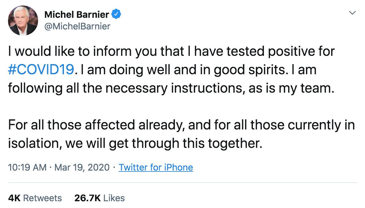 | What's Happening? The global crisis has made its mark on Brexit. With most of Europe in lockdown, the coronavirus has finally struck at the heart of the Brexit negotiations. On Thursday, the European Union's chief negotiator, Michel Barnier, said he had tested positive for Covid-19. The 69-year-old said he was in good spirits, and both Downing Street and European Council President Charles Michel wished him well. Barnier's announcement adds to the squeeze on the already compressed timetable to reach a deal. Trade talks had already been stalled because of the coronavirus and, as Bloomberg's Ian Wishart reports here, officials aren't optimistic they can make much progress by video conference. As everyone who's been working from home this week is finding out, technology has its limitations. So Boris Johnson is coming under pressure to delay Britain's final parting from the bloc due at the end of this year. Will he? In public, the prime minister is dead set against the idea. At a press conference on Wednesday, he dismissed calls to extend the transition period. Both sides have exchanged draft trade agreements, and negotiations are still continuing. This may all be a pantomime. After all, Johnson vowed in 2019 never to delay Brexit—then did just that. But he has until June to make a decision, and could be hoping the coronavirus will have peaked by then. In the meantime, though, his hand may be forced: A prime minister only has so much bandwidth, and public opinion may not look kindly on a leader distracted by a divisive political project. There is another possibility. The virus will give Johnson space to quietly pursue what may be his real goal: leaving the EU without a deal. Voters aren't fussed about extending the transition period in the same way they were about Brexit, as research by Professor Tim Bale suggests. That lack of public interest could be his opportunity to secure an "Australia-style" trading arrangement—or what used to be called a hard Brexit. – Edward Evans A reminder: While the global coronavirus pandemic rolls on the Brexit Bulletin will be published weekly, every Thursday. Beyond Brexit We're tracking the latest on the coronavirus outbreak and the global response. Sign up here for our daily newsletter. Want to keep up with Brexit? You can follow us @Brexit on Twitter, and listen to Bloomberg Westminster every weekday. It's live at midday on Bloomberg Radio and is available as a podcast too. Share the Brexit Bulletin: Colleagues, friends and family can sign up here. For full EU coverage, try the Brussels Edition. For even more: Subscribe to Bloomberg All Access for our unmatched global news coverage and two in-depth daily newsletters, The Bloomberg Open and The Bloomberg Close. |