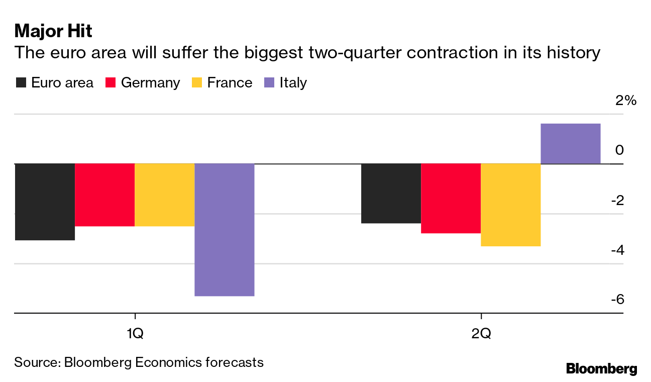 | Welcome to the Brussels Edition, Bloomberg's daily briefing on what matters most in the heart of the European Union. As Europe braces for what may be the steepest recession in living memory, its governments are preparing measures that would be unthinkable a couple of weeks ago, including multiple parallel credit lines with the region's bailout fund. Even joint debt issuance is becoming less of a taboo. Over a video call later today, EU finance ministers are expected to sign off on temporarily scrapping the bloc's budget rules, paving the way for the enormous spending needed to cushion the fallout from the coronavirus pandemic. And all that while Europe's most experienced crisis-fighter, German Chancellor Angela Merkel, is in self-quarantine after a doctor who vaccinated her tested positive for Covid-19. —Nikos Chrysoloras What's Happening Emergency Measures | Spain's government will extend a nationwide state of emergency, Germany prohibited gatherings of more than two people, Greece became the latest European nation to impose a curfew, and Italy banned all movement within the country and halted non-essential industrial activity. As the death toll from the deadly coronavirus keeps rising, restrictions put in place to hinder its spread are becoming more and more severe. Video Vantages | EU foreign ministers will substitute a planned meeting in Brussels that was to include a video conference with U.S. Secretary of State Michael Pompeo with a video link-up among themselves today. On the agenda: the repatriation of EU citizens stranded abroad as a result of the coronavirus pandemic plus possibly chaos in Libya and Syria. Hospitals Crisis | Europe's famed public healthcare system is overwhelmed by the scale and — more importantly — the speed of admissions. At some Spanish hospitals, doctors and nurses resort to taping garbage sacks to their arms to shield themselves while they work to save an avalanche of patients fighting for breath. They've run out of disposable coats. Polish Campaign | Polish President Andrzej Duda has rarely been busier than since he suspended his election campaign and called on rivals to follow suit amid the coronavirus outbreak. While Duda has repeatedly appealed to citizens to stay at home and touted the merits of social distancing, his visits to places affected by the virus appear to help his popularity, ahead of a May 10 ballot. In Case You Missed It Russia to the Rescue | A phone call with Italian Prime Minister Giuseppe Conte spurred Russian President Vladimir Putin to rush a consignment of medical equipment to Rome on Sunday night. With Italy still rankled by the response of EU leaders in the initial phase of the virus outbreak, the aid pouring in from Russia and China risks encouraging divided loyalties when the immediate crisis subsides. Chinese Reach | After showering Europe with medical supplies, China's mass deployment of aid to fight the virus has reached Africa. Amid global complaints about the absence of American leadership, this display of soft power may pay off for Beijing when the crisis is over. Supply Disruptions | At a time when it's tough to find some basic things, like eggs, in supermarkets in major European cities, companies that source food for restaurants and hotels suddenly have a lot of product they can't sell. We're talking about tons of unsold food. Ventilator Support | The German government asked its auto giants to consider producing medical equipment such as masks or ventilators. The request forms part of wider efforts by authorities to tap engineering and production resources and tackle severe supply bottlenecks in critical medical equipment. Brussels Effect | If you are looking for a break from the storm of virus news, take a moment to read Aoife White's handy explainer of the Brussels Effect — how the EU's regulatory machine sets the rules that the entire world follows. Chart of the Day The euro-area economy is due to suffer the worst performance in its two decades of existence in the first half of this year, according to Bloomberg Economics. While no amount of state support can prevent a collapse in output, failure by governments to act to cushion the impact of the virus-induced recession could put the euro's survival at risk, according to Bloomberg Economics. Today's Agenda All times CET. - 11 a.m. EU foreign ministers hold video conference, to discuss geopolitical implications of the coronavirus pandemic, repatriation of EU nationals, the situation in Libya and Syria and its impact on EU's external borders with Turkey