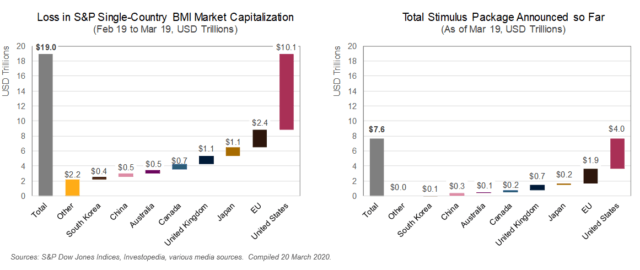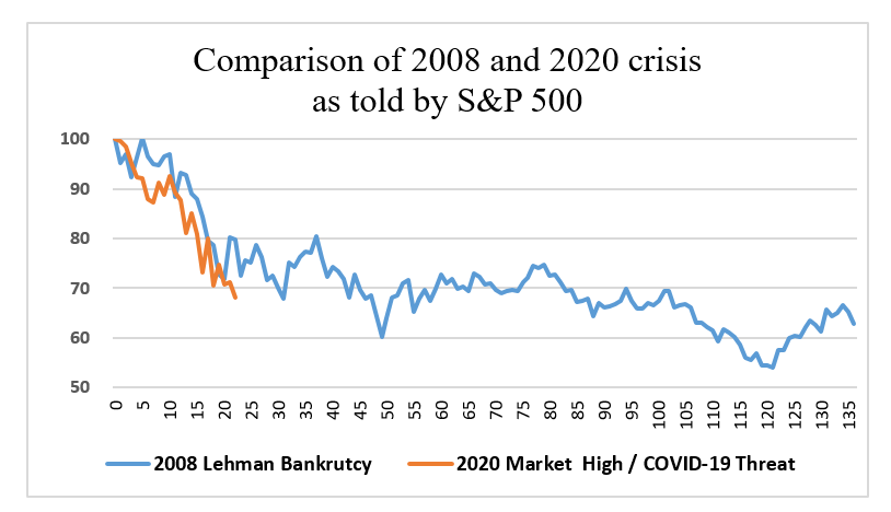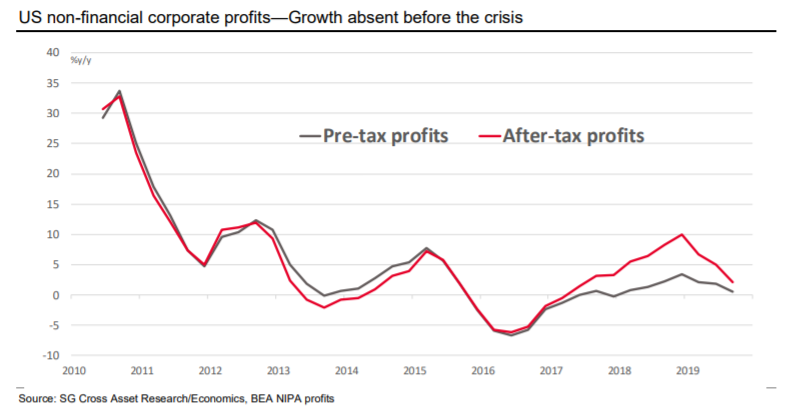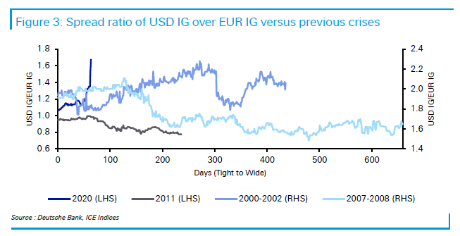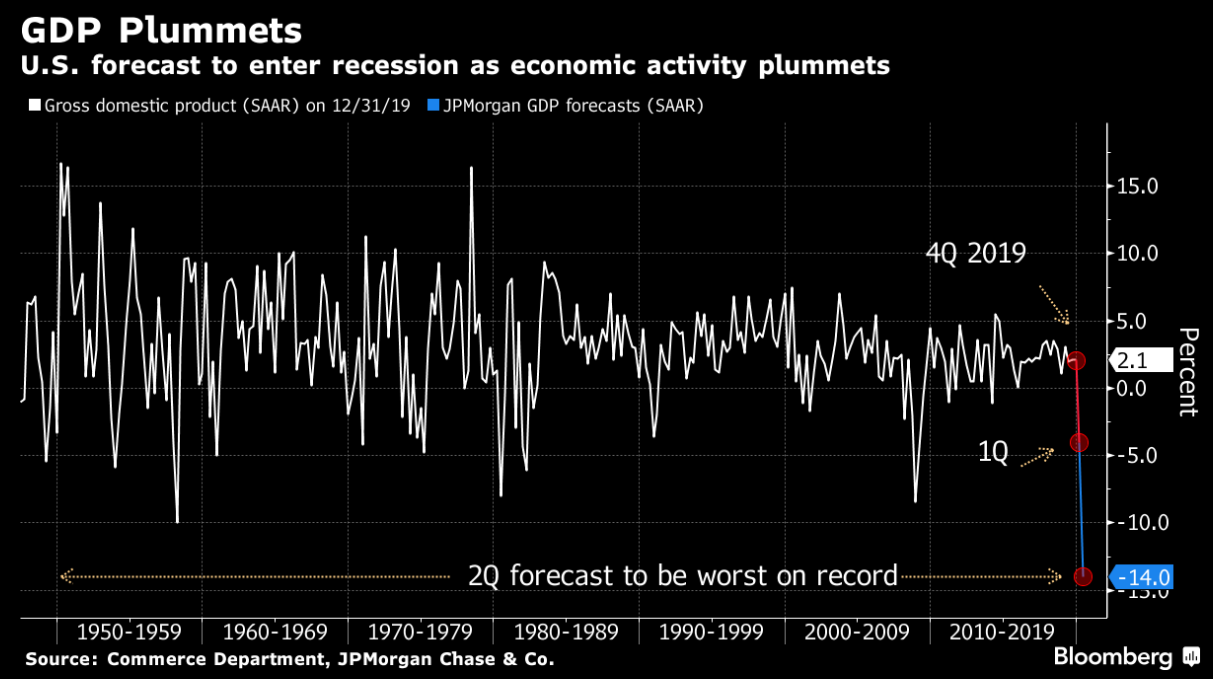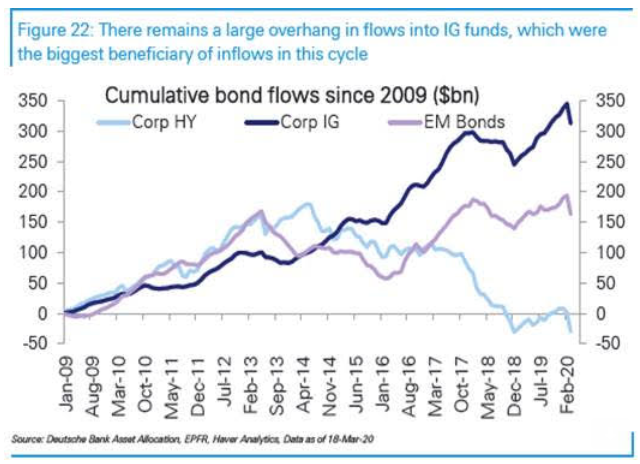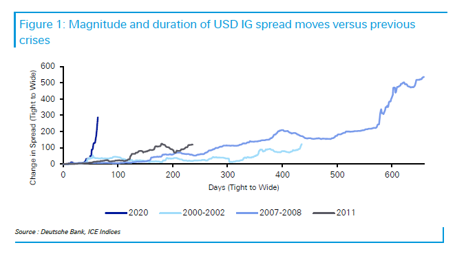 Journey Without Maps How are we going to navigate this weird period in which we find ourselves? The greatest drama that many of us can remember is playing out just as a large share of the developed world's population is forced to spend all their time indoors. Momentous decisions about the livelihoods of millions must be made often in claustrophobic conditions. Families become too close for comfort for some; and loneliness and isolation bite others. Those navigating, used to a place on the open deck and a telescope, find themselves cramped into the belly of the ship. The financial navigation problem remains intractable because most everything depends on the efforts of the public health authorities to limit the damage caused by the coronavirus. Depending on their success, anything could be possible, from a mild recession that's over by the end of the year to the worst global slump since the Great Depression. With so few precedents, quantitative asset managers used to charting their course with precision are suddenly left navigating usingmedieval sea maps decorated with sea monsters; they have sailed into the section that says "Here Lie Savages." What might offer some hope is that some of the numbers going around are outlandishly negative. James Bullard, president of the St Louis Federal Reserve, told Bloomberg on Sunday that the U.S. unemployment rate could reach 30% in the second quarter. That is horrifying and would afflict the world in ways hard to contemplate. Meanwhile, Wall Street is beginning to revise GDP estimates. This one, from JPMorgan Chase & Co., suggests that the second quarter will be by far the worst since the war: These developments are signs that a) the market is beginning to attempt to price in some very negative scenarios, and b) sentiment is already close to the bottom. For stock markets, and other risk assets, that is good news. Beyond the imponderable issue of fighting the disease, the key question is whether we can fend off a financial crisis. We should have some clarity within days and weeks. So as a navigation tool, I now offer a guide to our chances of avoiding a financial crisis, and then a guide to how the stock market is likely to deal with whatever results. A Route Through the Credit Crisis Could the public health crisis turn into a credit crisis? The crucial question, as one ETF manager once put it to me in terrible French, is: "Cherchez la leverage." If there is leverage, then there is the risk of losses that cascade through the system. Unfortunately, it isn't difficult to find. As I detailed here, there is more leverage in the global system now than in 2007; banks have de-levered a bit, but governments and non-financial corporations have taken on huge extra sums. This chart, from Deltec, shows the increase in U.S. corporate debt, particularly at lowest investment grades, since 2008. Further, U.S. corporate profits have stagnated for years — and even after-tax profits are drooping again after their boost from the corporate tax cut at the end of 2017, as SG Cross Asset Research shows: So we have a clear solvency risk. If this is combined with a liquidity crisis, as investors try to retrieve money, then we have a full-blown financial crisis. As Deutsche Bank AG shows, there is indeed an extreme move to pull cash from fixed-income funds: Worse still, there could be plenty more where that came from, because money has flowed into investment-grade debt, and also into emerging markets debt, in recent years. The fact that high-yield funds had been relatively out of favor is, at this point, a positive: Anecdotal evidence of problems with liquidity is accumulating rapidly. Perhaps most alarming, Bank of New York Mellon Corp. has stepped in to plug a gap in its Dreyfus Cash Management money market fund, investing $1.5 billion. Without this, it would presumably have "broken the buck" — or dropped below the price of $1 per share that money market funds try to maintain to give the impression that they can be compared directly with bank accounts. Following post-crisis reforms, money market funds had to choose between being "government-only" or concentrating on highest quality corporate credit. The Dreyfus fund was in the latter category. In the current environment, it is now deemed high-risk. Investors pulled out more than half the fund's total assets in less than a week (as was first reported by Ignites, a Financial Times news service). Goldman Sachs Group Inc. faced the same issue, even as the Federal Reserve started its effort to backstop money market funds once more. These events bring back memories of September 2008, when the Reserve Fund, an independent group that didn't have a big bank like BNY Mellon or Goldman behind it, broke the buck and froze redemptions. It was holding Lehman Brothers bonds. That led to what was effectively an institutional bank run, and forced the Treasury to resort to the Troubled Assets Relief Program, or TARP, which was announced the next day. The fact that we are even talking about money market funds again — both in the U.S. and in Europe — suggests the risk of liquidity strains creating a financial crisis are high. Another reason to fear a credit crisis is the speed with which investment-grade spreads — the extra amount in yield that they pay compared to Treasury bonds — have risen. As this chart from Deutsche Bank shows, this credit incident has happened far more swiftly than in previous crises. Deutsche also points out that the move has been far more aggressive in the U.S. than in the euro zone, which is probably due to the European Central Bank's efforts. This suggests that there is a case for the Fed also to take more aggressive action. Meanwhile, emerging market and high-yield debt are showing even greater signs of strain. The template for what could happen next was provided in 2008. If investors continue to withdraw from the markets in search of something more liquid, we could reach the point where banks and other len