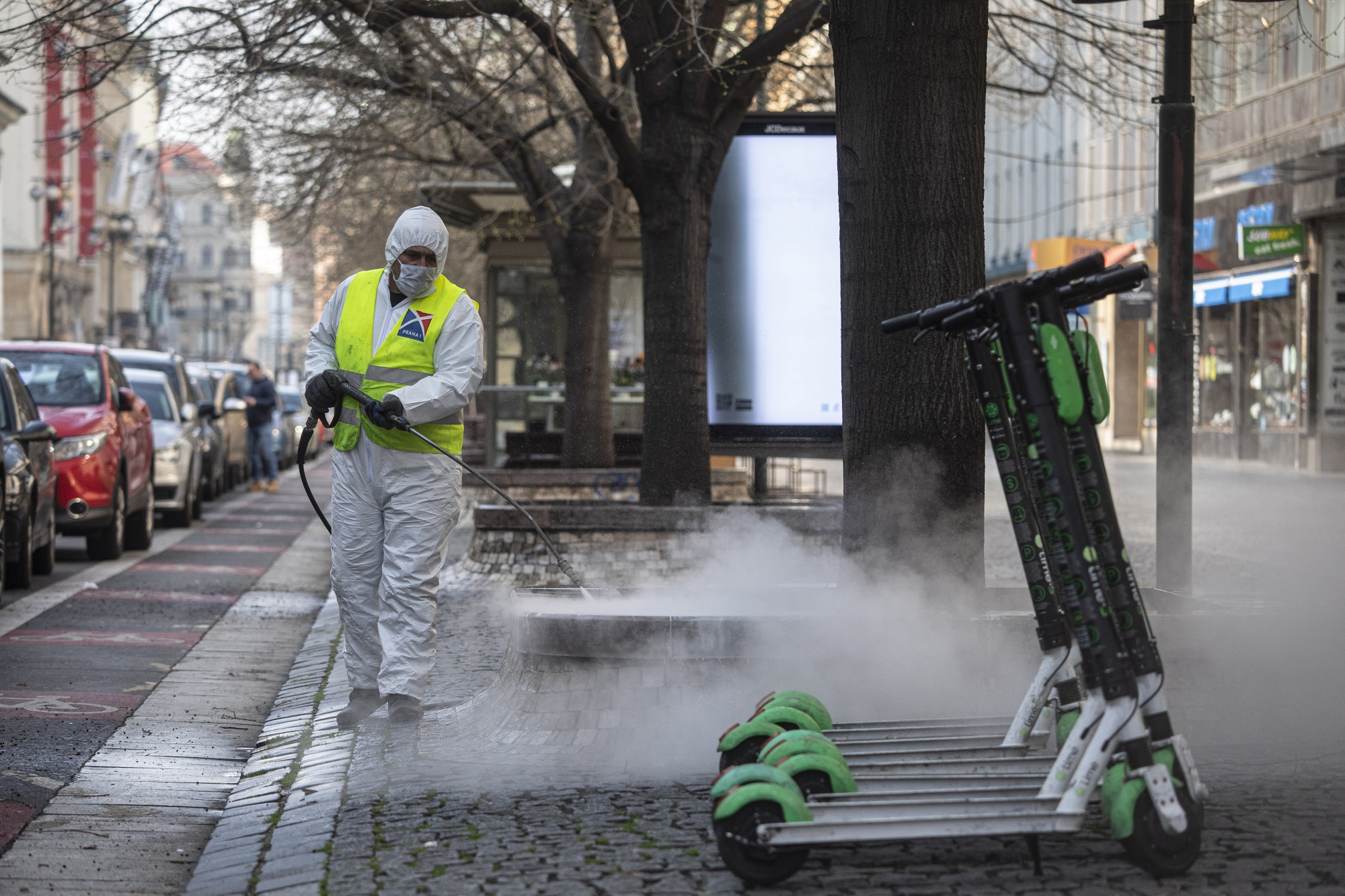 A municipal worker disinfects a street near electric rental scooters in Prague, Czech Republic, on March 18.