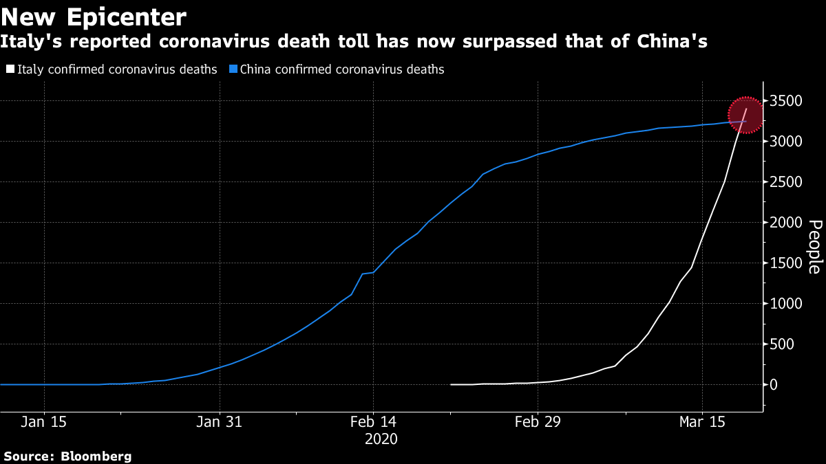 | Virus surge | With Europe now the epicenter of the outbreak, Italy surpassed China with the most coronavirus deaths, as fatalities reached 3,405. Despite the devastating impact on the economy, Prime Minister Giuseppe Conte said he'll extend a nationwide lockdown beyond the March 25 deadline. - Japan was one of the first countries outside of China hit by the coronavirus and now it's one of the least-affected among developed nations. Gearoid Reidy explains why this is puzzling health experts.
