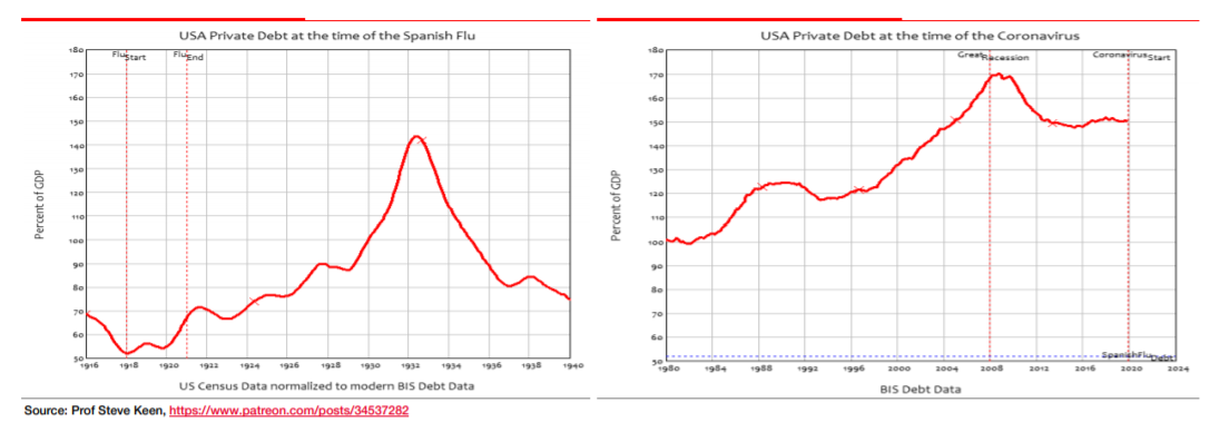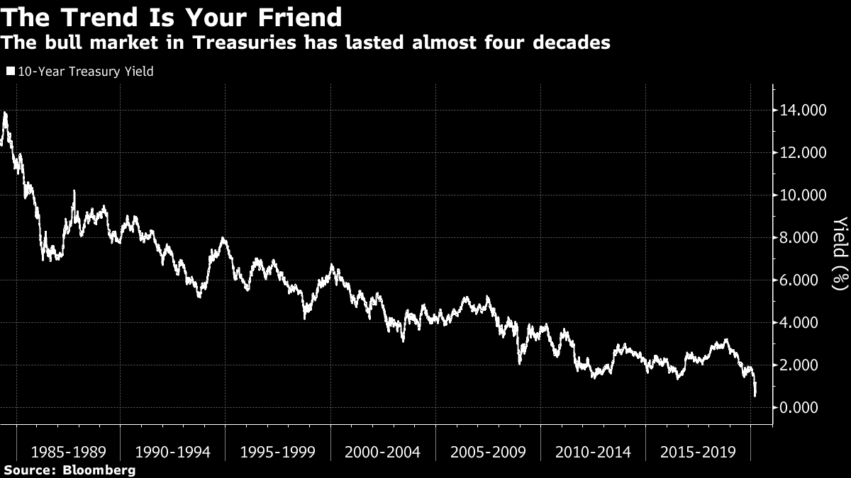 | Is the ice about to melt? For a decade many stubborn bears have refused to accept the long-standing bull market in U.S. stocks. Now they are readying for the moment when they at last switch and recommend buying. As "perma-bears" have a bad press, let me offer two charts to show that their ideas aren't so ridiculous. First of all, the great bull market since 2009 is a strictly American phenomenon. Stock indexes for the rest of the world have recently dropped below where they were at the beginning of 2000 — the last two decades have looked like the protracted range-trading that bears expected after the dot-com bubble burst, and not like a bull market at all: Further, the bears also — quite logically — expected a bull market in bonds. That we have had in spades. The long-term downward trend in 10-year Treasury yields has appeared to be interrupted on several occasions, and plenty of people were prepared to call a new secular bear market in bonds a couple of years ago. But the downward trend persists, and is one of the most remarkably reliable phenomena in modern finance: So, the argument goes, we should avoid the distraction of the great performance by American stocks in the post-crisis decade, and look at the message coming from bond markets the world over, and from equity markets outside the U.S. These add up to what Albert Edwards, one of the most famous "perma-bears" and the current chief investment strategist for Societe Generale SA in London, dubs an "Ice Age." Following Japan, the idea is that the world will sink slowly but steadily into a deflationary slump. Bond yields fall ever further, but this isn't good news for stocks, because these are a symptom of a deflationary environment, or "Ice Age," that kills opportunities for equities to make money. Europe has joined Japan in its own Ice Age over the last decade, but defiant action by the Federal Reserve and — even bears should admit — a few remarkably successful American companies kept things warm in the U.S. Until, suddenly over the last month, bond yields dove to fresh lows, and stocks fell into a bear market. Many will say that this doesn't constitute vindication for Edwards and his team. Indeed, Edwards doesn't deny that his call proved way too early — and that on Wall Street or in the City, that is the same thing as being wrong. Buying the U.S. stock market on March 9, 2009, and holding it until Feb. 19 of this year (still only a month ago), would have been a better call. He also has to confront the widespread belief that this stock market crash doesn't even prove the bears right, because it rests on the unpredictable appearance of what now appears to be the world's worst pandemic in a century. We approach a fascinating juncture. His call has always been that the Ice Age would end with American yields joining bund yields in negative territory, stock markets back to their 2009 lows, and the economic situation so desperate that governments have no choice but to change tack so dramatically that they create inflation. At that point, stocks would become a far better bet than bonds and the world would embark on a new direction. It struck me that the moment when the ice melts could be getting close. When I phoned Edwards to ask him this, I discovered that he was wrestling with just this question, and on Thursday he published a piece in which he did, indeed, predict that the end of the Ice Age could be imminent. (Full disclosure — possibly because of our chat, I am one of a number of people who get a name-check in his piece, which is worth reading, and can be found behind the SG paywall here). His reasoning is fascinating for bulls and bears alike. He remains convinced that the scale of the downturn now is due to the build-up of debt that preceded it. The coronavirus turns out to have been the trigger for a debt reckoning that would have happened at some point: leverage was built up on the premise that nothing bad happens. And something very bad has now happened. Hence many of us believe that central bank actions over the last decade have made the current already bad situation much worse than it otherwise would have been. This is how he summarizes what he had expected to bring the end of the Ice Age (in the era pre-coronavirus): I expected the anger of the populace and the populism it would engender would bring a transition in economic policy away from the increasingly discredited Quantitative Easing (QE), which I believe actually did very little good (in reviving the economy), but much bad (in that it exacerbated wealth and intergenerational inequality - helping to drive the rise in populism). Instead of more QE, I wrote that some variant of Helicopter Money such as the increasingly fashionable Modern Monetary Theory (MMT) would be adopted in some shape or form. It would in effect be the monetisation (of rapidly increasing public sector deficits) in all but name. It would not be announced with great fanfare. It would just be done. It looks to me as though he is in the process of being proved right about this. With Republicans in Congress anxious to send out checks to all Americans, and Angela Merkel ready to expand the German deficit, it seems as though the case for helicopter money has suddenly become almost the undisputed orthodoxy. And that lines up with the Edwards belief that the regime would be "such a major event that it can only be implemented during a crisis." The crisis is here, and the synchronized use of fiscal and monetary measures has, in Edwards' words, begun to cross, if it hasn't already, the Rubicon. "It was going to happen anyway, but it has come sooner than we expected. What now for The Ice Age?" Don't worry, Edwards is still not wildly positive. His reading of the coronavirus crisis is dire indeed. He cites the following charts, from the iconoclastic U.K.-based economist Steve Keen, which contrast U.S. indebtedness during the Spanish flu of a century ago with indebtedness today. The world was still