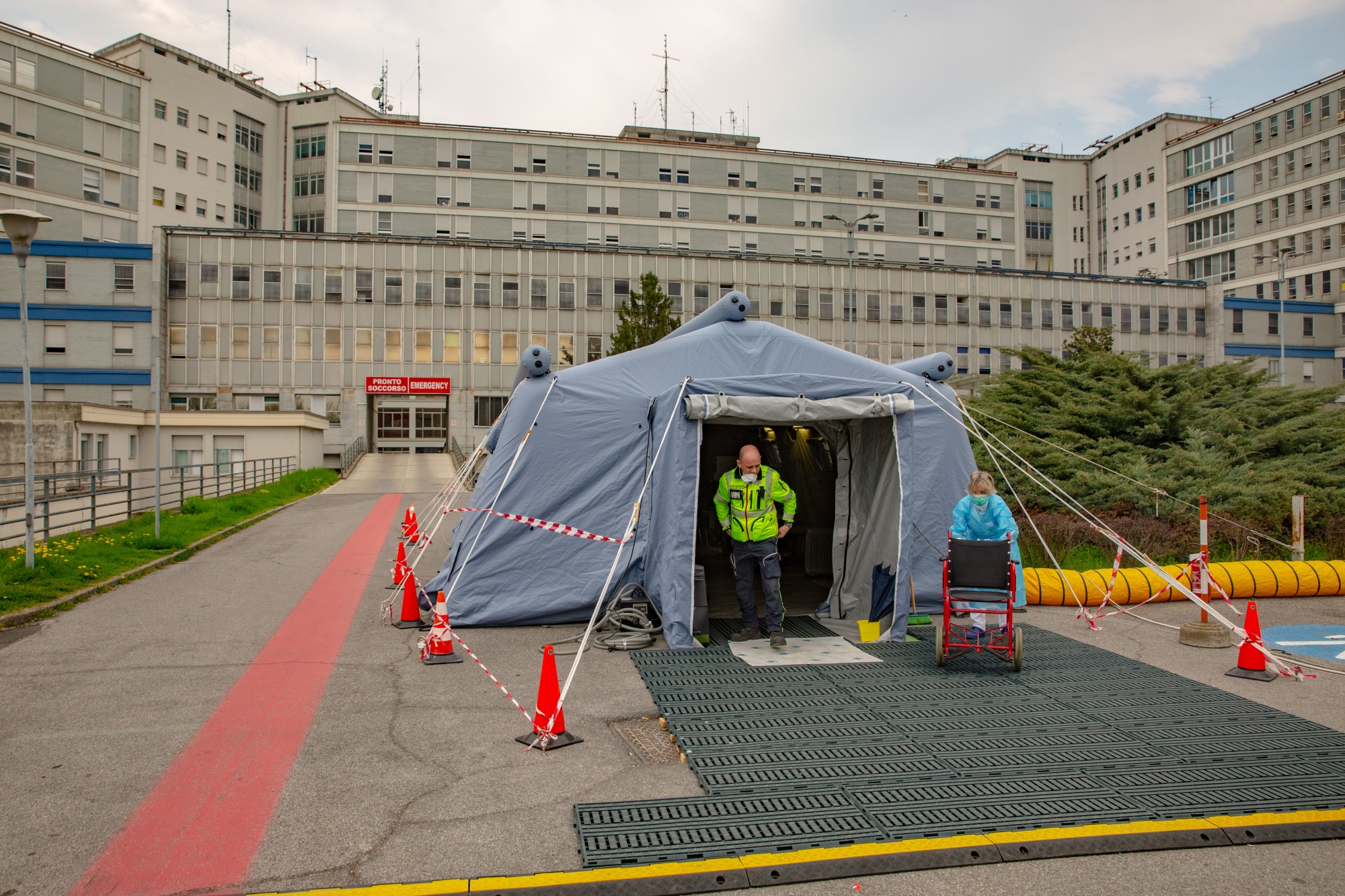 A tent stands at the entrance to the hospital in Cremona, Italy, on Friday, March 20.