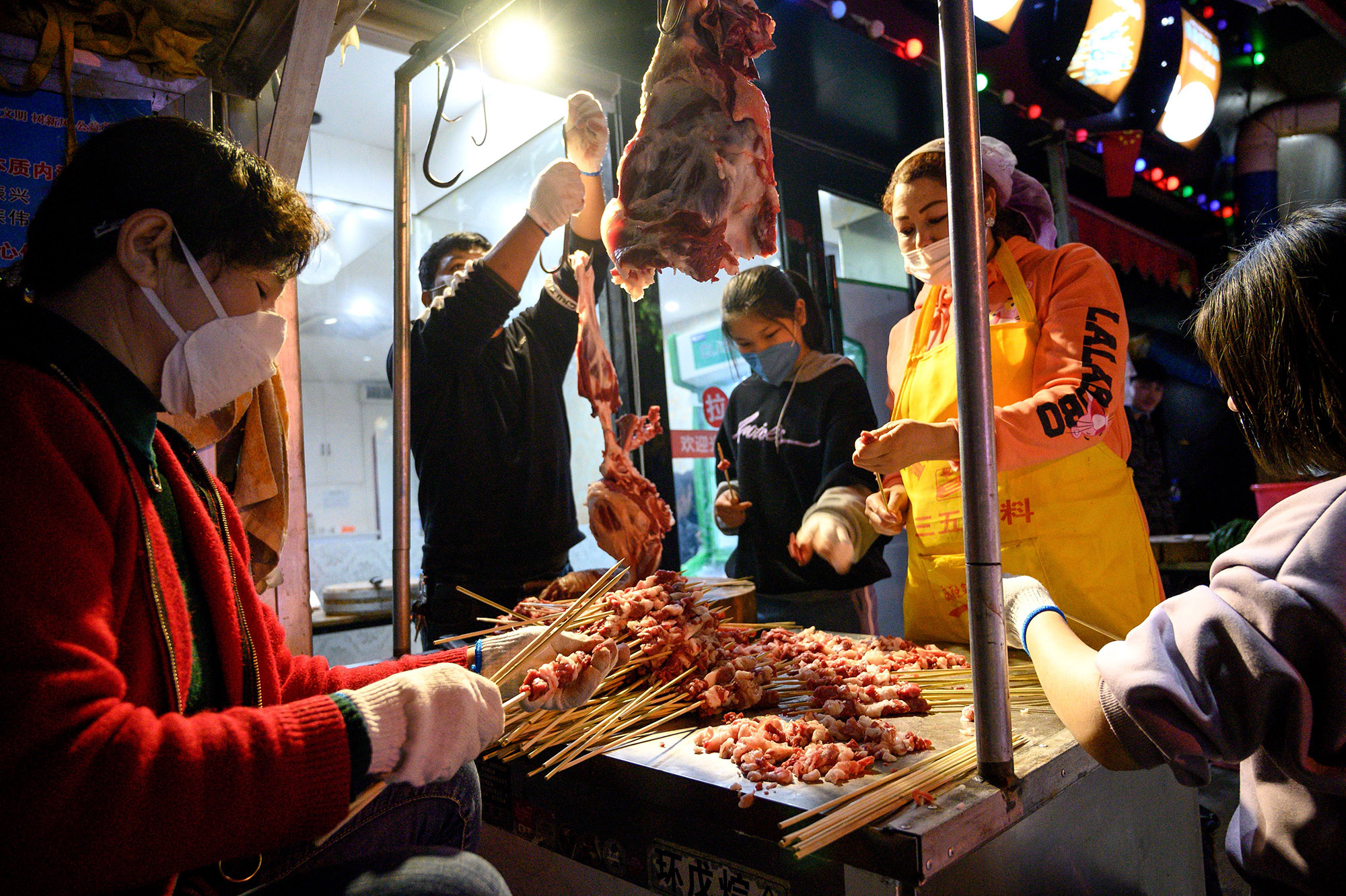 Workers wearing facemasks make a barbecue at a market in Wuhan in China's central Hubei province on April 4.