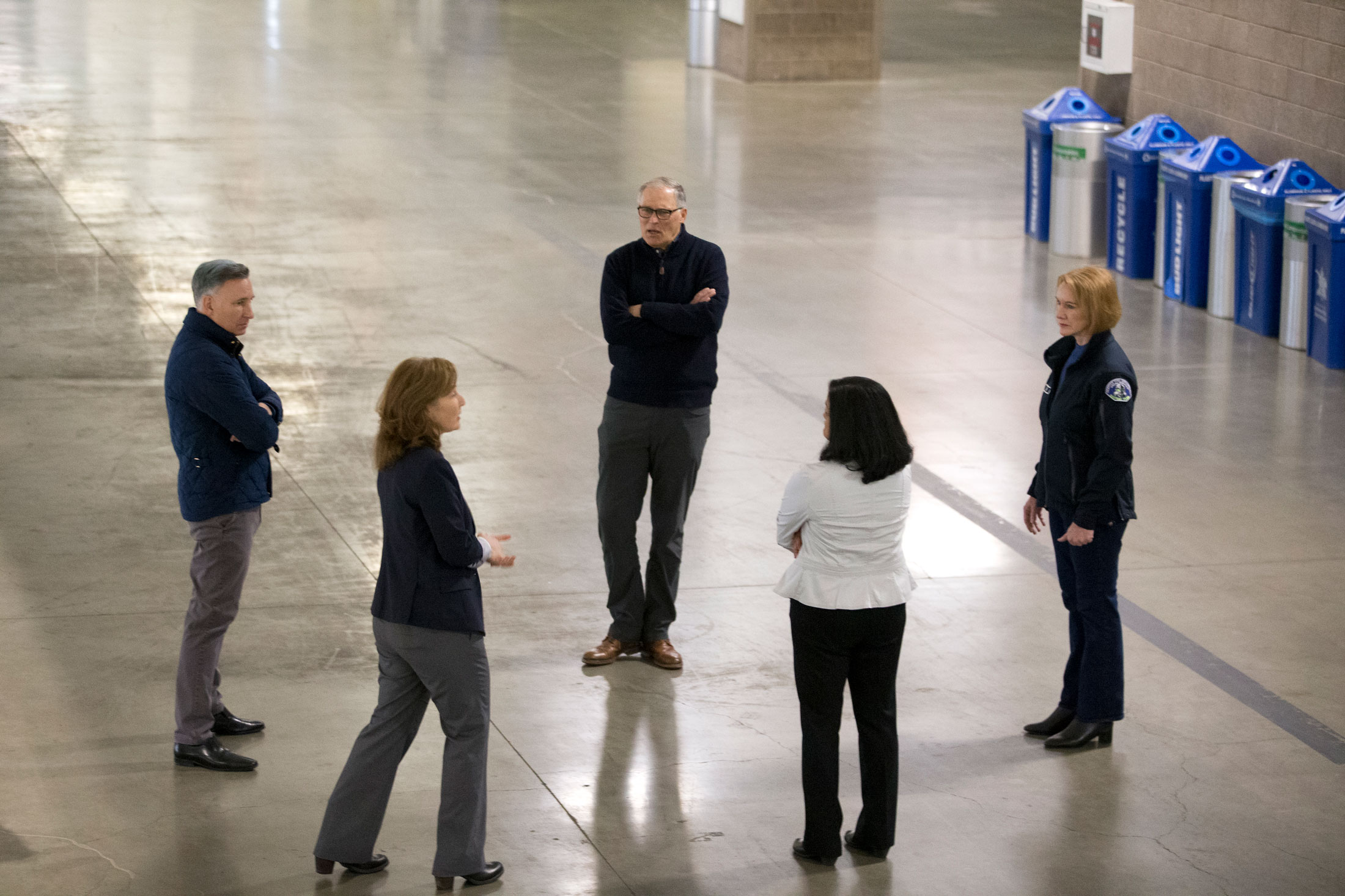 Washington Governor Jay Inslee, center, after a press conference on March 28 in Seattle.