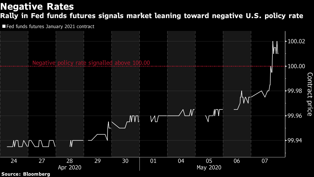| Chinese researchers are looking into the rate of coronavirus reactivation. May is the time to buy, according to a money manager whose stock fund has climbed 52% in 2020. And Tesla suspends production in its Shanghai factory. Here are some of the things people in markets are talking about today. Among recovered Chinese Covid-19 patients, about 5% to 15% may have tested positive again, a study found. The rate of reactivation in China varied from place to place, with some regions showing less than 1% of such cases, according to Wang Guiqiang, director of the department of infection at the Peking University First Hospital. Wang disclosed the figures during a press conference held by China's National Health Commission on Thursday. Wang said most of the patients who have tested positive again have yet to show any symptoms, and finding the reason for the reactivation will take more work. The findings go some way to confirming a growing fear of re-infection in recovered patients in China, where the virus first emerged last December. Elsewhere, Moderna surged the most in more than two weeks after the company said its experimental vaccine would be in late-stage studies by early summer, and Japan approved Gilead's remdesivir to treat the novel coronavirus. In the U.S., cases rose 2.4%, matching the one-week average. Here's how Bloomberg is tracking the pandemic. And for countries looking to Taiwan's stellar containment efforts as a model to follow, this is how the island got a head start on smashing the virus. Asian equities were poised for a mixed start Friday ahead of a key U.S. employment report that's set to highlight the unprecedented depth of job losses from the coronavirus shutdown. Treasury yields and the dollar fell. Futures edged higher in Japan, fell in Hong Kong and were little changed in Australia. Earlier, the S&P 500 Index rose, with speculation mounting among equity investors that the worst of the economic hit has passed as more of the U.S. opens. Filings for unemployment continued at historically high levels, but fell from the prior week. The tech-heavy Nasdaq Composite turned positive for the year, wiping out losses that reached as much as 24% at the depths of the pandemic-fueled sell-off. Two-year Treasury yields plunged to a record low and 10-year rates fell toward 0.6%. Elsewhere, oil fell in a day of wild price swings as investors weighed supply-and-demand fundamentals against Saudi Arabia's global price hike. A Chinese money manager whose stock fund has climbed 52% in 2020 says May is no time to shy away from equities. Wang Rongxin, general manager of Beijing-based Rosin Asset Management, thinks a buying window is at hand. Key annual meetings of the country's top legislature are set to start in two weeks, and he says possible policies to emerge should fuel China's economic recovery following pandemic-related lockdowns. The Zhonggang Yinrun Private Equity Investment Fund, which launched in August, has benefited so far this year from bets in 5G, electric vehicles and pharmaceuticals paying off. It has averaged about a 75% allocation in stocks, but he said the fund could top 90% this month. Here's what Wang is interested in. Tesla suspended production at its plant on the outskirts of Shanghai, according to people familiar with the matter, bringing to a halt all of the company's vehicle manufacturing globally. The electric-car maker informed factory workers who were supposed to return to work Wednesday, after China's five-day Labor Day break, that their holiday would be extended and they will return as soon as May 9, sources said. The reason for the abrupt halt wasn't immediately clear. Chinese technology news site 36kr reported it was because of component shortages. While Tesla's only car factory outside the U.S. is expecting delays in receiving parts for its Model 3, it's also facing problems with a crucial piece of manufacturing equipment that's being fixed, according to the people. In these times of crisis, India's top companies are leaning on Japanese lenders for funding. From Mukesh Ambani's Reliance Industries to Tata Capital, the nation's biggest firms have raised a record 181 billion yen ($1.7 billion) from yen-denominated loans this year, helping them to tide over a crunch in the dollar market. With benchmark sovereign yields in Japan falling back below zero on increased stimulus from the central bank, the country's banks are hungry for higher-yielding assets. India's biggest companies are turning to them for relatively cheap money, as the coronavirus pandemic roils the economy. Access to overseas loans for refinancing is critical for Indian firms, whose offshore debt bill for this year comes to an unprecedented total of about $31 billion. What We've Been Reading This is what's caught our eye over the past 24 hours: And finally, here's what Tracy's interested in this morning They're he-ere! Negative rates have arrived in the U.S., with traders pricing Fed funds futures contracts at negative interest rates for what may be the first time ever. The only question now is whether that pricing indicates that traders actually believe the Federal Reserve will embark on a negative rates policy by early 2021, or whether the move reflects some sort of technical trading blip. The timing might give us some clues. The dip below zero happened soon after the U.S. Treasury announced a whopper refunding schedule, including many, many T-bills. You could make an easy argument, as the analysts over at JPMorgan do, that this was a classic case of a whole bunch of investors repositioning at once. Lending some credence to that theory is the fact that Fed Chairman Jerome Powell has repeatedly poured cold water on the idea of going negative — as recently as last week. The only Fed speaker to opine on the topic on Thursday was Richmond Fed President Tom Barkin, who also blasted the idea, saying "I haven't seen anything personally that makes me think [negative rates] worth a try here." On the o