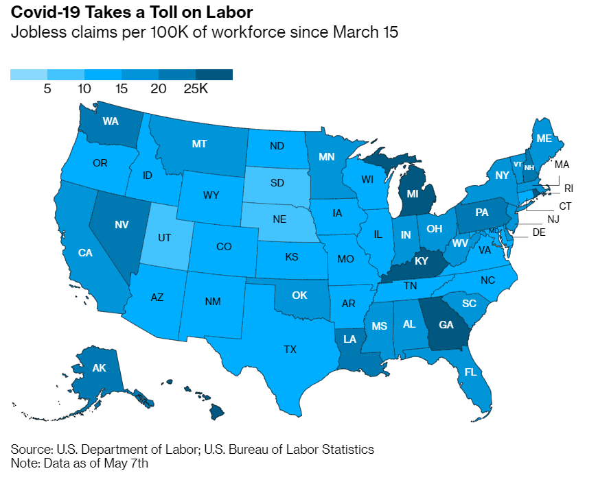 | Groups that were finally seeing real job gains a decade after the financial crisis are being hit especially hard by the coronavirus's fallout. Employment and wages had ticked up steadily for black and Hispanic Americans, for women, for workers over 65, and for those without a college degree. In 2019, unemployment was persistently low, and the "quits rate" showed workers were becoming confident enough to leave their jobs for new opportunities. Then came 2020. Bloomberg Businessweek reports that in the sudden economic downshift caused by Covid-19 precautions, the old saw of "last hired, first fired" is playing out on a mass scale across the U.S. People who had pulled themselves up a rung or two are being pushed back down, joining the 33 million Americans who have sought unemployment benefits. Worse yet, many employers are making layoffs permanent. —Philip Gray Did you see this? The fixation in some quarters of preventing welfare fraud does more harm than good. The number of Americans who are eligible but not receiving aid far exceeds the number who are receiving too much. Peru's pandemic response is saving the economy, and the credit goes to Maria Antonieta Alva, the 35-year-old finance minister appointed just seven months ago. The European Central Bank met its target for female representation among top managers. For lower tiers, it fell short. Europe's wealthiest man has lost more money in the pandemic than anyone else in the world. He's got a plan to bounce back. A judge tossed out a claim by women in U.S. soccer that they were paid less than men. The post-shutdown workplace will not be the same. Expect masks, fever screenings, half-empty open offices and plexiglass dividers between cubicles. We love charts Job losses during shutdowns are not evenly shared. Michigan, Kentucky and Georgia have suffered acutely. Infection for the greater good Could it be ethical for researchers to deliberately infect people with a deadly disease? Theoretically, infecting humans with Covid-19 in a "challenge study" would be a rapid way to test treatments, but until recently, scientists wouldn't even consider it unless a cure was handy. A United Nations report this week outlines some conditions that would need to be met in order to pursue such experiments: Participants would need to be healthy and 18 to 30 years old. Ideally, they would be individuals already at high risk of becoming infected. And researchers would need to take precautions to avoid targeting poor and vulnerable populations. Although billions of people are trying to avoid coronavirus infection, for this good cause, more than 14,000 have already volunteered. |