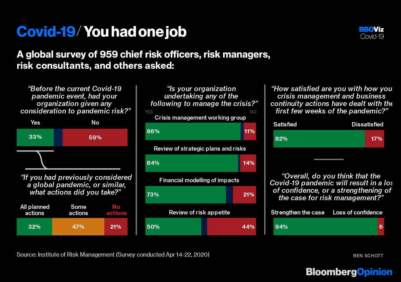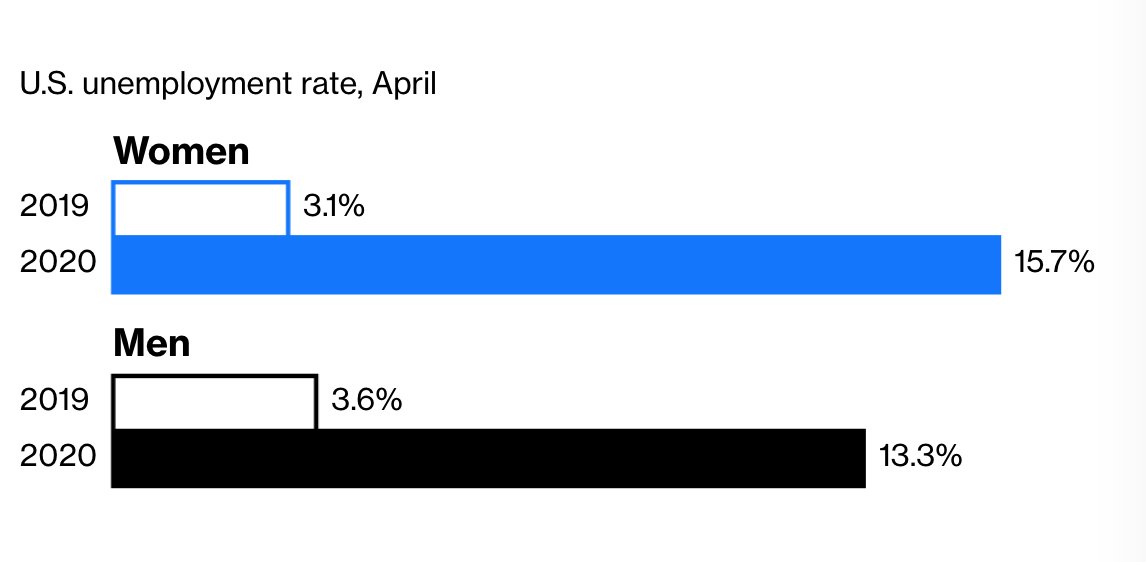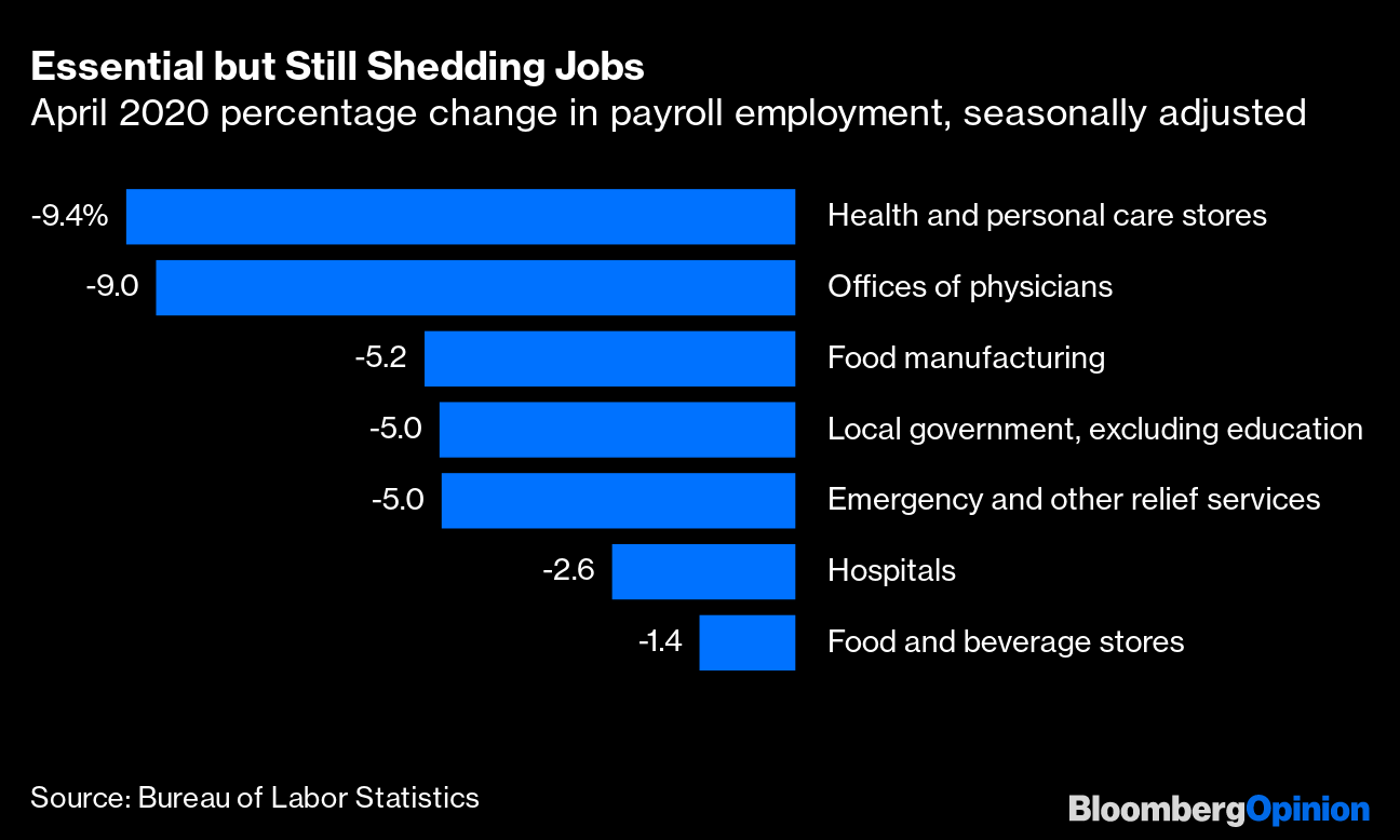 This is Bloomberg Opinion Today, an unemployment claim of Bloomberg Opinion's opinions. Sign up here. Today's Agenda Dark times. Photographer: JOHANNES EISELE/AFP/Getty Images This Is What Economic Collapse Looks LikeSome things are intensely awful no matter how much you prepare for them, such as jumping into icy water or listening to Nickelback. Today's jobs report was like that. Unemployment soared to 14.7% in April, the highest rate since the Great Depression. A record 20.5 million people lost their jobs, making all the employment growth of a decade-long expansion go *poof* in a month. We'd seen this coming; weekly unemployment claims have shown 33.5 million people losing jobs in seven weeks. Wall Street expected worse, in fact, and is already looking ahead to some imaginary recovery (or new Fed rescue operation, as Mohamed-El-Erian writes), so stocks naturally soared, which should at least keep makers of pitchforks and guillotines employed. But the numbers are still unspeakably awful and will keep getting worse; the report's survey period was in mid-April and didn't catch nearly all the misery. Most of the job losses are temporary for now, but that can't last much longer. What's clear is that the trillions of dollars Congress and President Donald Trump and the Fed have poured into the economy so far won't nearly be enough, Bloomberg's editorial board writes. Many of these programs expire in early summer, when we'll likely still be suffering depression-level economic pain. Weirdly, neither Congress nor the president seems all that energized about loading another round into the Stimulus Cannon, notes Jonathan Bernstein. Trump's approach to the economic disaster, and the coronavirus pandemic that started it, lately seems based on the assumption that ignoring a problem will make it magically go away. This is highly relatable, but no way to run a country. Trump's answer for now is rushing to reopen states from pandemic shutdowns that clearly aren't ready. This does have the benefit of saving some states a few bucks on unemployment payments, notes Noah Smith. Some have threatened workers they'll lose benefits if they don't return to dangerous jobs, in fact. But this won't help the economy and could even make things much worse by stretching out the pandemic, the lockdowns and the job losses. That's the last thing we want; at least ice baths and Nickelback songs are over relatively quickly. Bonus Job-Pain Chart: Only warehouses, where all the stuff we're buying now is stored, hired substantially in April, notes Justin Fox. Other essential industries were slashing jobs: Women Bear the BruntOne of the freakiest features of April's jobs report was that average hourly wage growth jumped. This isn't what you'd expect in a nascent depression! But it was unfortunately just a sign of how much the layoffs were concentrated in low-wage jobs. Like the pandemic itself, the economic pain is targeting America's most vulnerable populations, particularly women, write Elaine He and Nicole Torres, with a series of infuriating charts. More women are considered essential workers than men, but they're also losing jobs at a faster rate:  At the same time, they're also more likely to be single parents of out-of-school kids, and they do more of the housework than their housebound husbands. Read the whole thing. Testing, Testing, TestingNone of this economic misery will abate until the country gets its Covid-19 outbreak under control, and a key to doing that will be adequate testing. As you may have heard, we still don't have it. Last month, Michael Lewis wrote about how the Chan Zuckerberg Biohub in San Francisco built a coronavirus-testing juggernaut, only to see it stall due to a shortage of basic materials such as swabs to jab up patients' noses. The lab has since scrounged up the needed equipment, with no help from the federal government. It recently tested hundreds of samples from one San Francisco neighborhood, and the results are already adding to our understanding of the disease. That the lab was able to test at all owes to a handful of people finagling swabs from China. Somehow America, the richest country in the world, has been unable to make such simple things as swabs and protective gear in sufficient numbers. This is because we long ago stopped building communities of manufacturing know-how, writes Dan Wang. Silicon Valley is the last example of such a place in this country. America must build many more of these if it hopes to be able to build stuff again. Meanwhile, the U.S. government is using a secret FEMA algorithm to tell states when they should reopen, writes Cathy O'Neil. This meets all of Cathy's tests of whether an algorithm is dangerous: It's important, secret and destructive. It's certainly not an example of American problem-solving know-how. Telltale ChartsThis one chart from Tara Lachapelle says everything about the entertainment industry these days: Netflix Inc. is bulletproof, while everybody else is hurting from a lack of sports, advertising and content production.  You might want to sit down for this, but risk managers haven't been doing so great at managing risk, writes Ben Schott.  Further ReadingEven in an unusually bad time, General Electric Co.'s numbers stand out as being particularly bad. — Brooke Sutherland Shutdowns have been a boon to Amazon.com Inc., but Shopify Inc. and other rivals are gaining ground. — Tae Kim Justice is finally served for Michael Flynn. — Eli Lake Iraq is still a basket case, and its unlucky new prime minister's best hope is for new elections. — Bobby Ghosh Russia has been increasingly provoking the U.S. and its allies. A flotilla sent to northern waters is meant to push back. — James Stavridis Argentina has handled the pandemic well, and it also has a chance to put off a debt reckoning. — Mac Margolis ICYMIMike Pence's press secretary tested positive for Covid-19. She's married to Stephen Miller. Internet giants are telling staff to plan to 